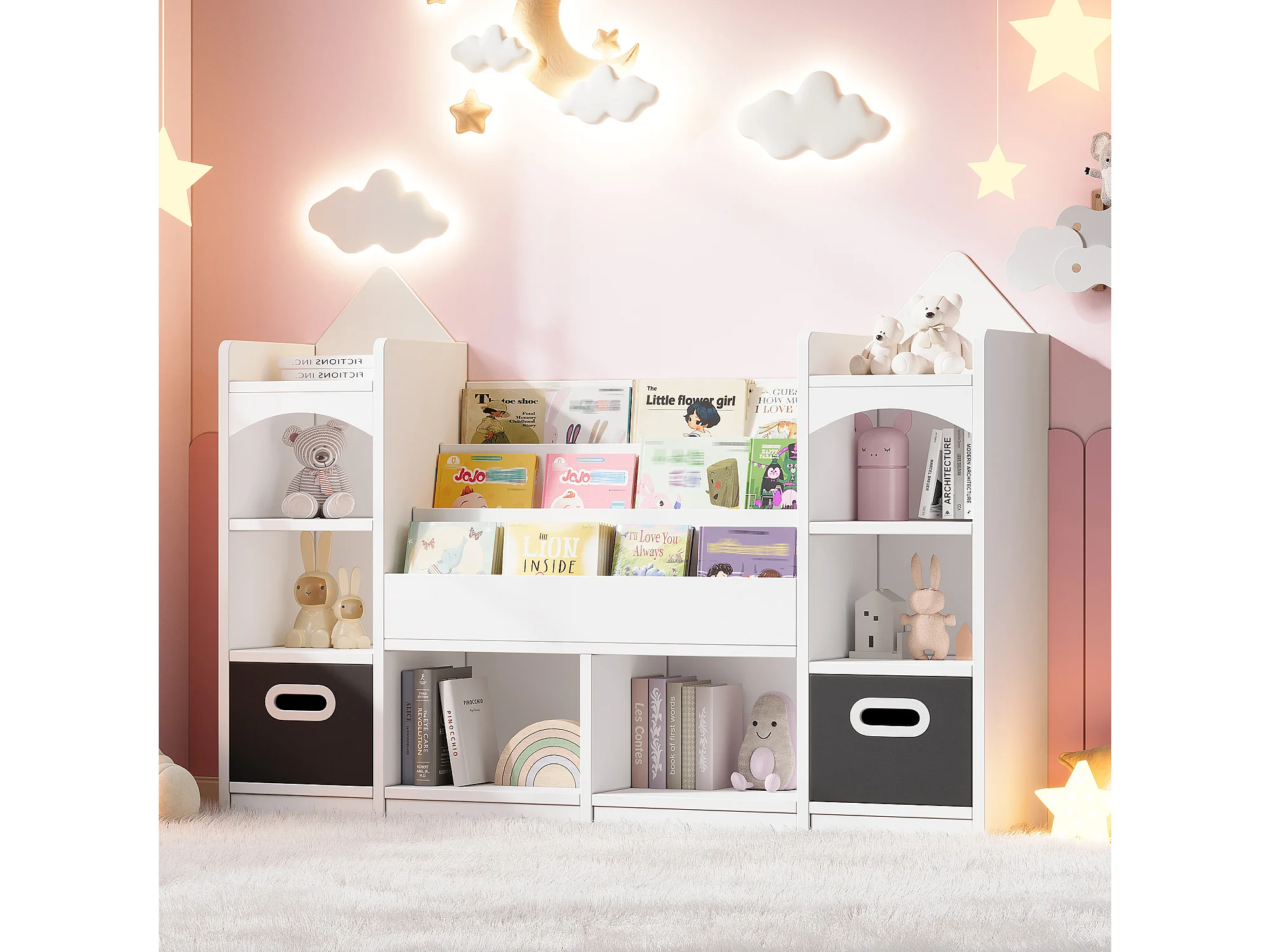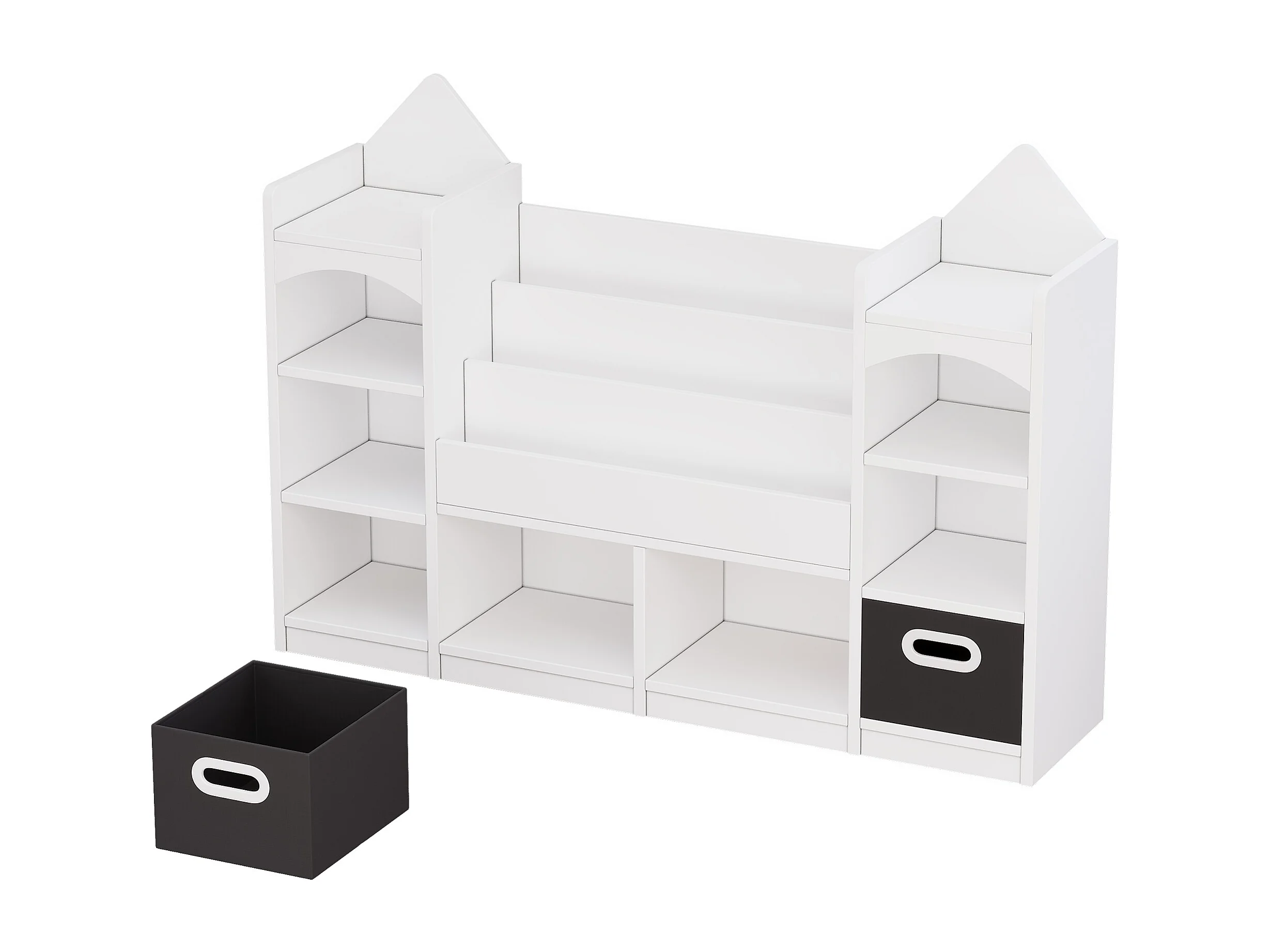 Kinder-Bücherregal / -Regal -130x30x90 cm - Mit 2 faltbaren Aufbewahrungskisten - Schloss-Muster - MDF - Weiß