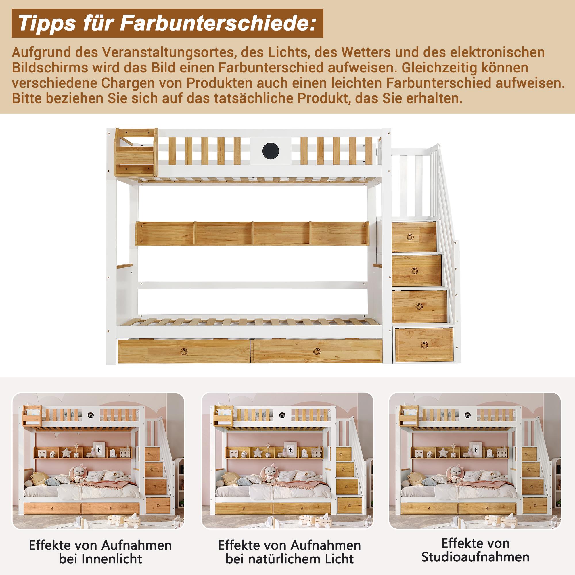 Kinder-Etagenbett - 2 x 90 x 200 - 2 Schubladen + 4 Stauräume in der Treppe - Kiefer und MDF - weiß