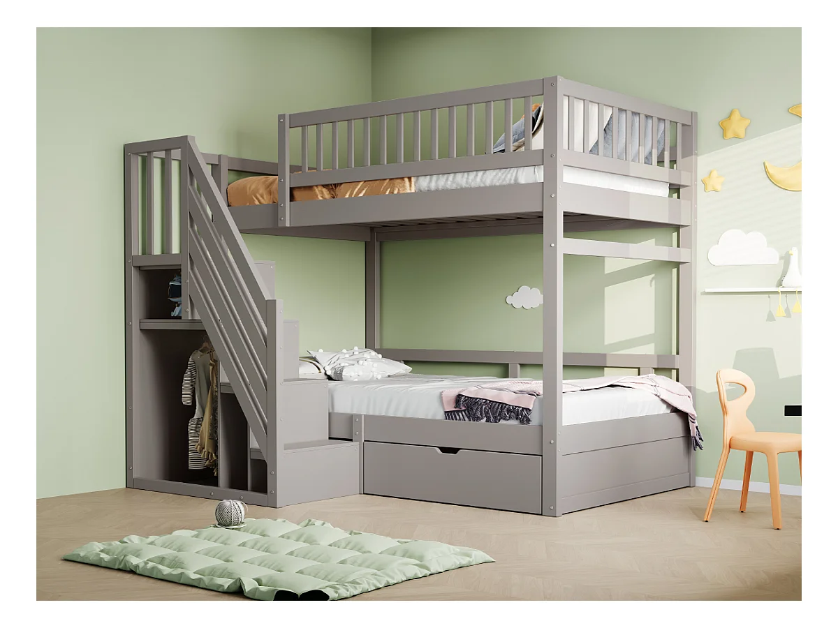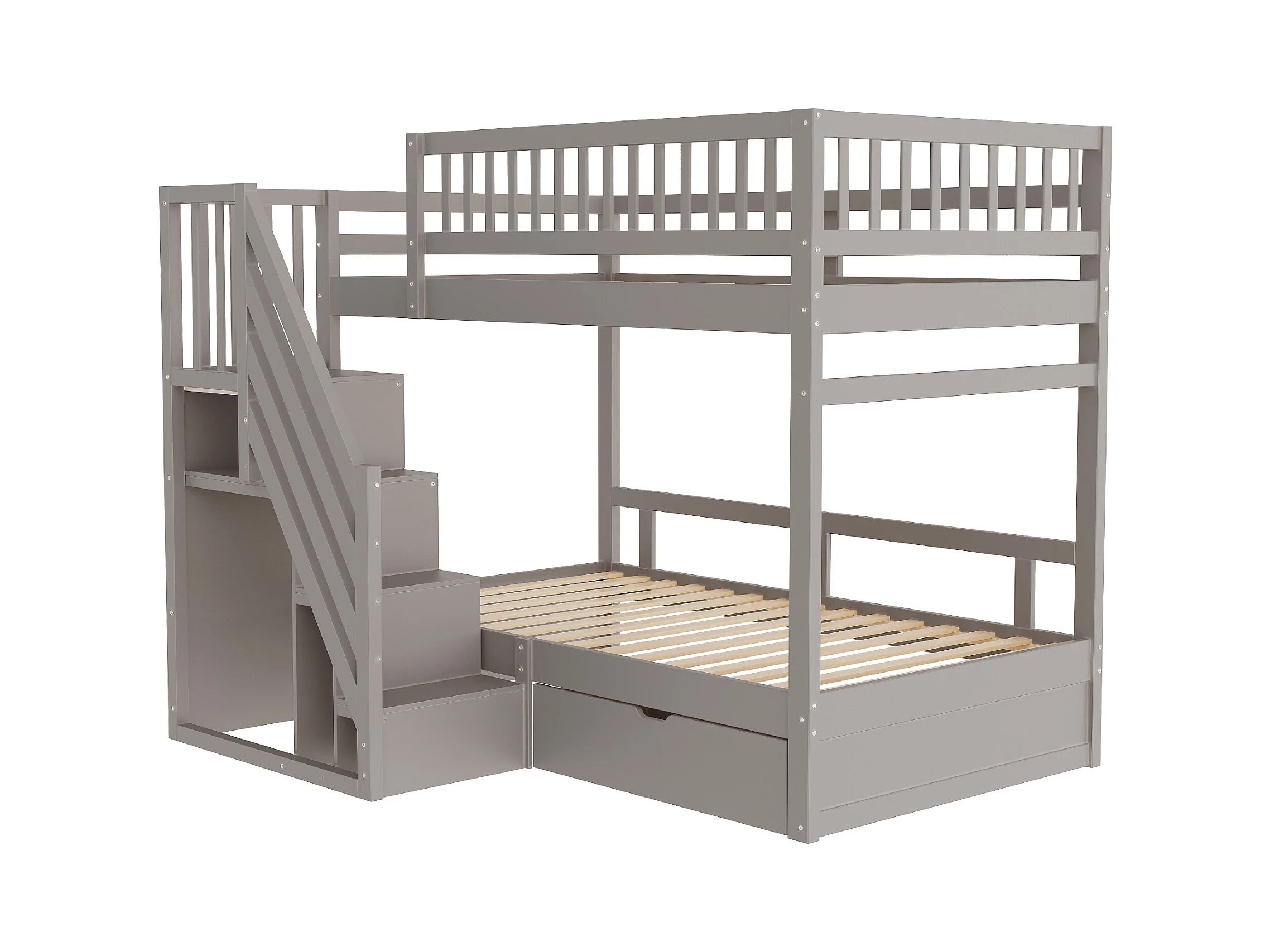 Kinder-Etagenbett - 2 x 90 x 200 cm - mit 1 Schublade + Treppenstauraum - Holz + MDF - grau
