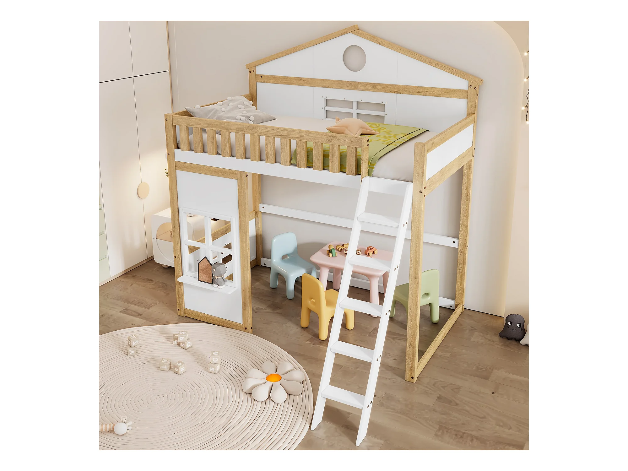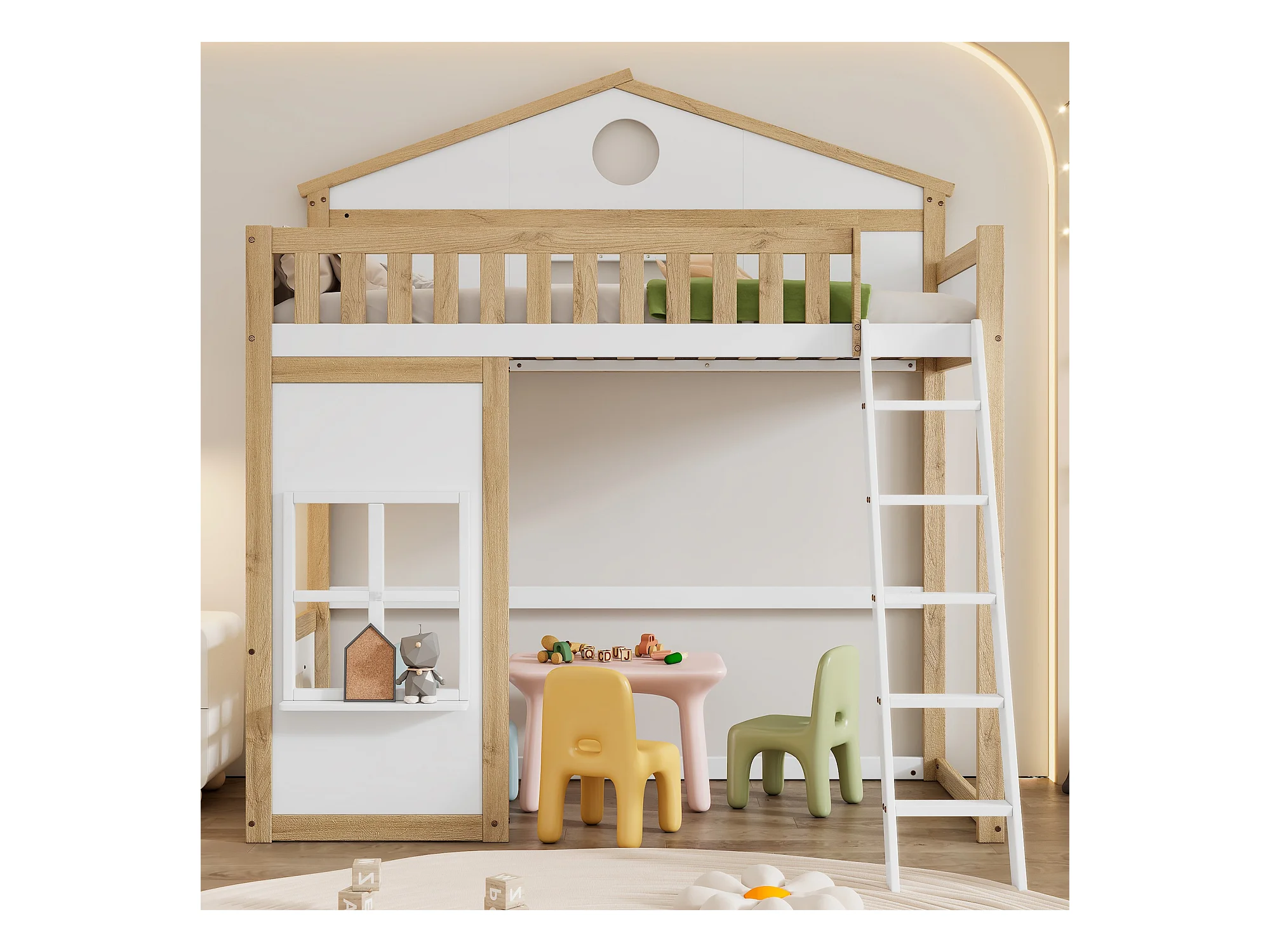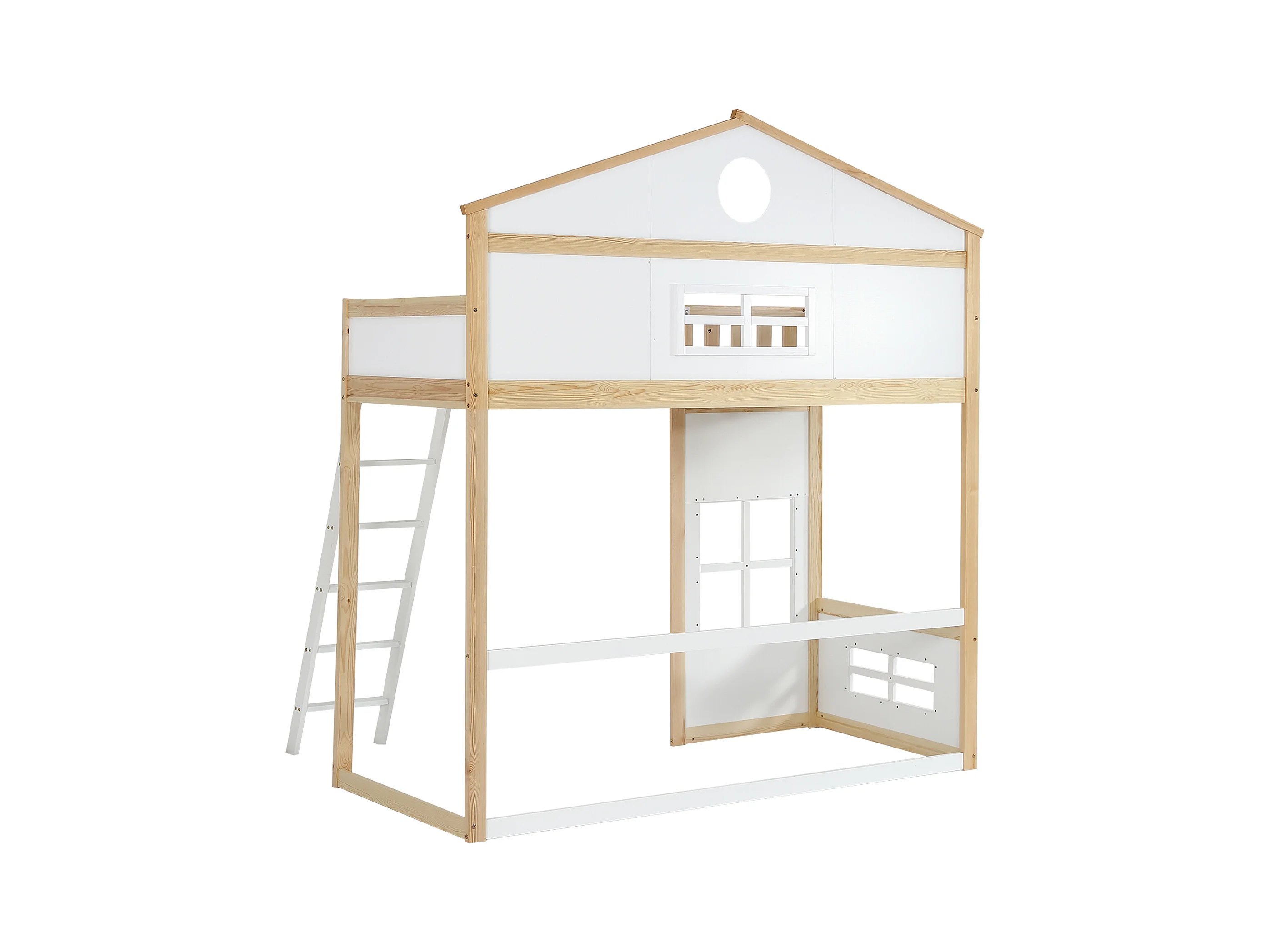 Kinder-Etagenbett, Einzelbett, mit Sturz- und Geländer, Dach und Fenster, weiß+naturfarben, 90x200 cm
