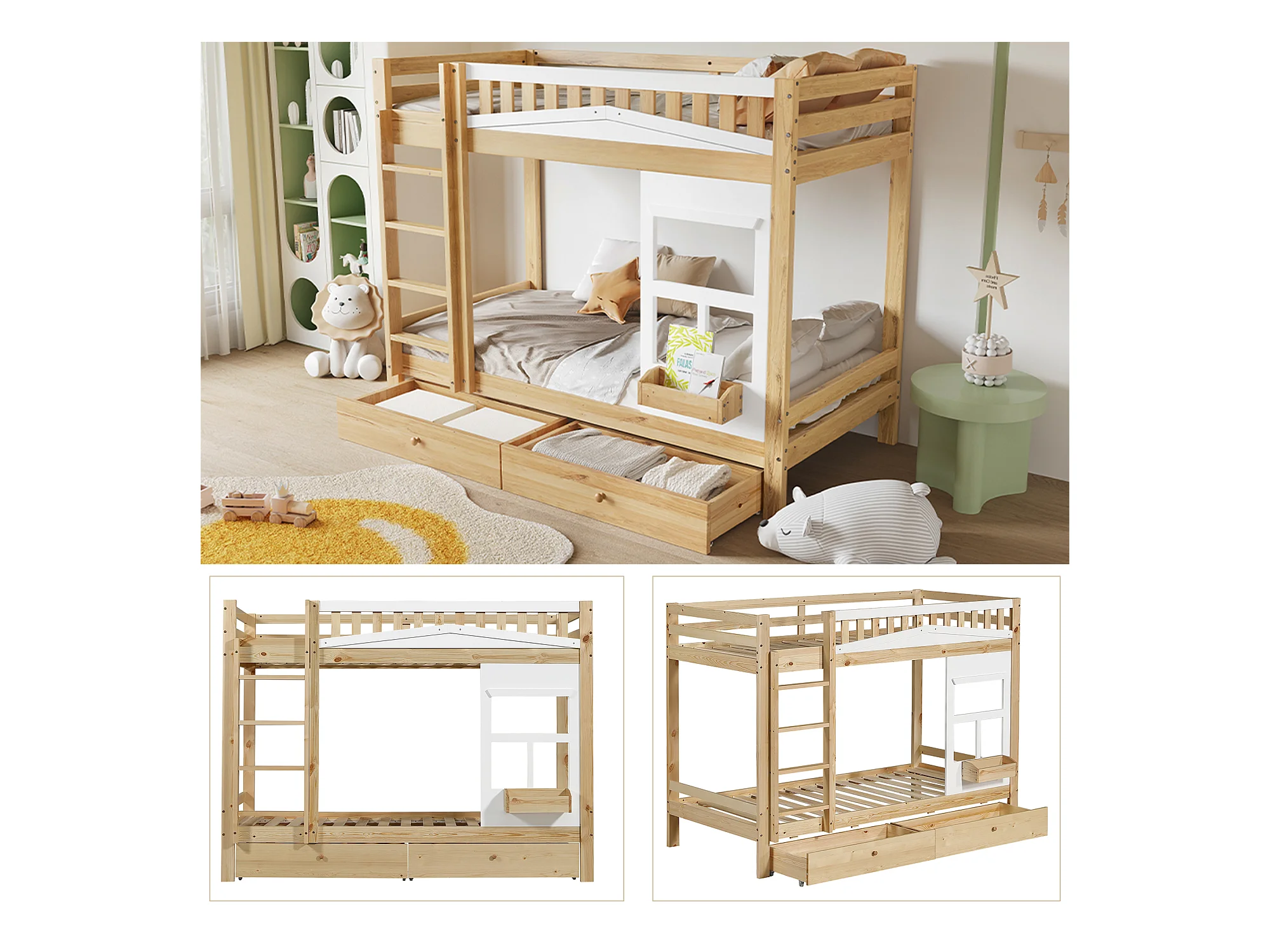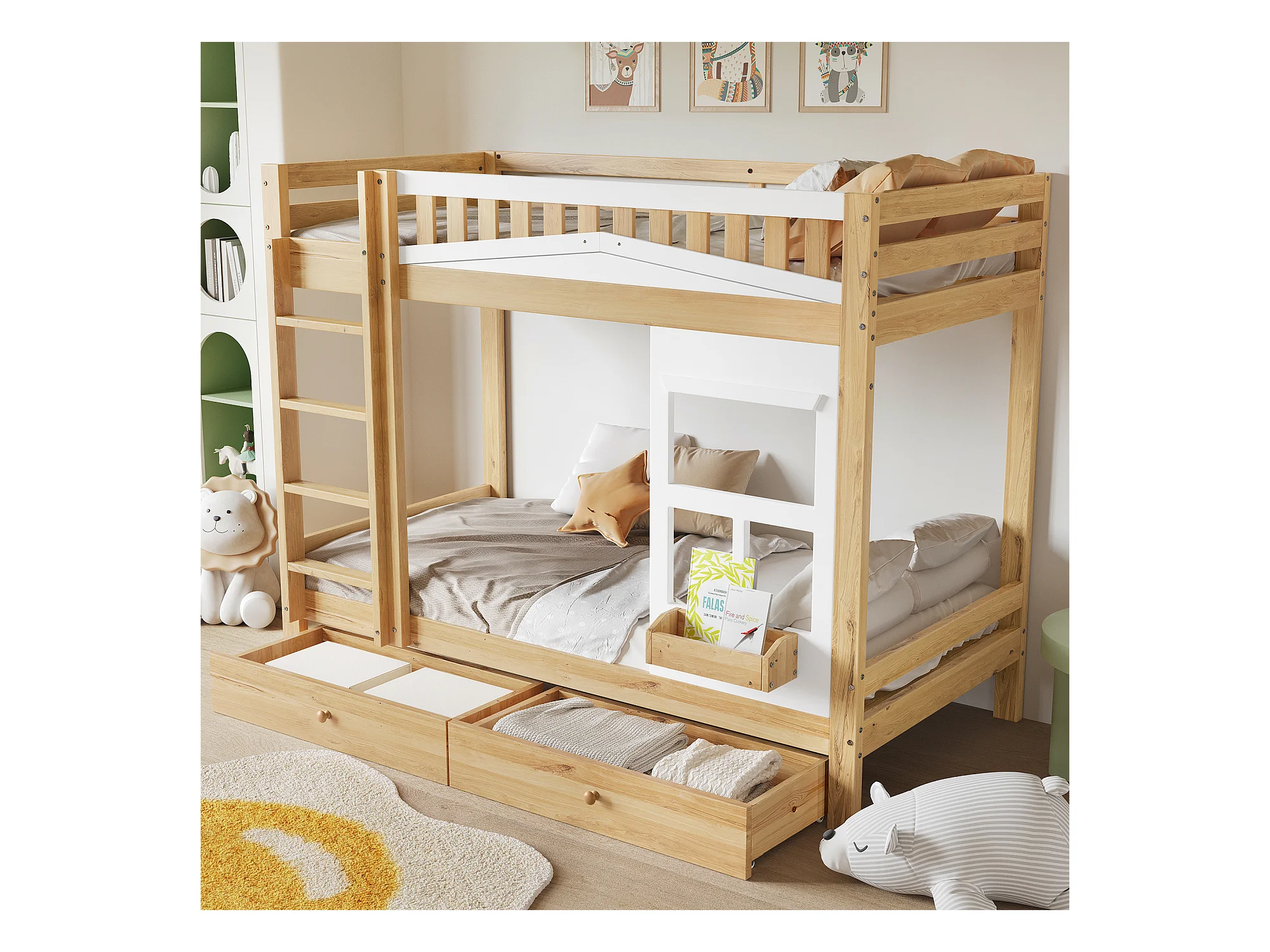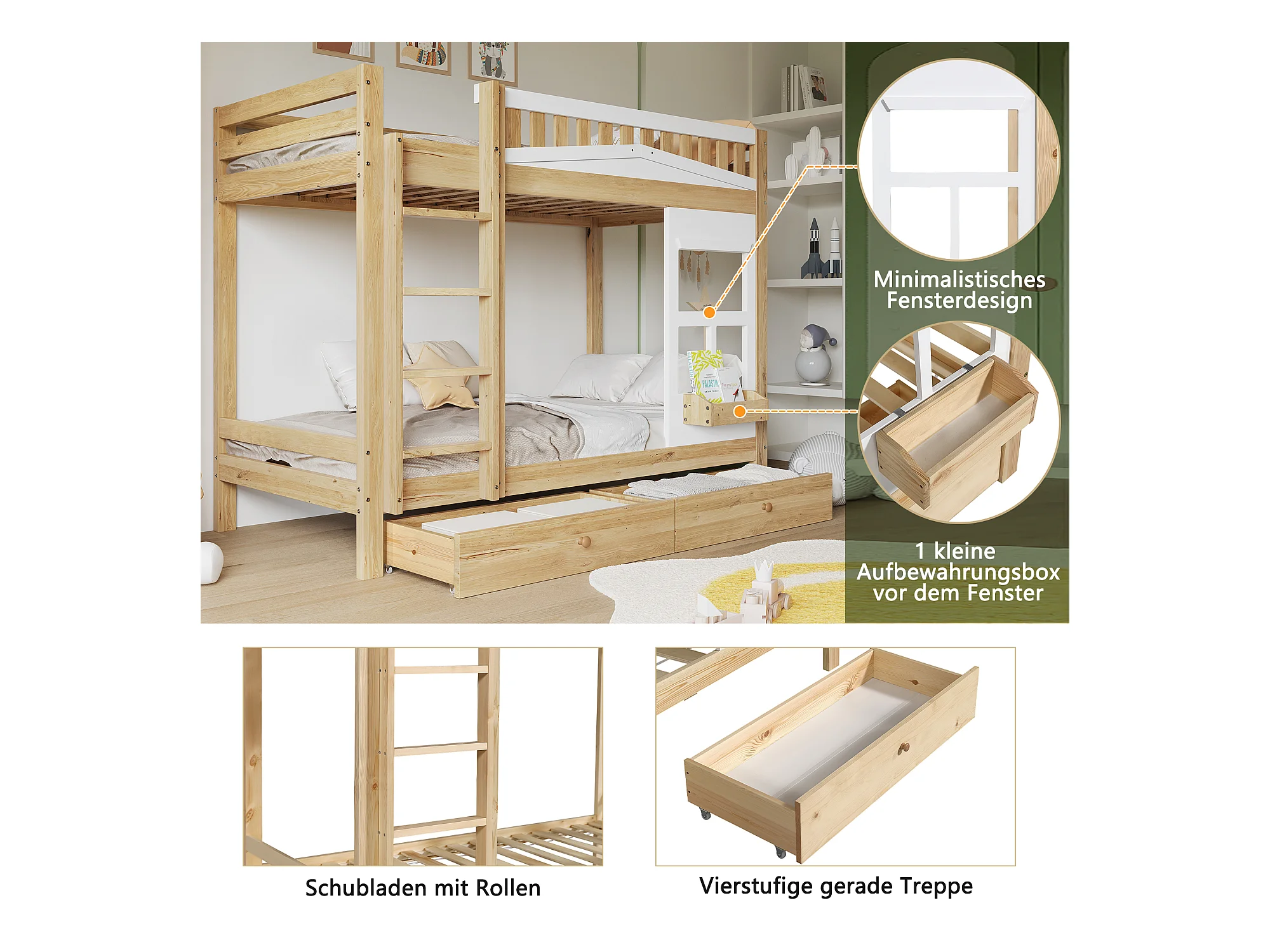 Kinder-Etagenbett mit Fenster - 90 x 200 cm - mit Absturzsicherung - zwei Schubladen und Stauraum - Kiefer + MDF - weiß + natur