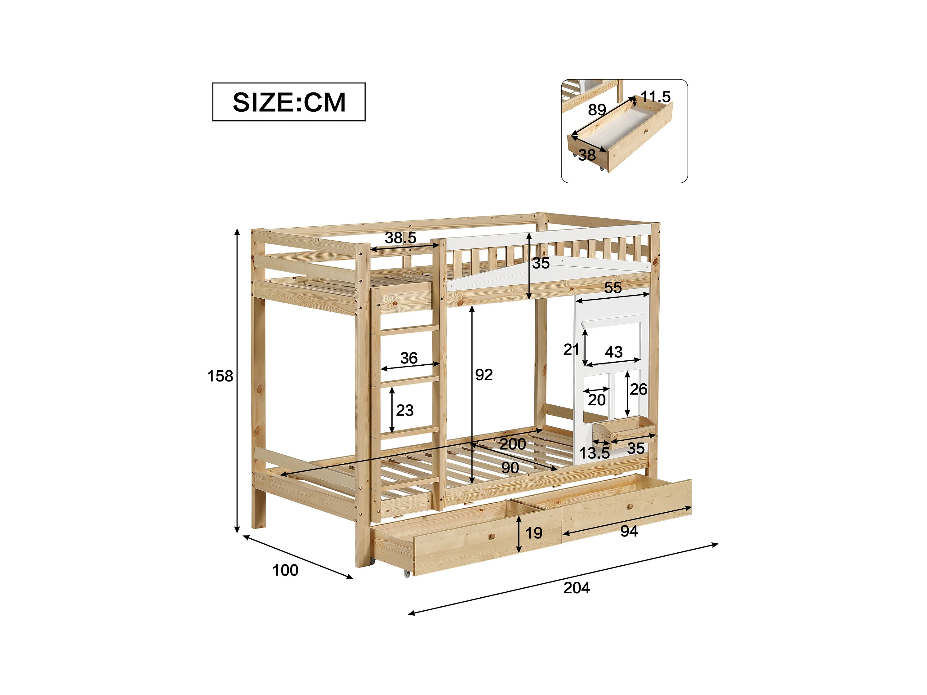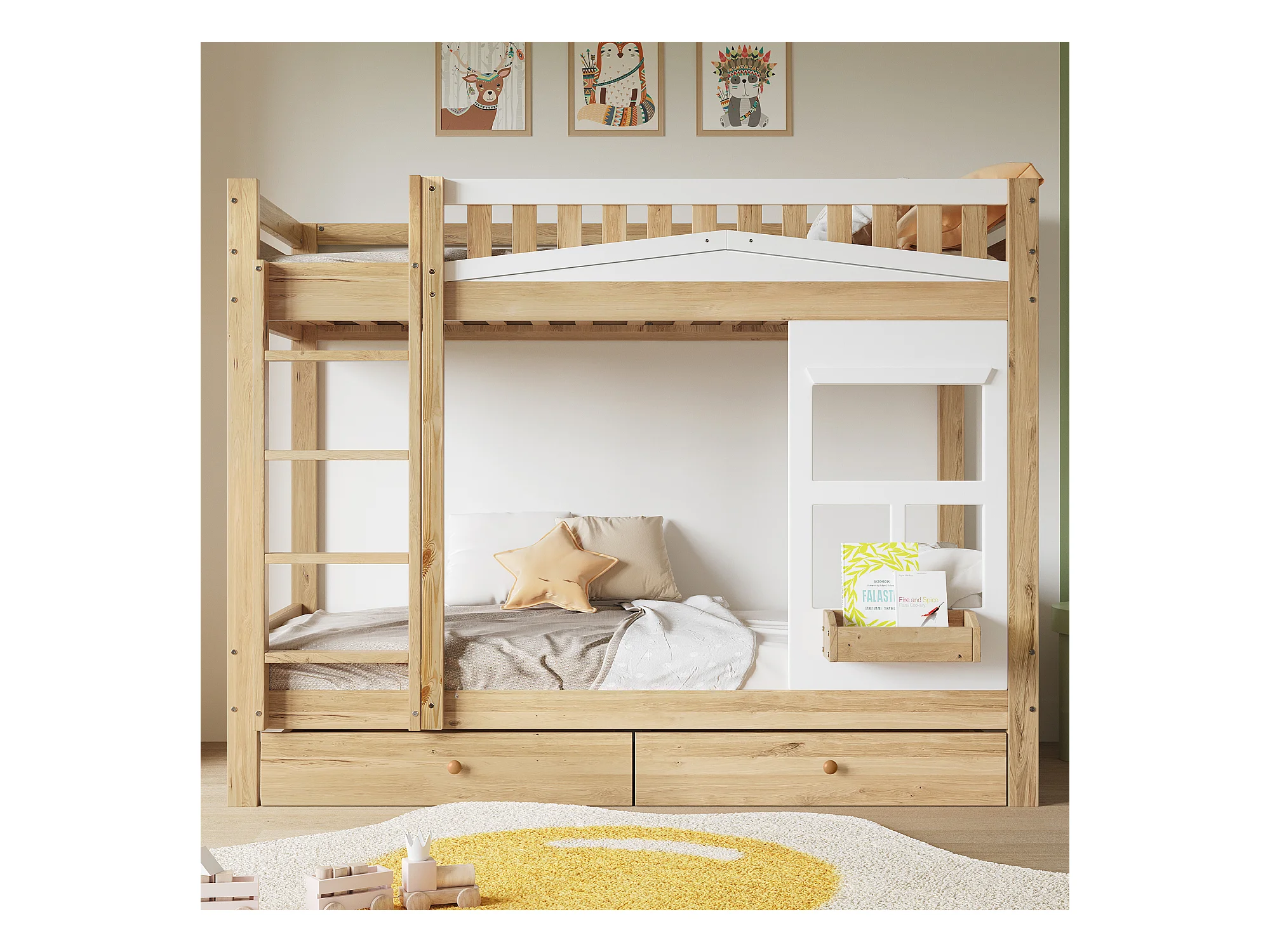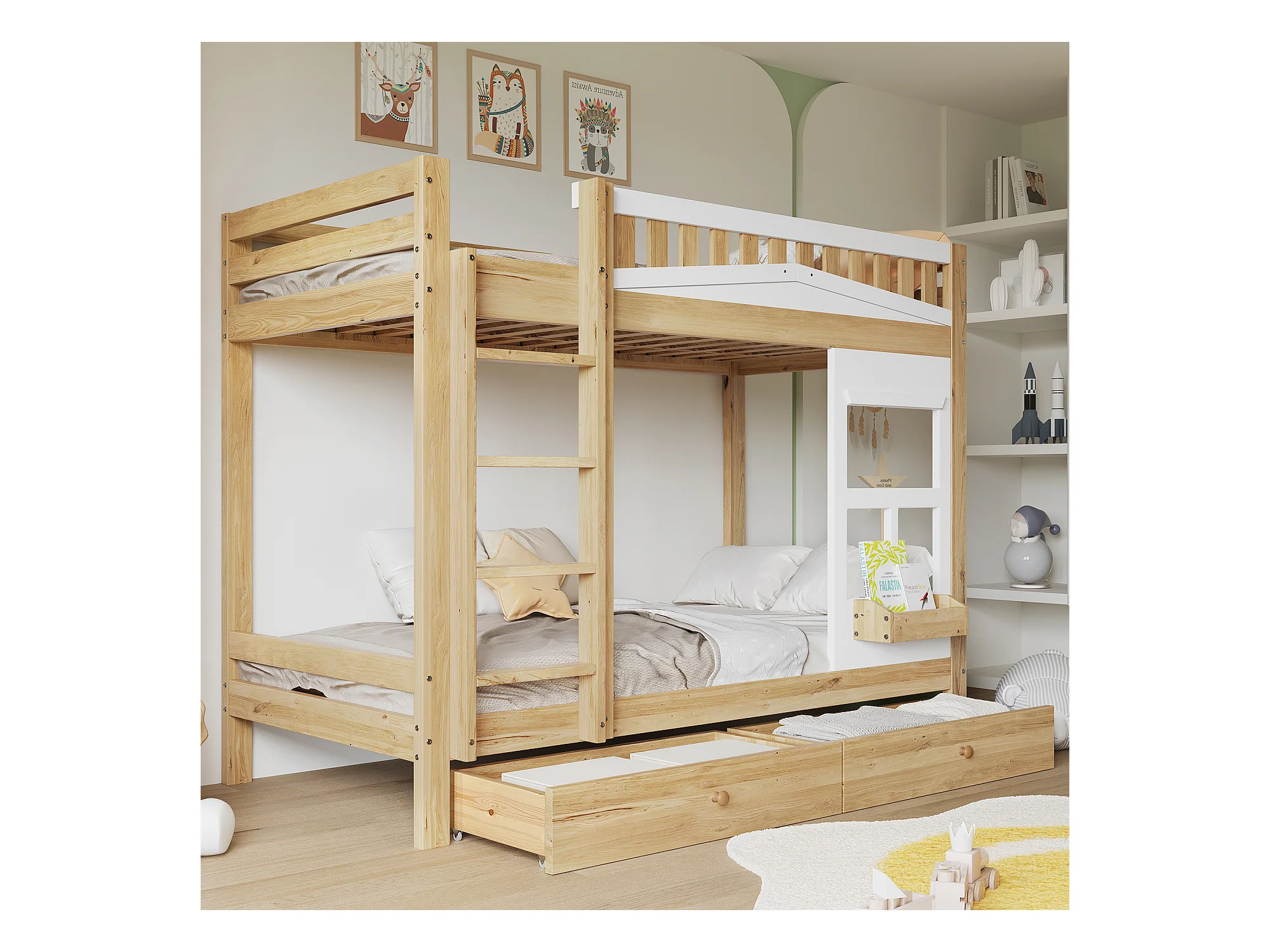 Kinder-Etagenbett mit Fenster - 90 x 200 cm - mit Absturzsicherung - zwei Schubladen und Stauraum - Kiefer + MDF - weiß + natur