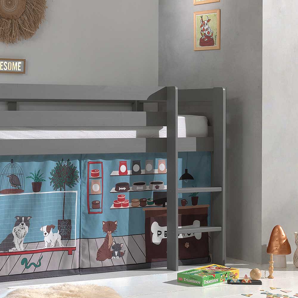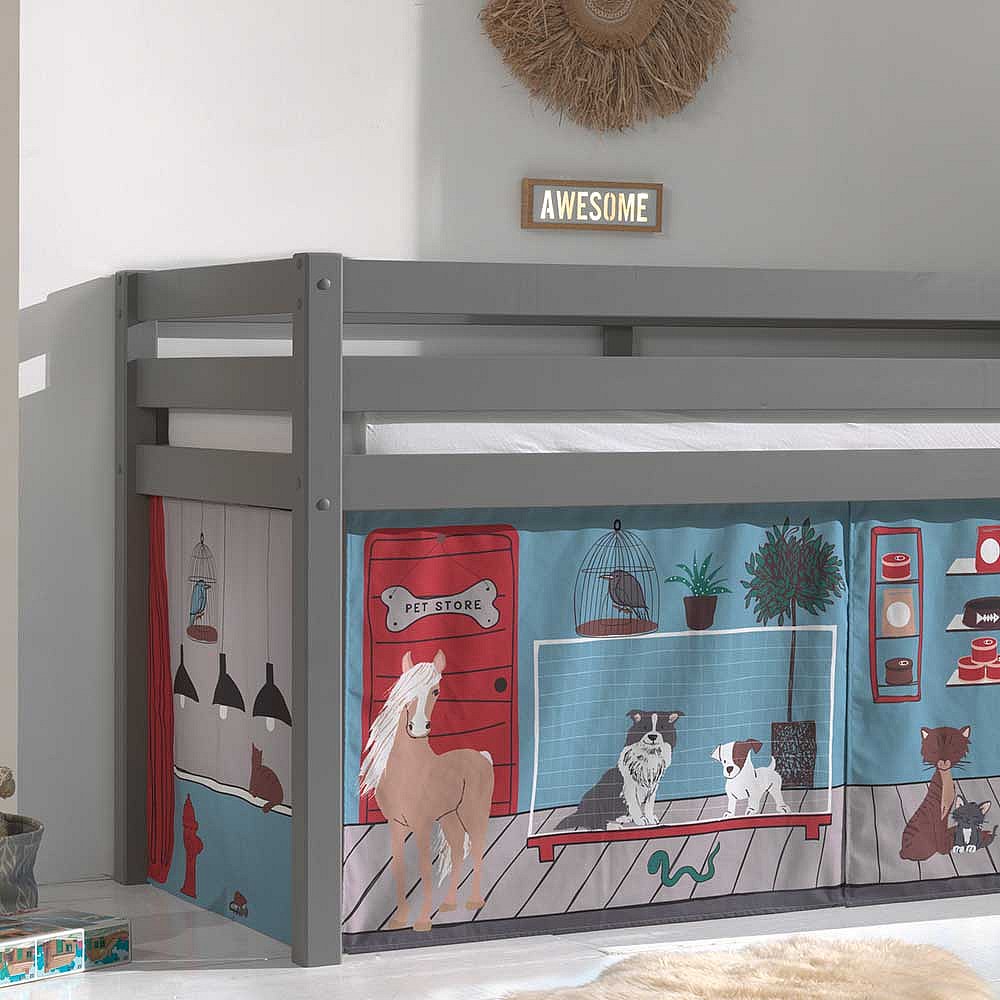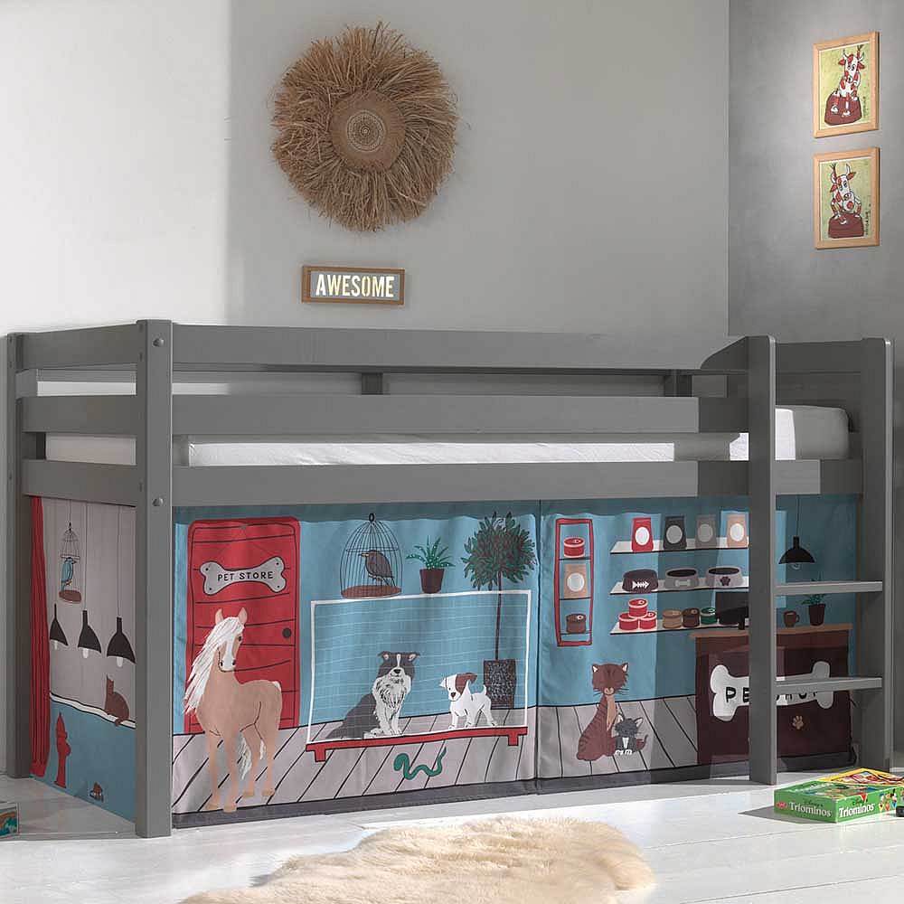 Kinder Halbhochbett aus Kiefer Massivholz Grau mit Tier Vorhang