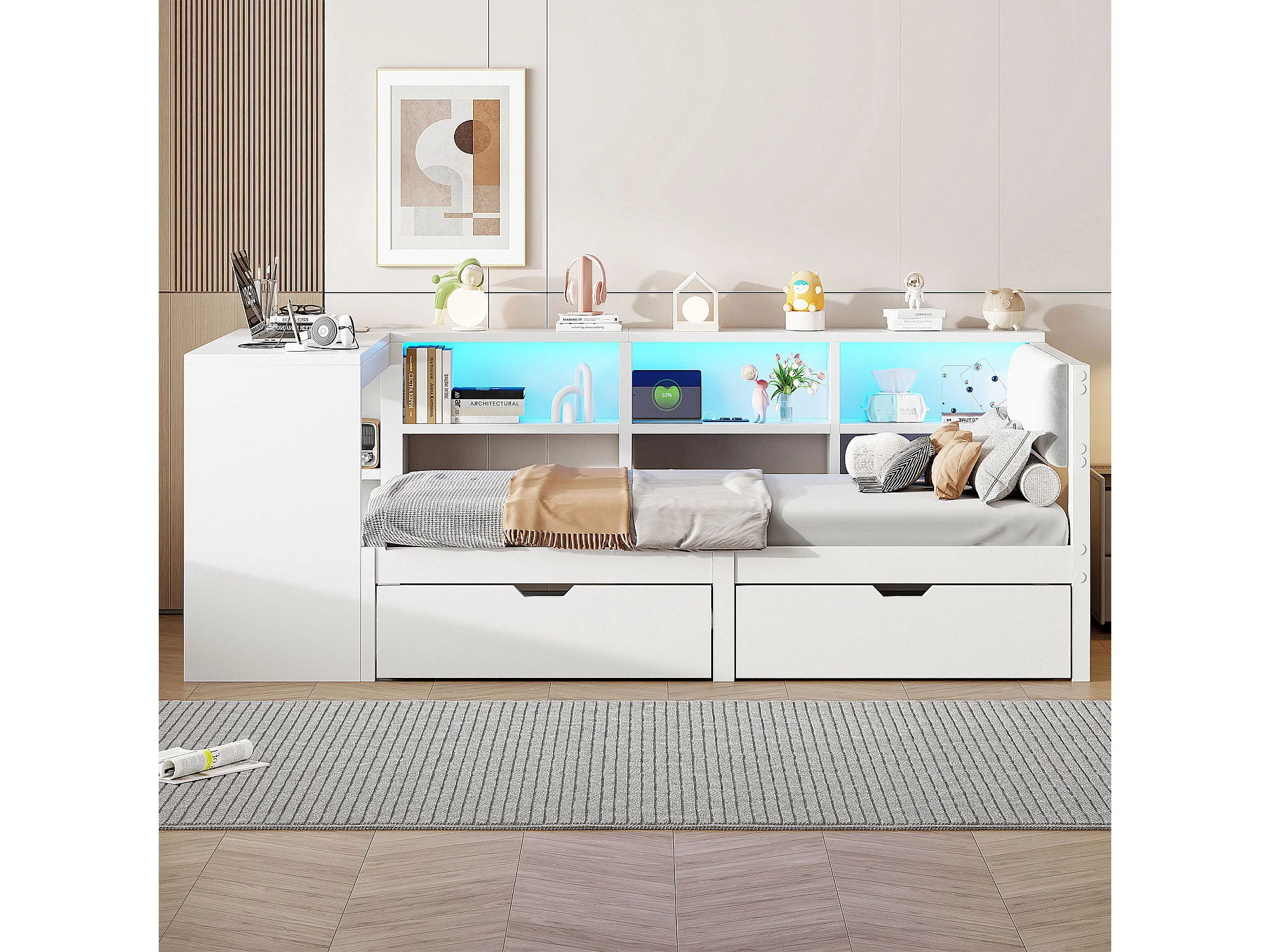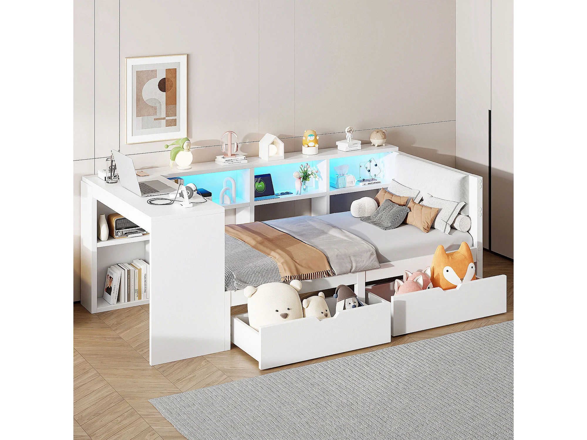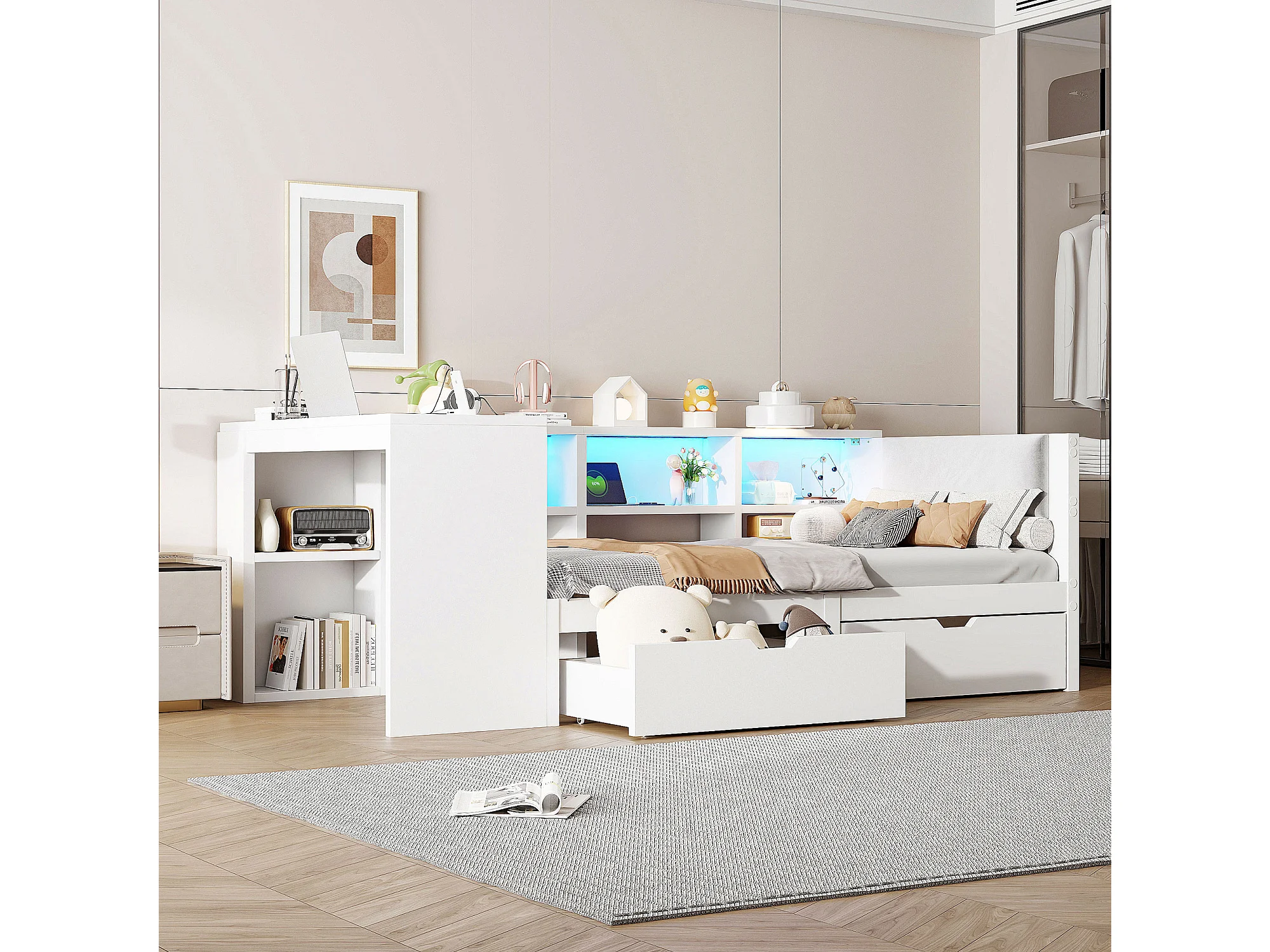 Kinder-Kombibett - 90 x 200 - mit Stauraumregalen + 2 Schubladen + LEDs + Tisch - MDF - weiß