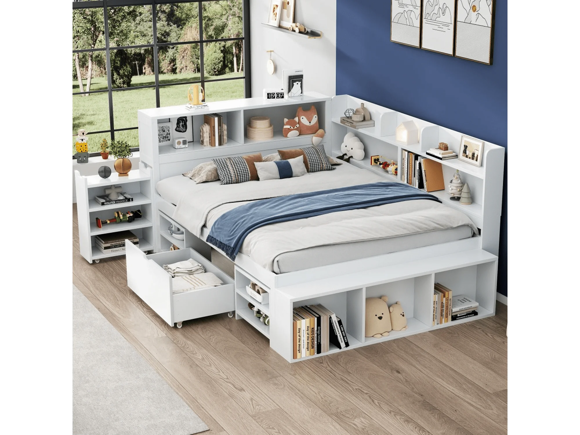 Kinderbett 140*200 cm, mit Schubladen, Regalen und Stauraum, Lattenrost, weiß
