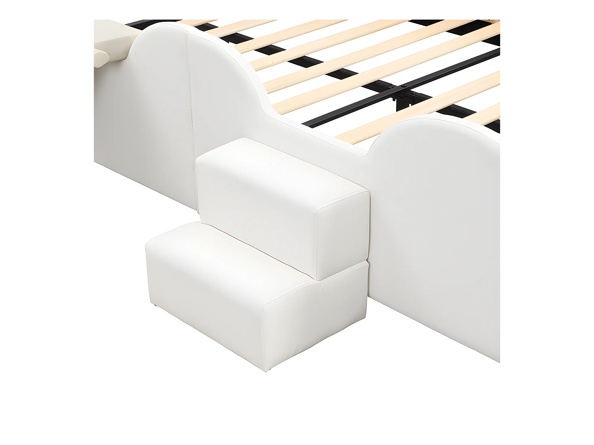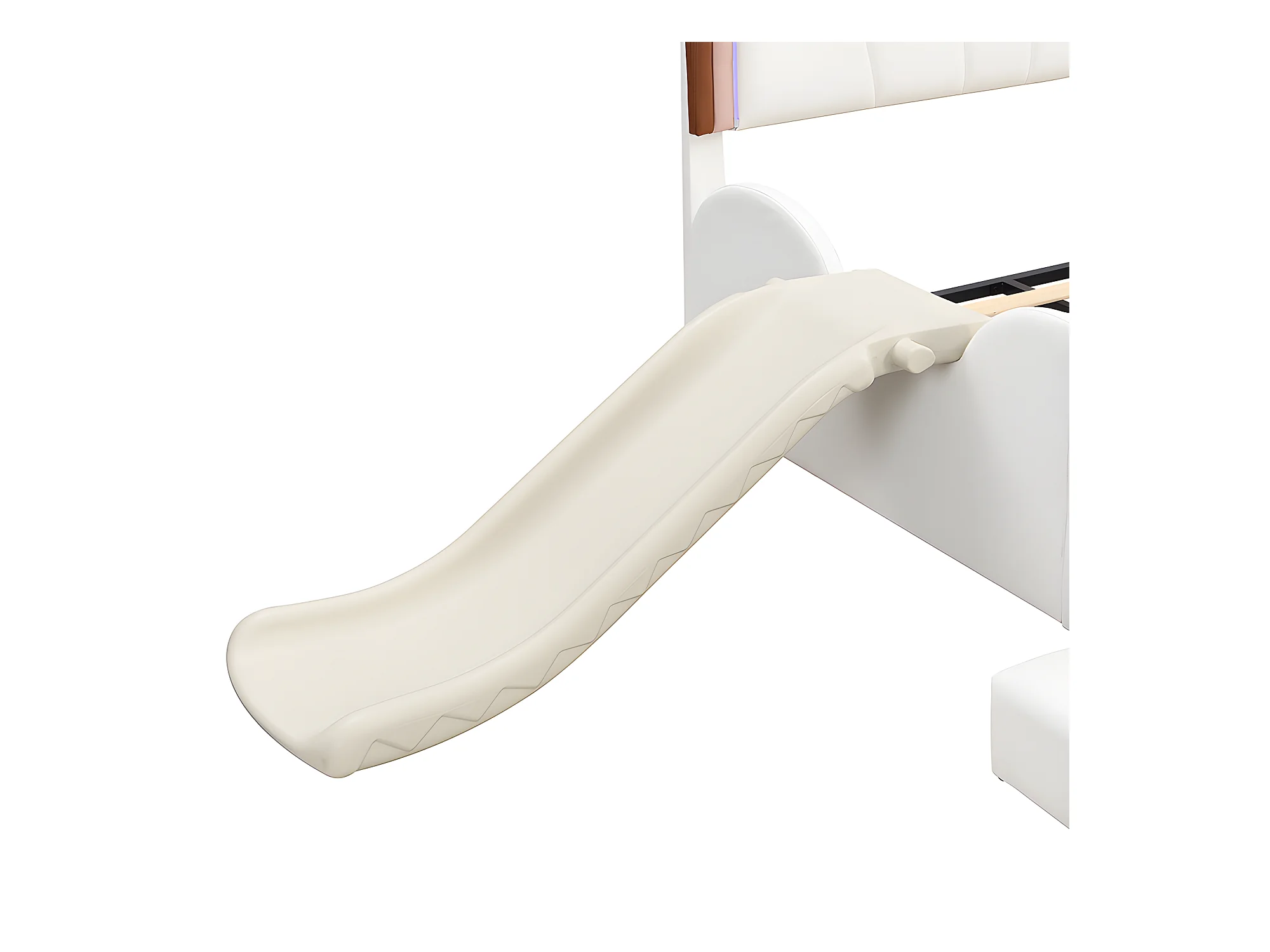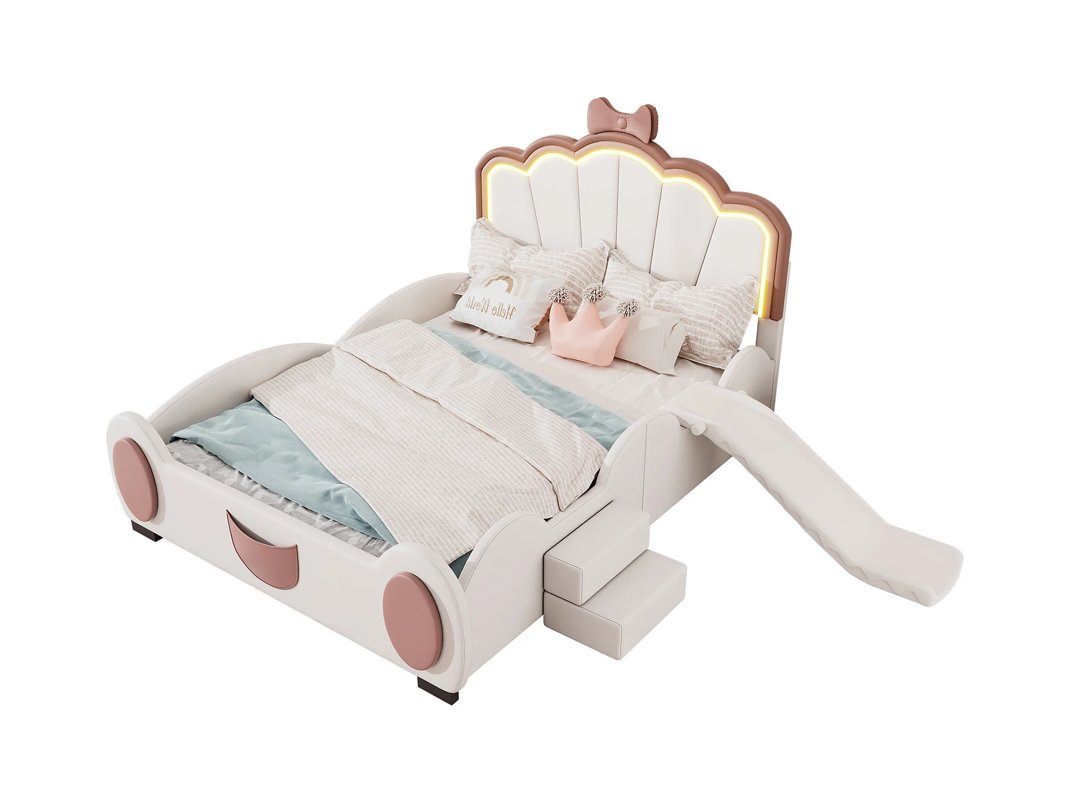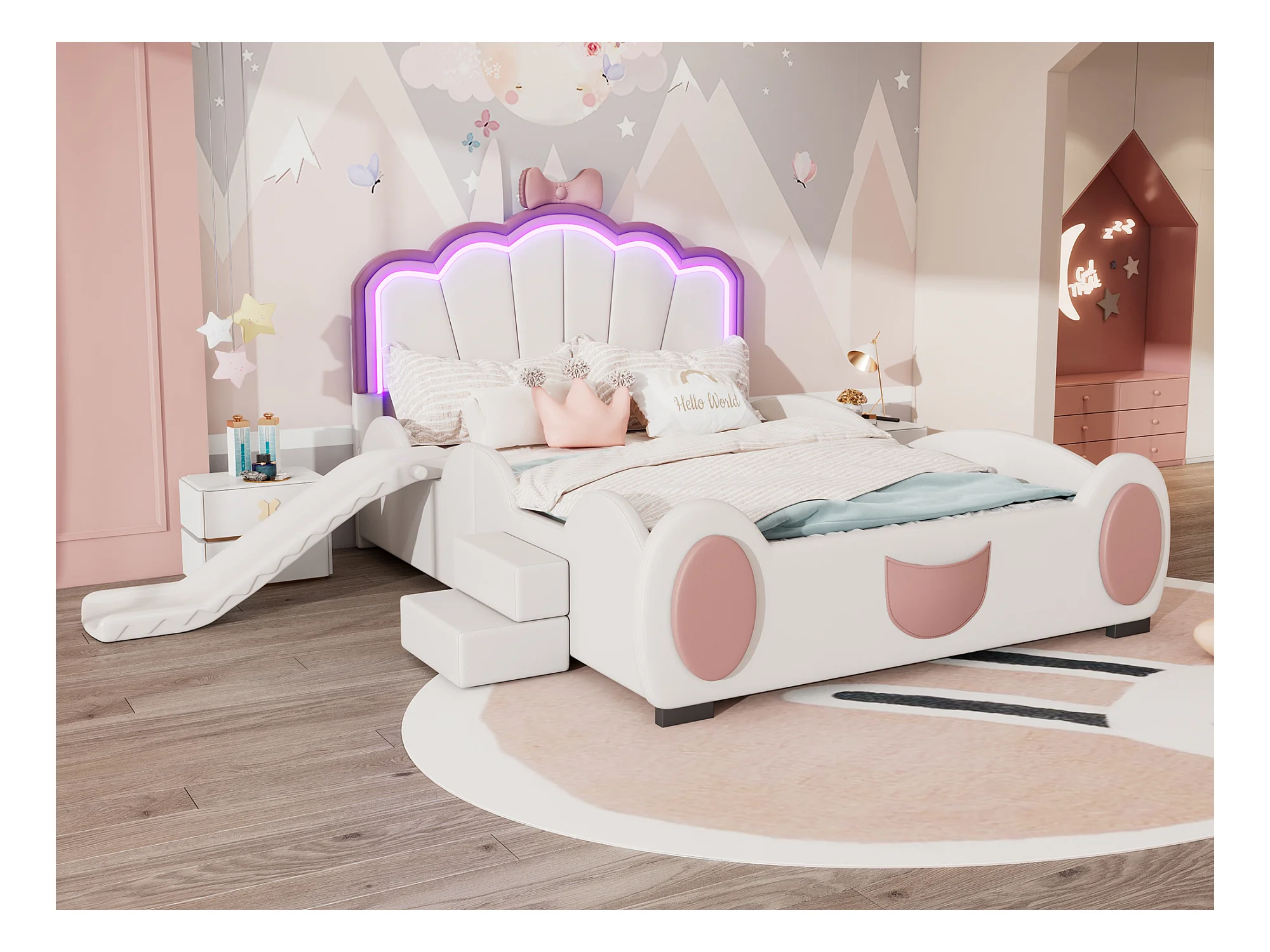 Kinderbett 140 x 200 cm mit Rutsche und Treppe, gepolstert mit Kunstleder, LEDs, Lattenrost, rosa und weiß