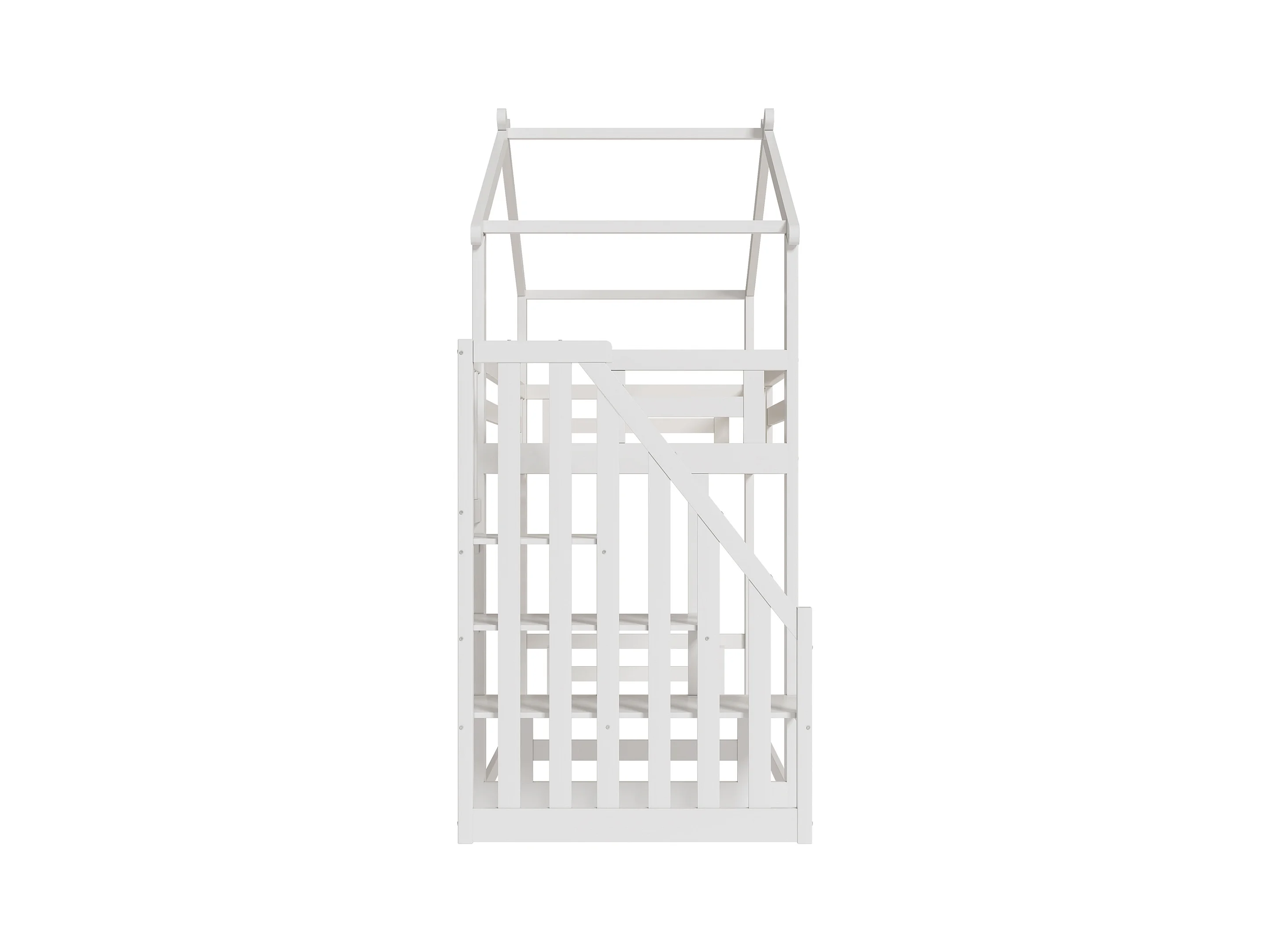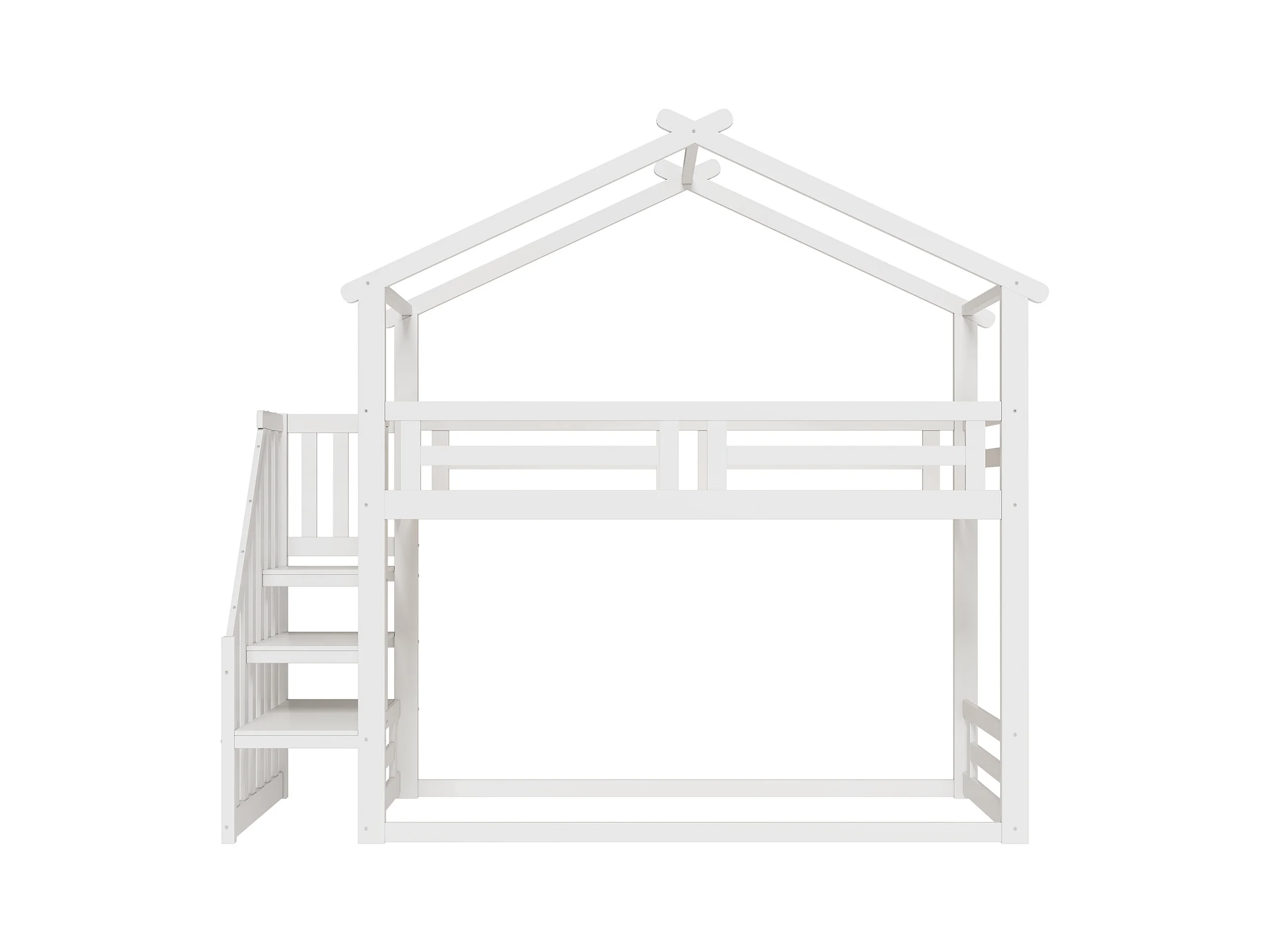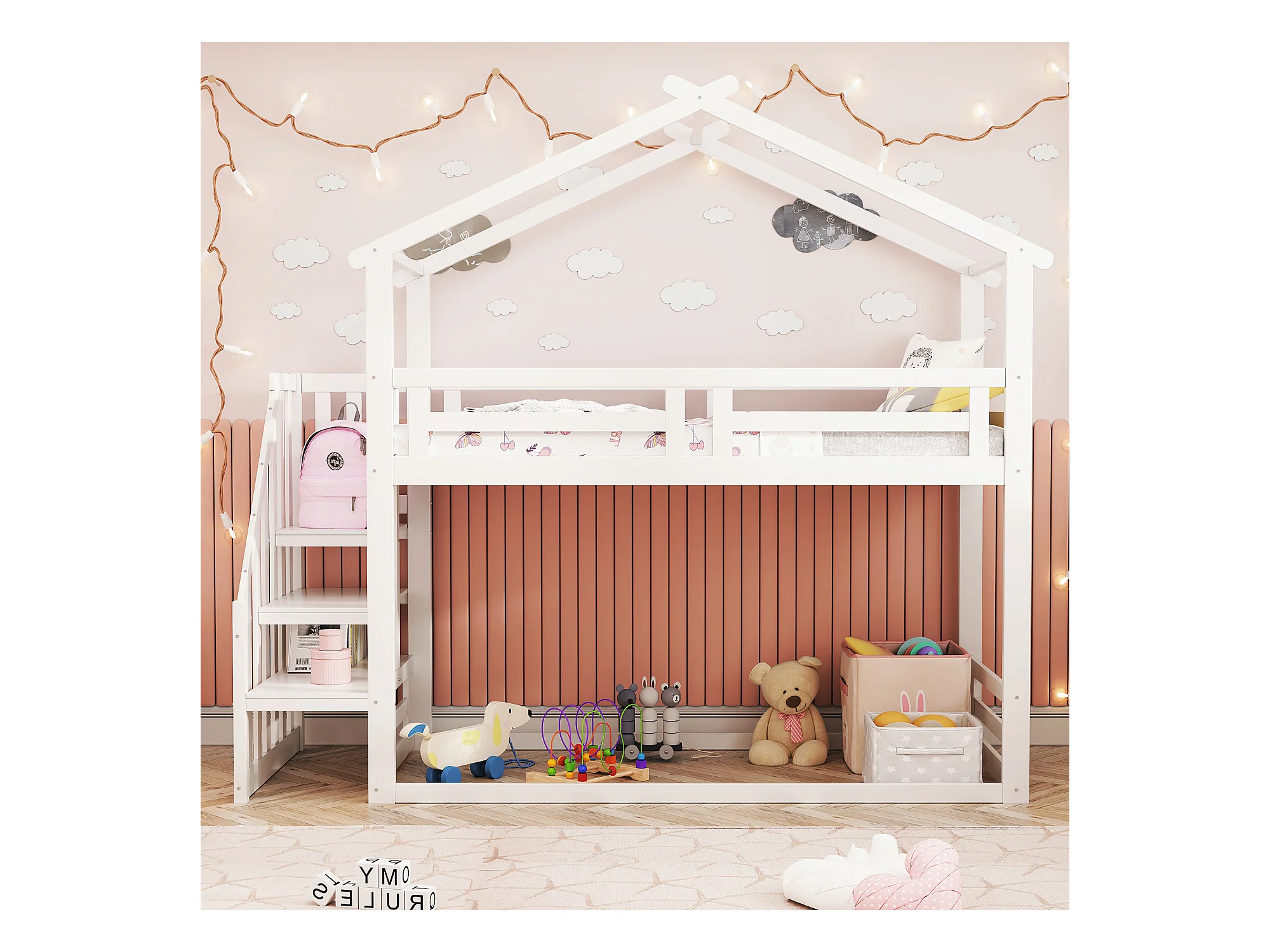 Kinderbett 90*200cm, Niedriges Etagenbett mit Sicherheitstreppe, weiß