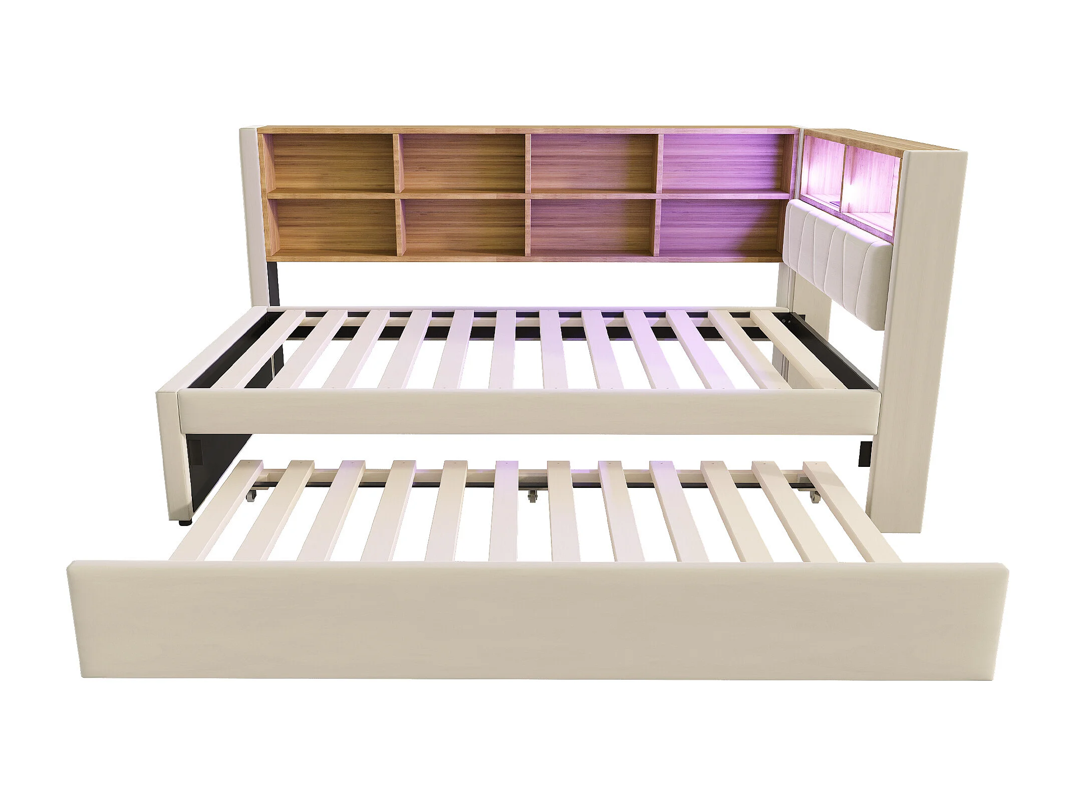 Kinderbett 90 x 200 / 90 x 190 cm – Ausziehbett mit LED-Beleuchtung und USB- sowie USB-C-Anschlüssen – beiger Flanellbezug