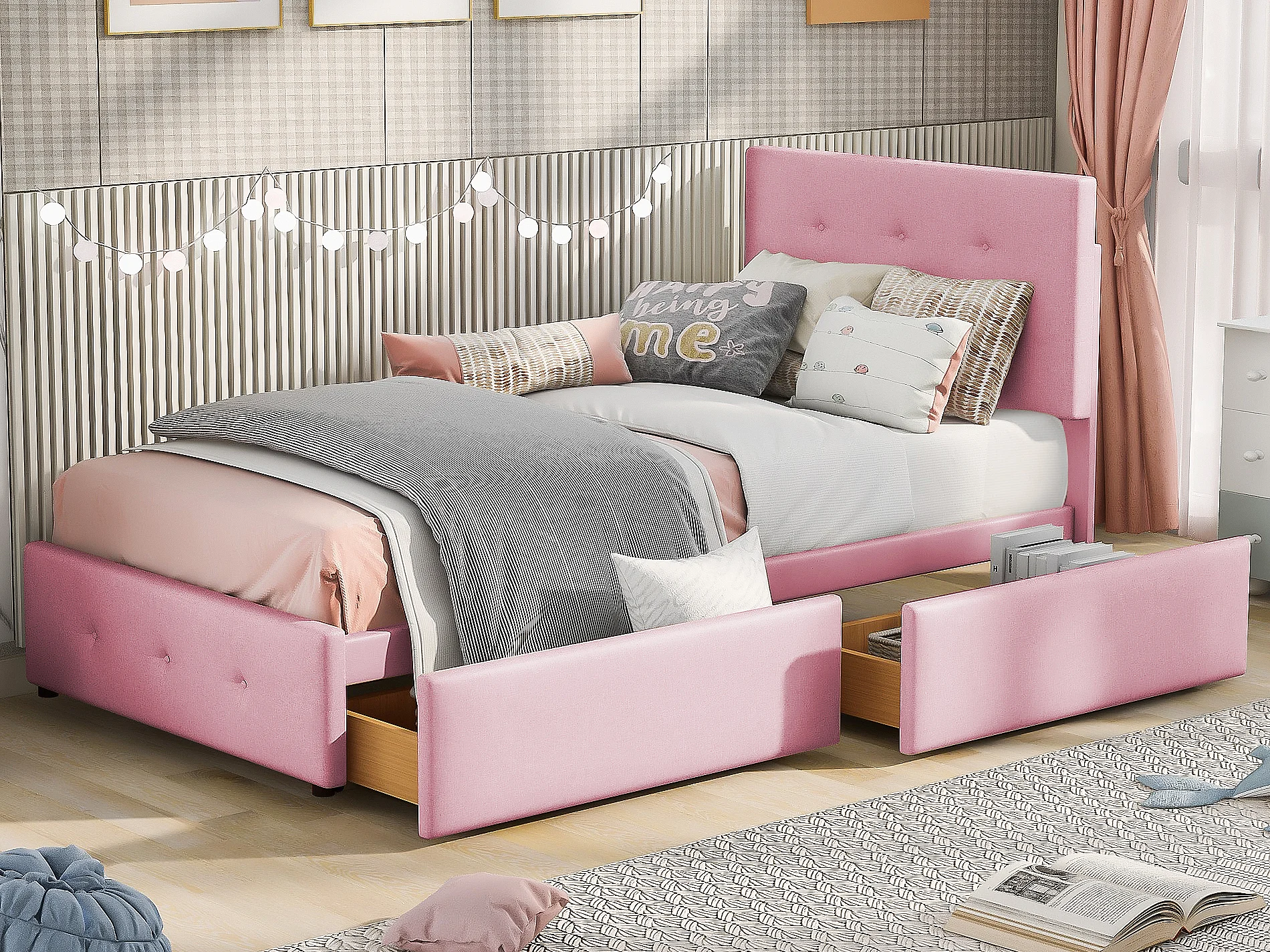 Kinderbett 90 x 200 cm mit Kopfteil und 2 Schubladen – Samt – Rosa