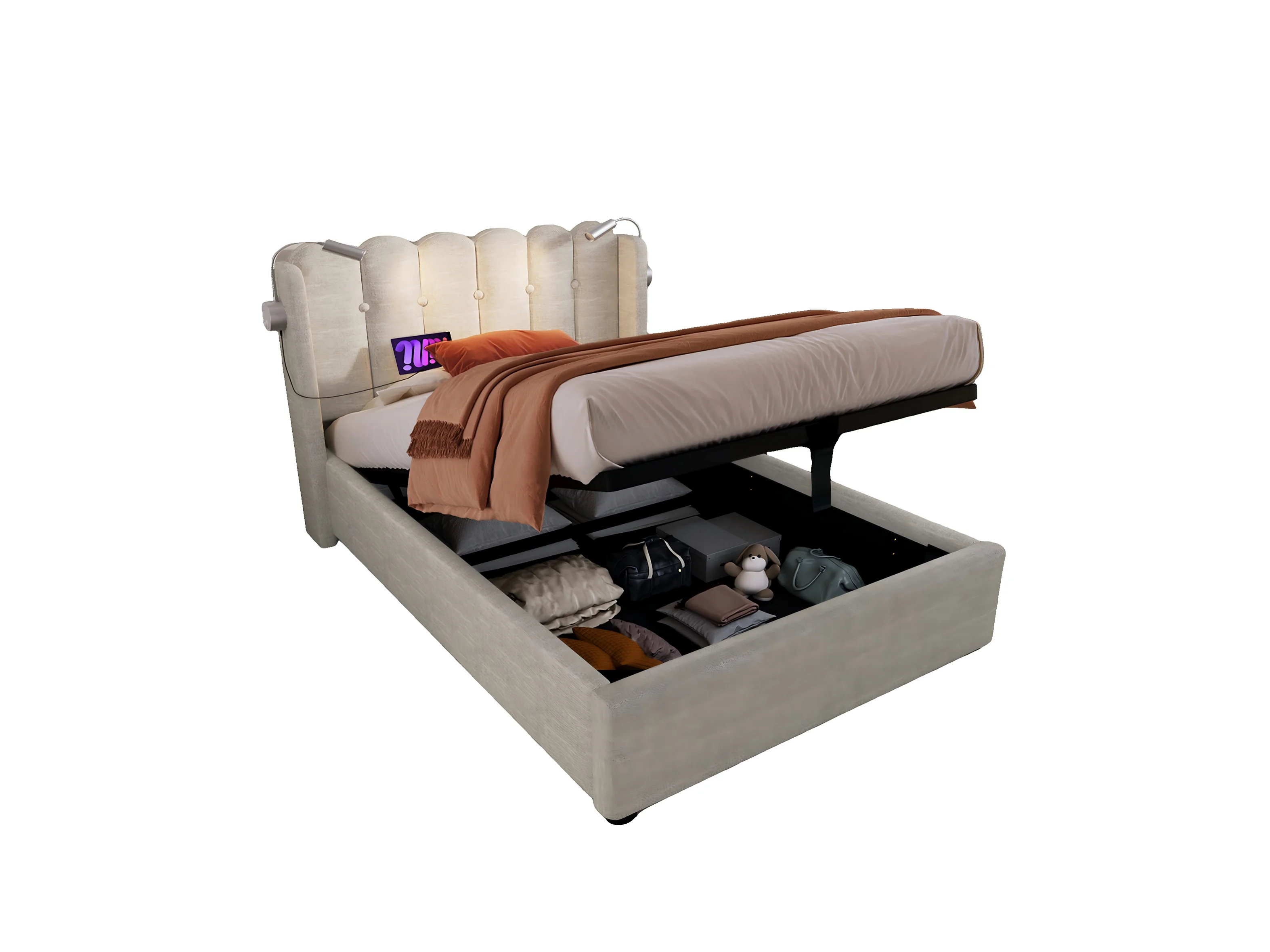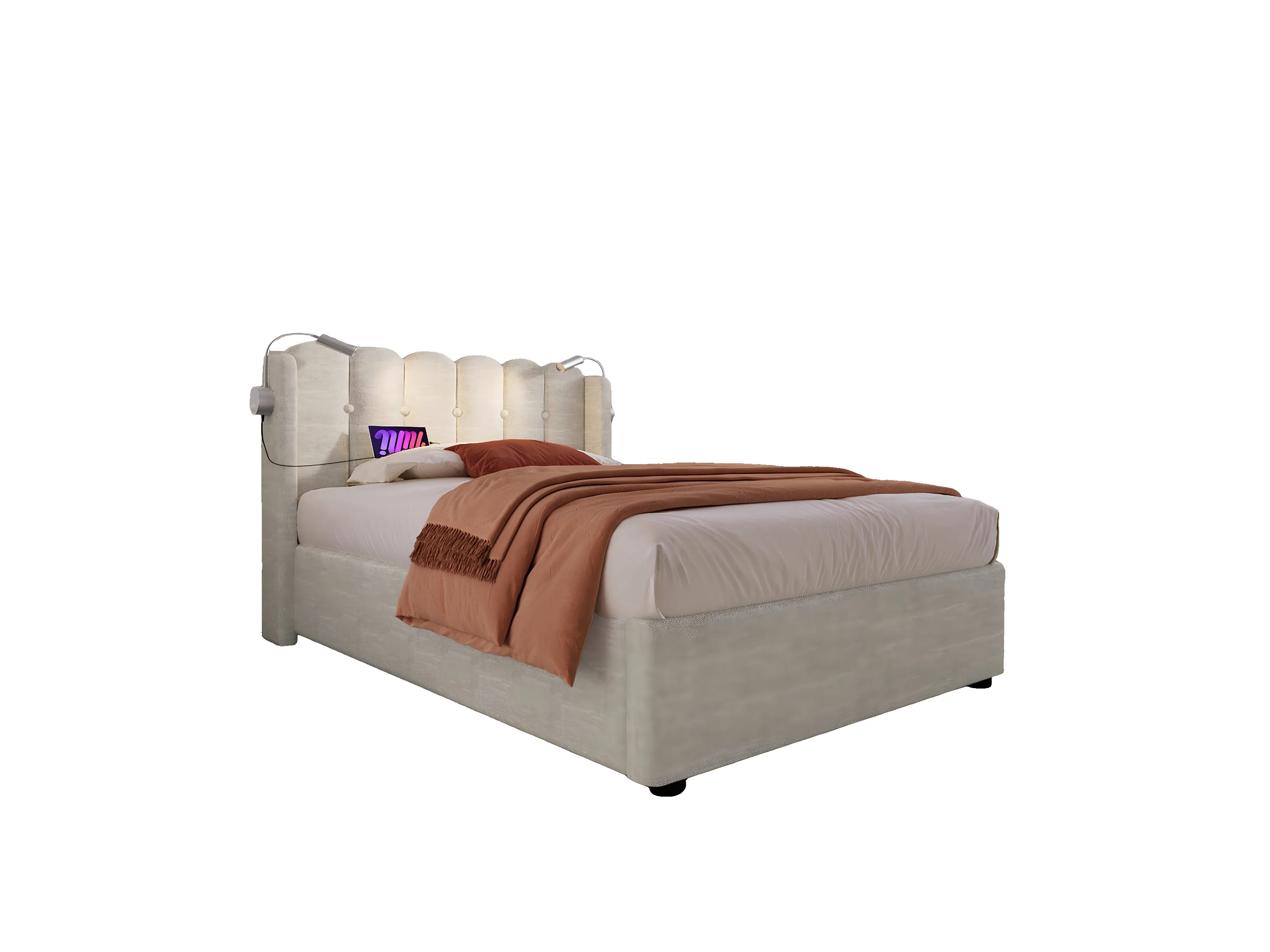 Kinderbett 90x200 cm – Bettgestell mit Kopfteil, USB-Anschluss – beiger Leinenbezug – Matratze inklusive