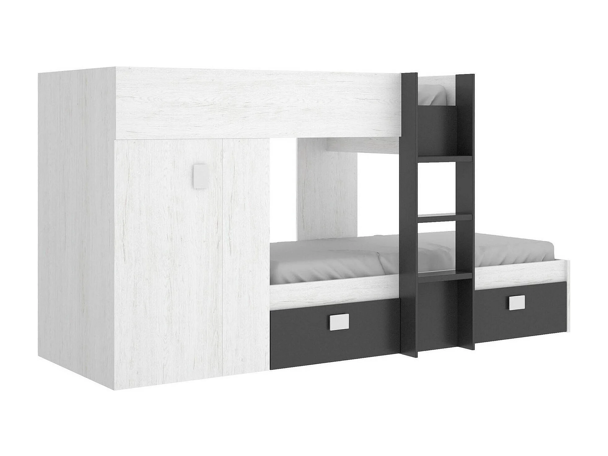 Kinderbett Cevedale, Komplettes Schlafzimmer mit Kleiderschrank und Schubladen, Etagenbettkomposition mit zwei Einzelbetten, 271x111h150 cm, Weiß und Anthrazit