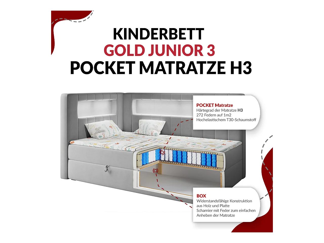 Kinderbett JUNIOR GOLD 3 - Einzelbett mit Matratze, LED-Beleuchtung, Bettkasten - 90x200 cm - Rechts Seite