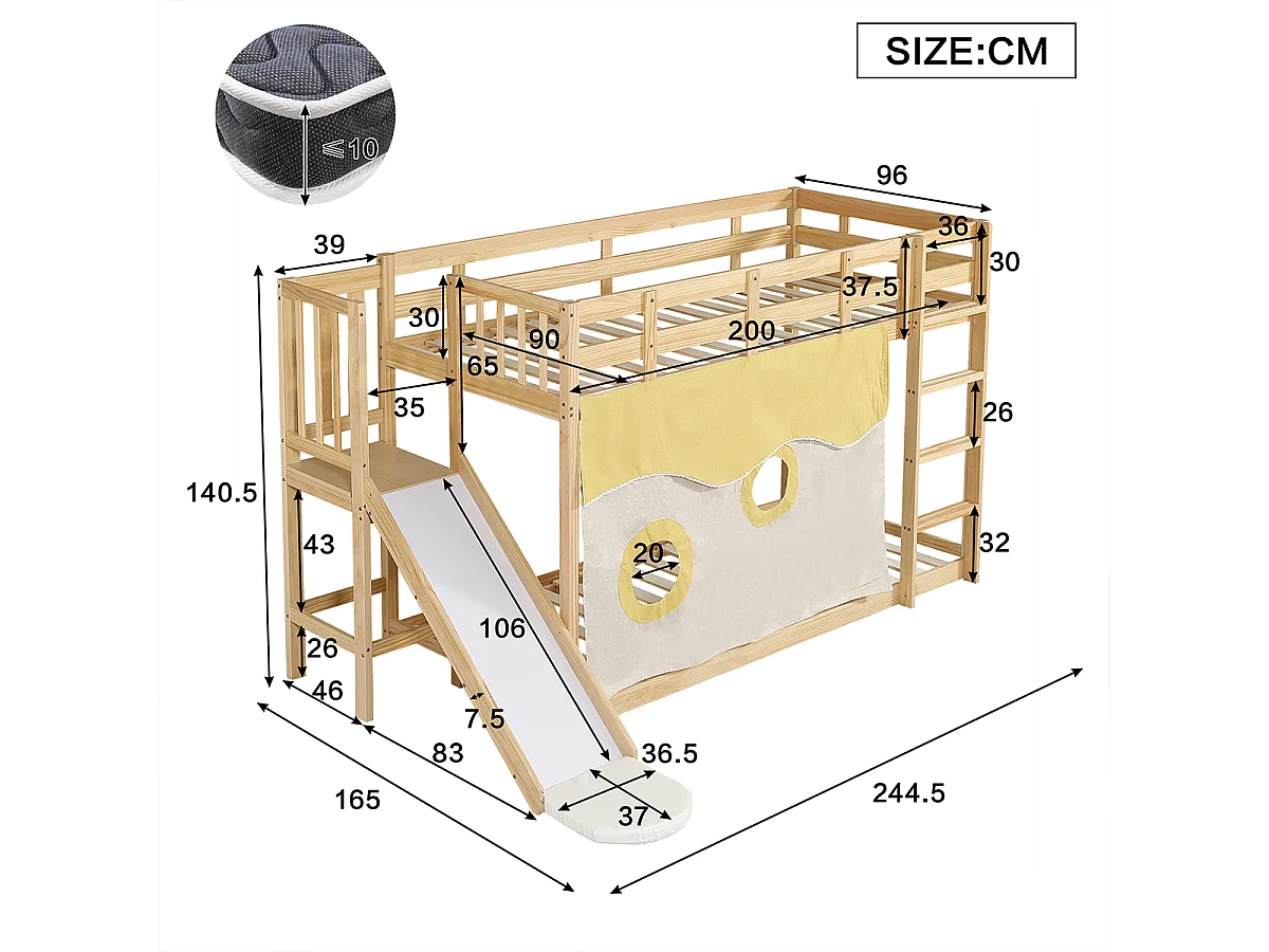 Kinderbett mit Treppe und Zäune, Bettvorhang, Rutsche Etagenbett Jugendbett MDF+Kiefer 90x200cm Natur