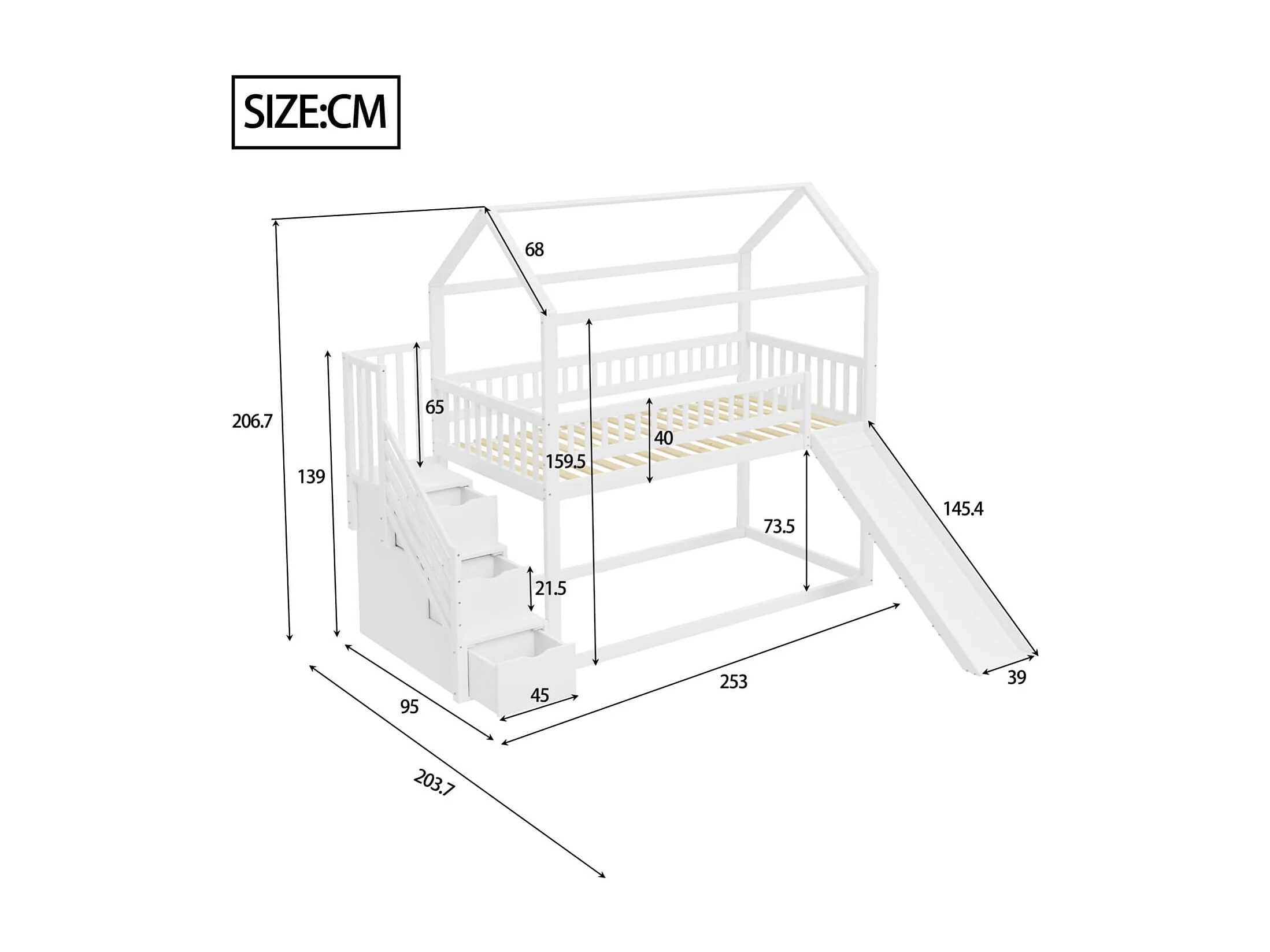 Kinderetagenbett 90*200cm, Hochbett mit Rutsche und Stauraumleiter, hohe Zaunkonstruktion, Massivholzbettrahmen, Lattenrost