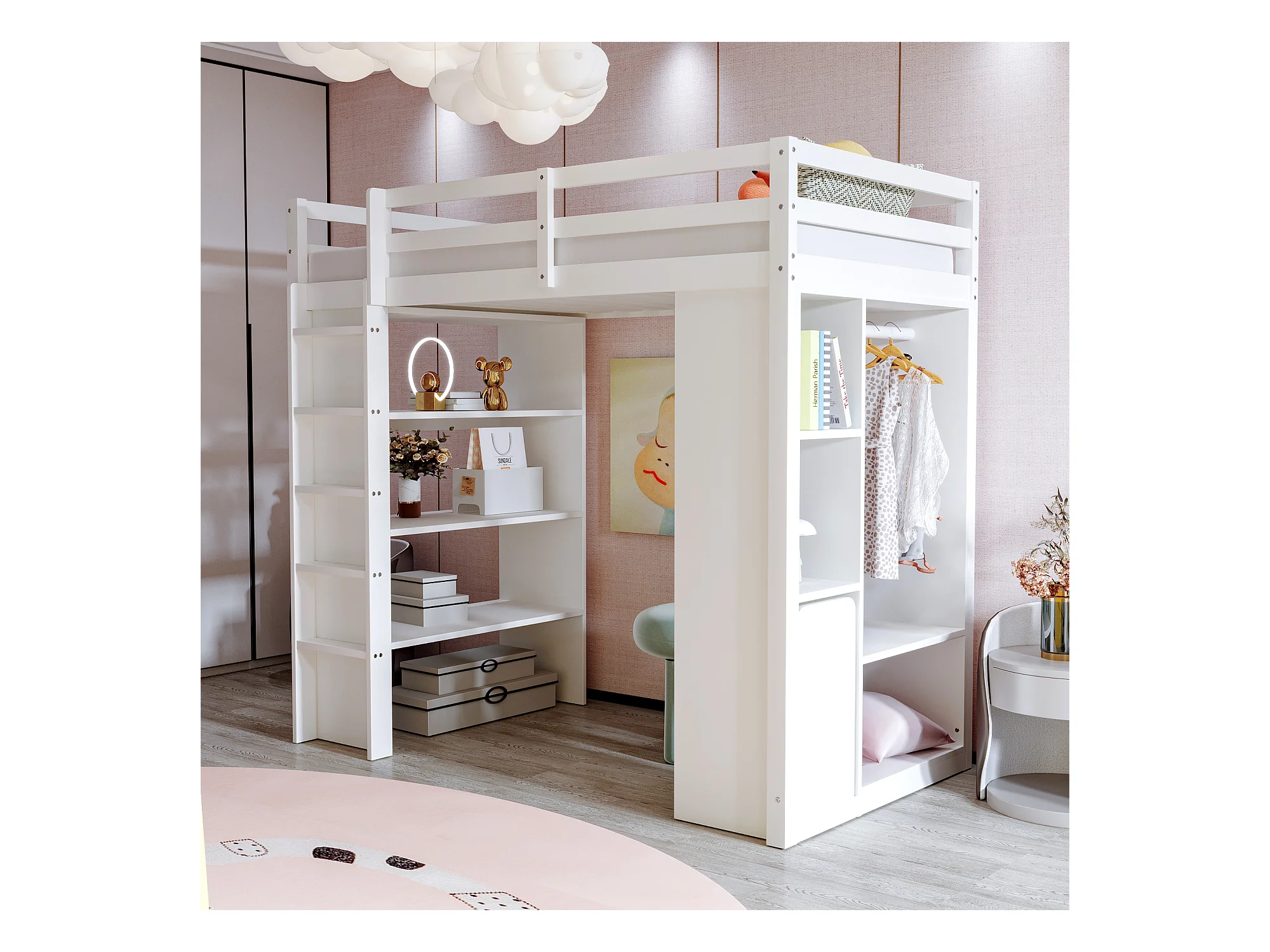 Kinderhochbett 90×200 cm - mit Kleiderhaken + Stauraum - mit 1 mobilem Aufbewahrungswagen - weiß (Matratze nicht enthalten)