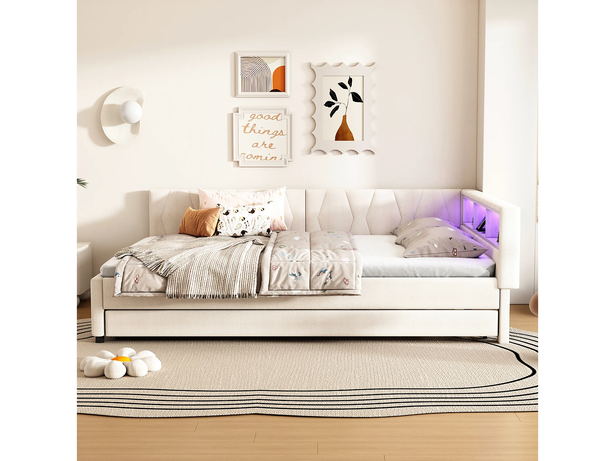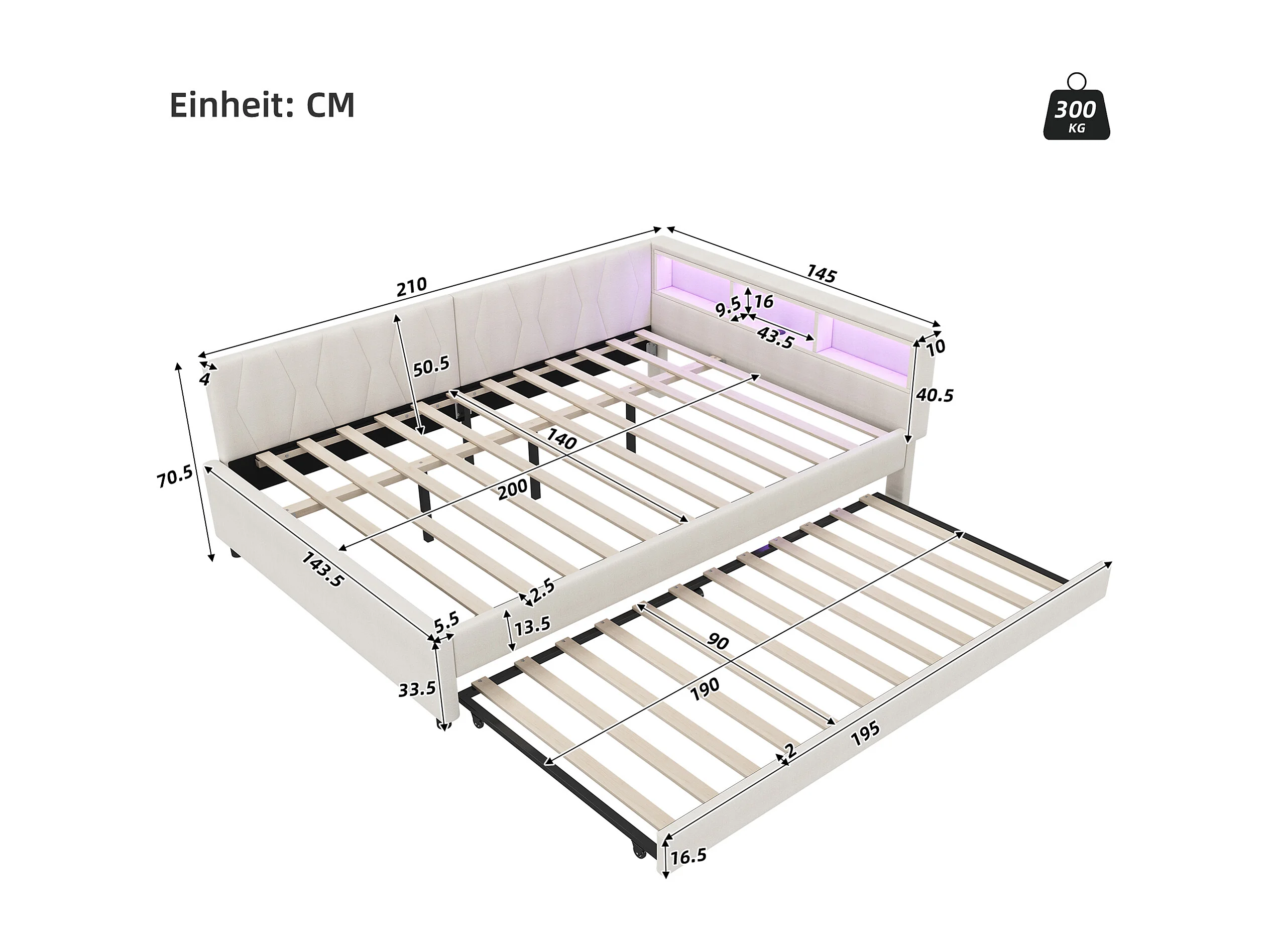 Kinderschlafsofa – 140 x 200 cm – Stauraum über dem Bett – mit USB-Anschluss und LED-Beleuchtung – mit Ausziehbett (90 x 190 cm) – Leinen und MDF – beige