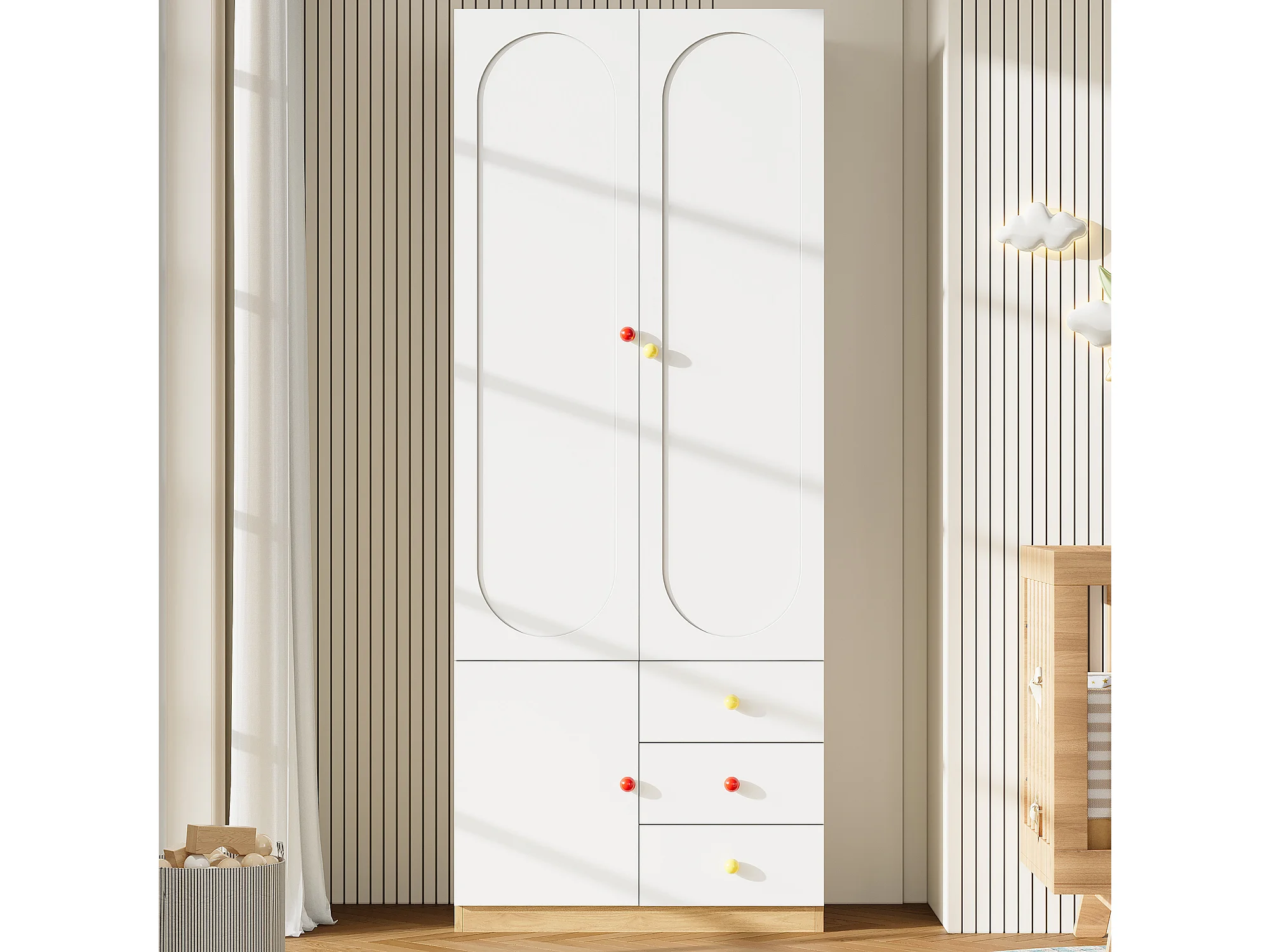 Kinderzimmerschrank – 80 x 45 x 200 cm – mit 2 Türen und 3 Schubladen – lackierte Oberfläche – MDF – weiß