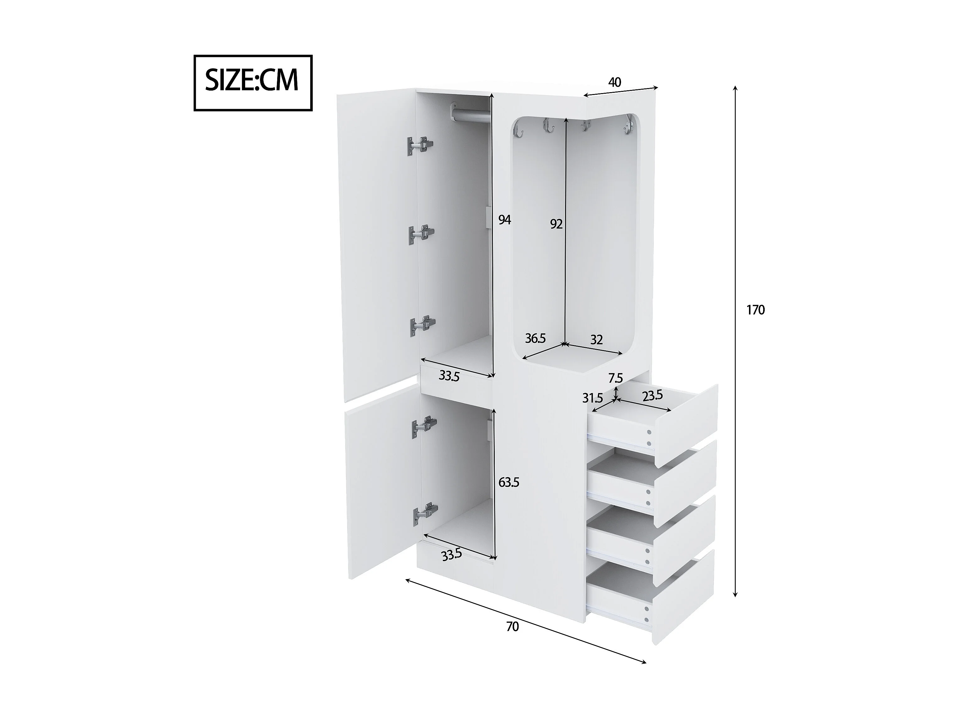 Kleiderschrank - 70 x 40 x 170 cm - mit 4 Schubladen + 2 Türen + offenem Kleiderfach - Holz - weiß