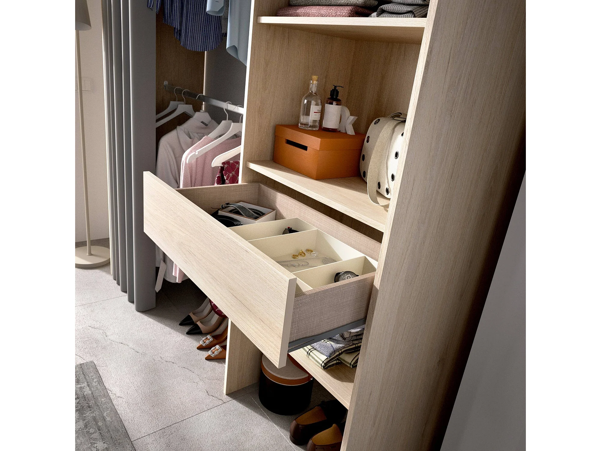 Kleiderschrank Dober, Rahmen für begehbaren Kleiderschrank mit Vorhang, Offene Garderobe, 160x50h205 cm, Eiche