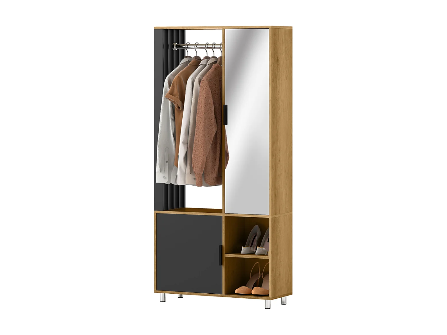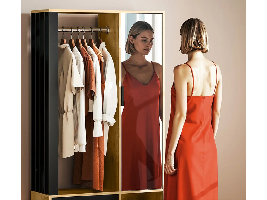 Kleiderschrank mit Spiegel und Hängestange, Schuhschränke, Aufbewahrungsfächer, offene Ablageflächen