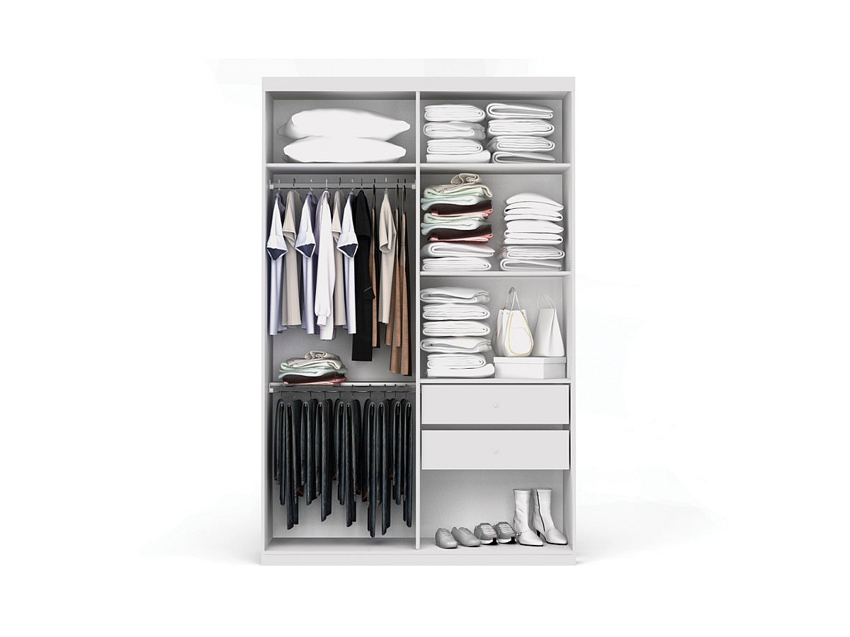 - Aufbau: 2 Schwebetüren, 2 Kleiderstangen, 2 Schubladen, 4 Fächer