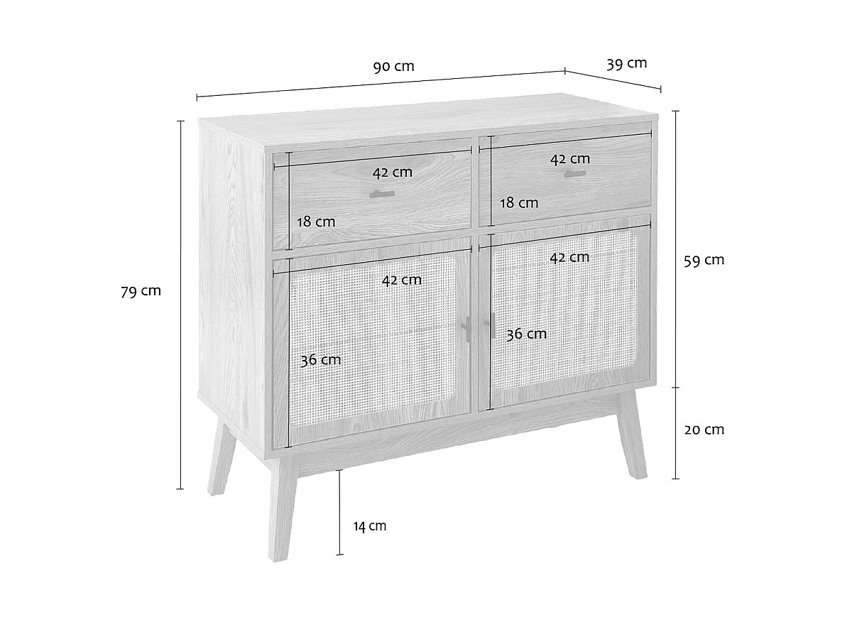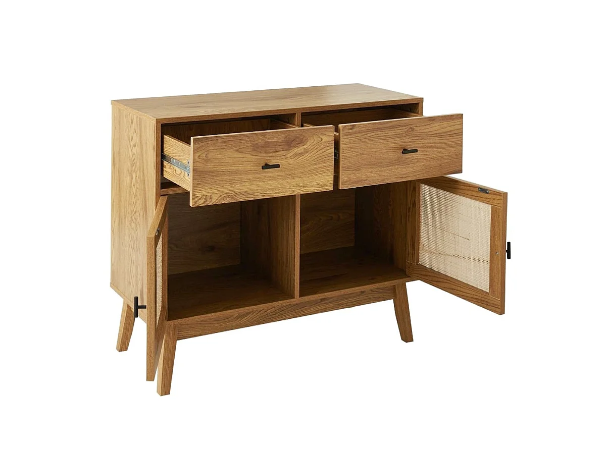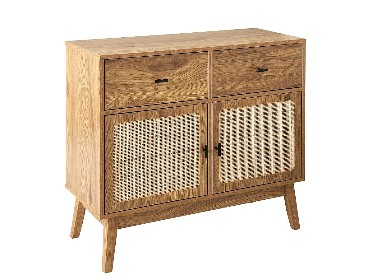 Kommode mit 2 Türen mit Rattanfronten, 2 Schubladen und Holzfüßen L90 cm