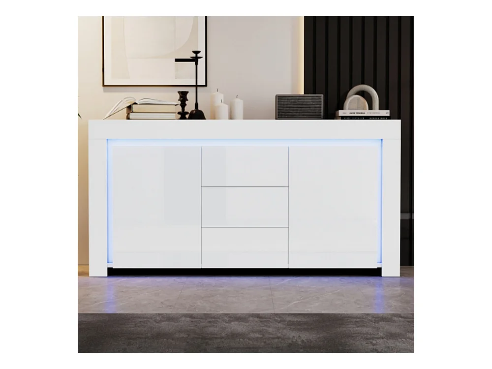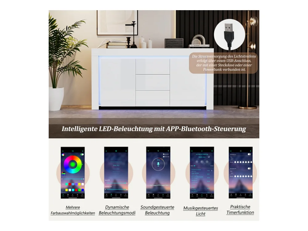 Kommode mit 3 Schubladen,2 Türen, Hochglanz Beistellschrank mit LED-Lichtleiste,Sideboard mit Stauraum,für Flure, Wohnzimmer 140*40*65cm