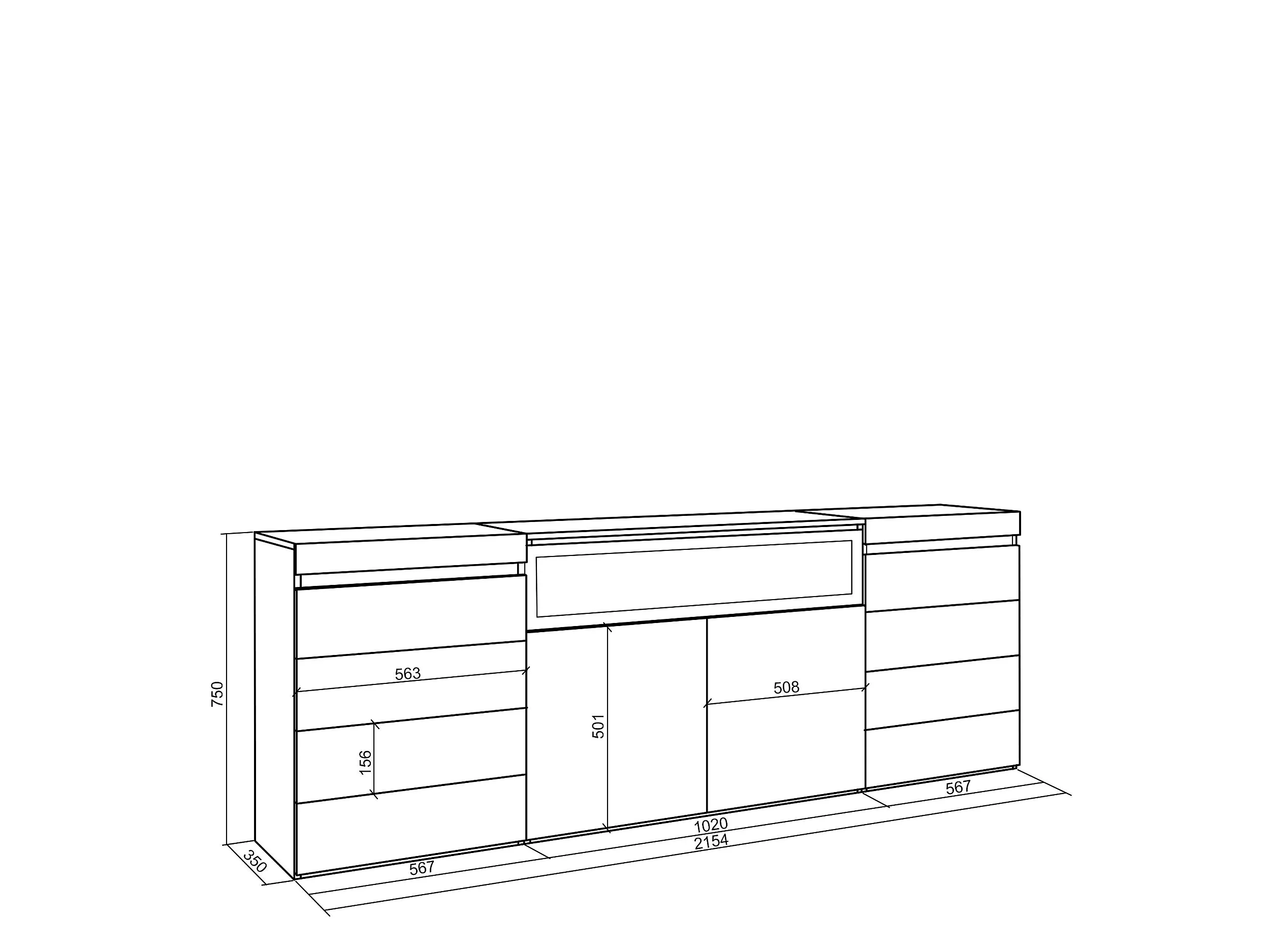 Kommode mit Schubladen, 214x35x75cm, Für Schlafzimmer, Elektrokamin, Weiß und Schwarz