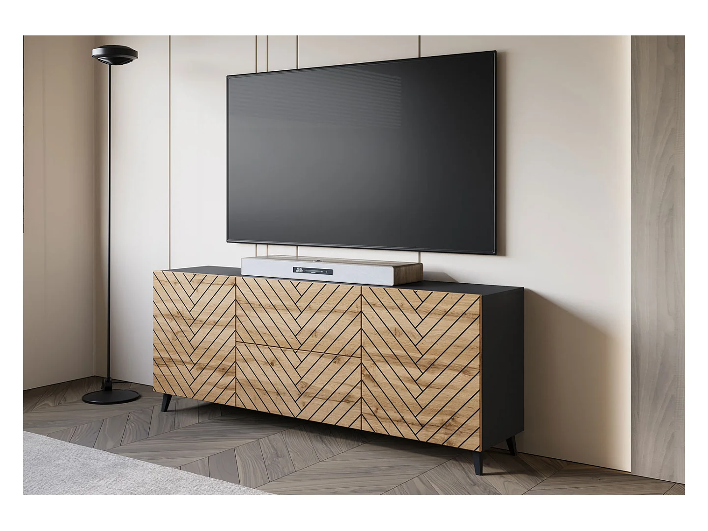 KOMMODE Phuket Graphit Schwarz / Wotan Eiche Fischgrätenmuster 180 / 39 / 69cm