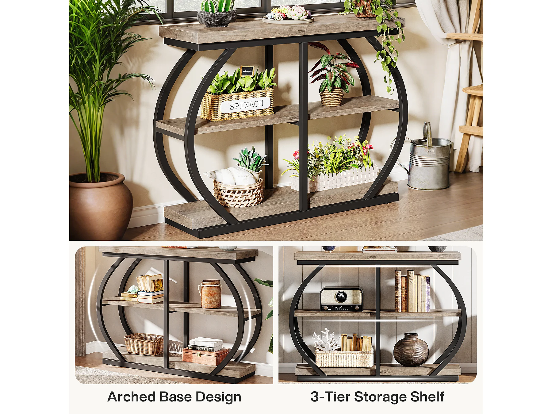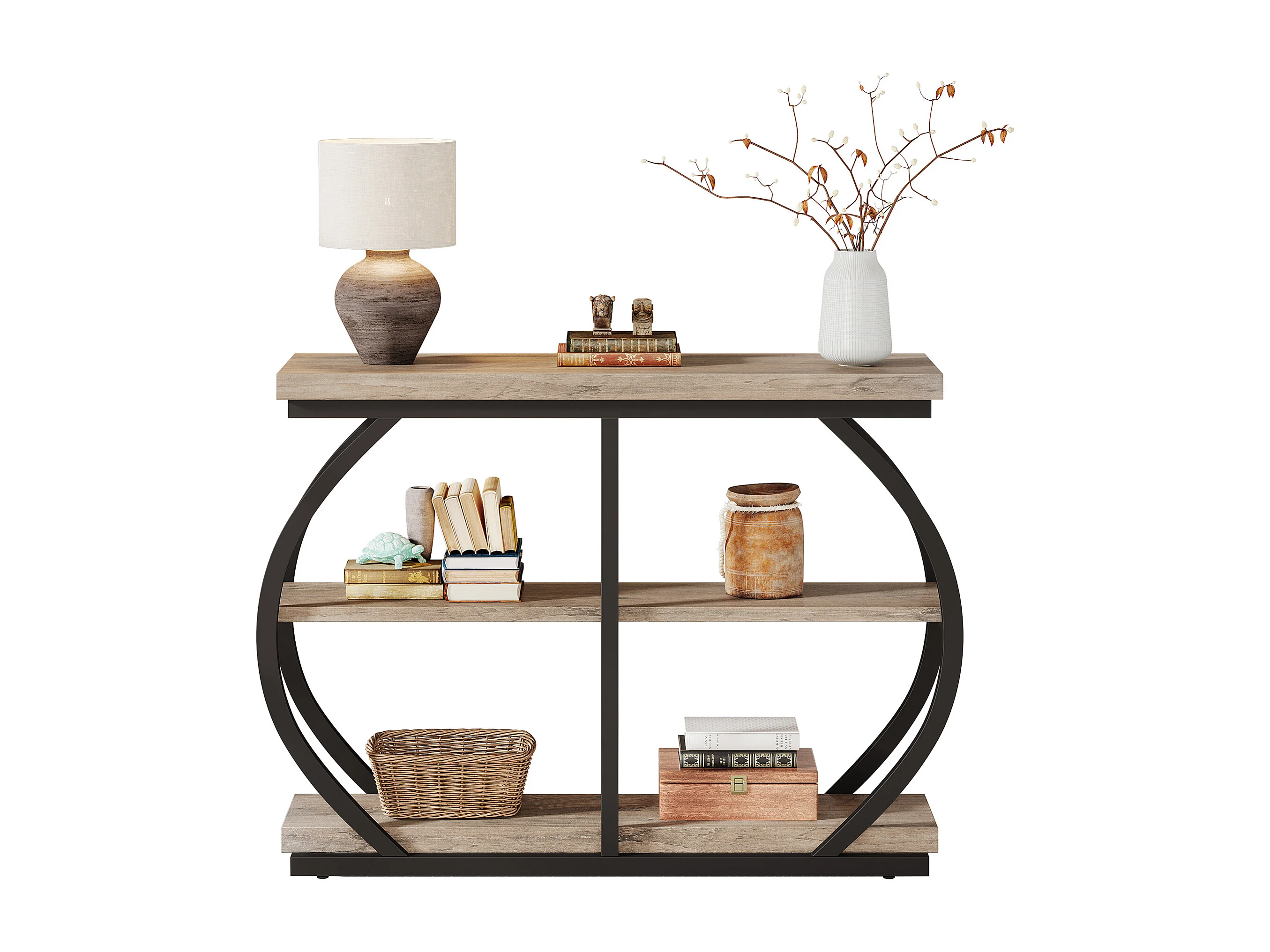 Konsole Tisch 105cm, Industrieel 3-Etagen Garderobentisch mit gewölbtem Metallrahmen und Ablageschränken