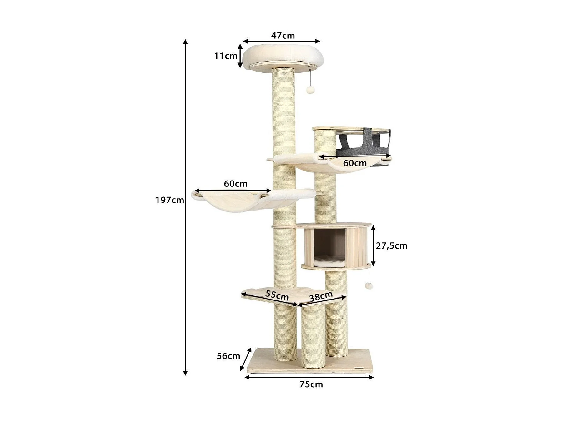197 cm 7-stöckiger Holz Kratzbaum mit Hängematte & Katzenhöhle & Hängekorb & Bällen Katzenbaum