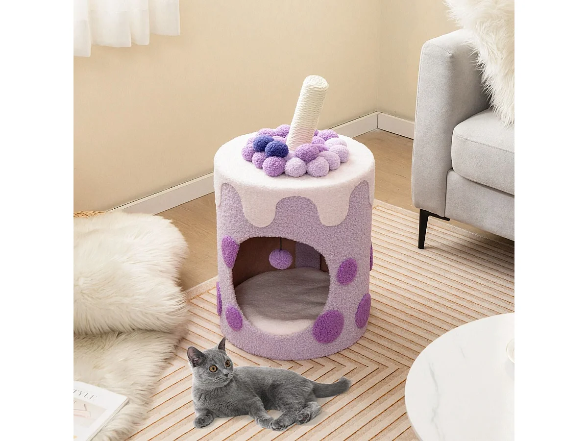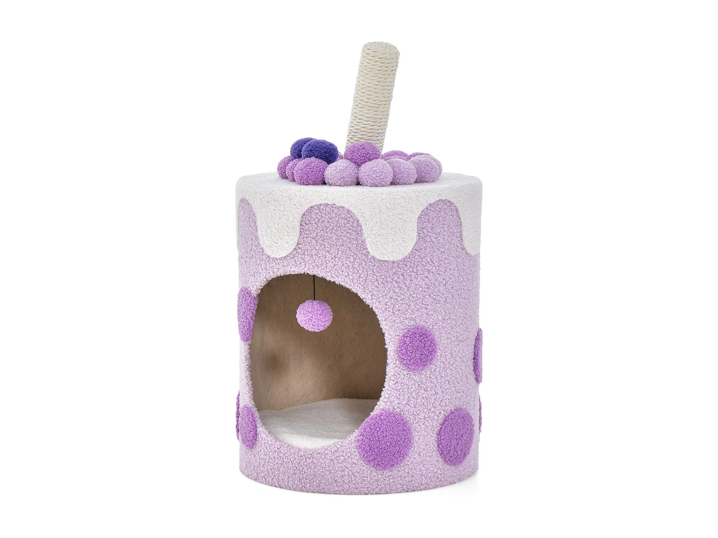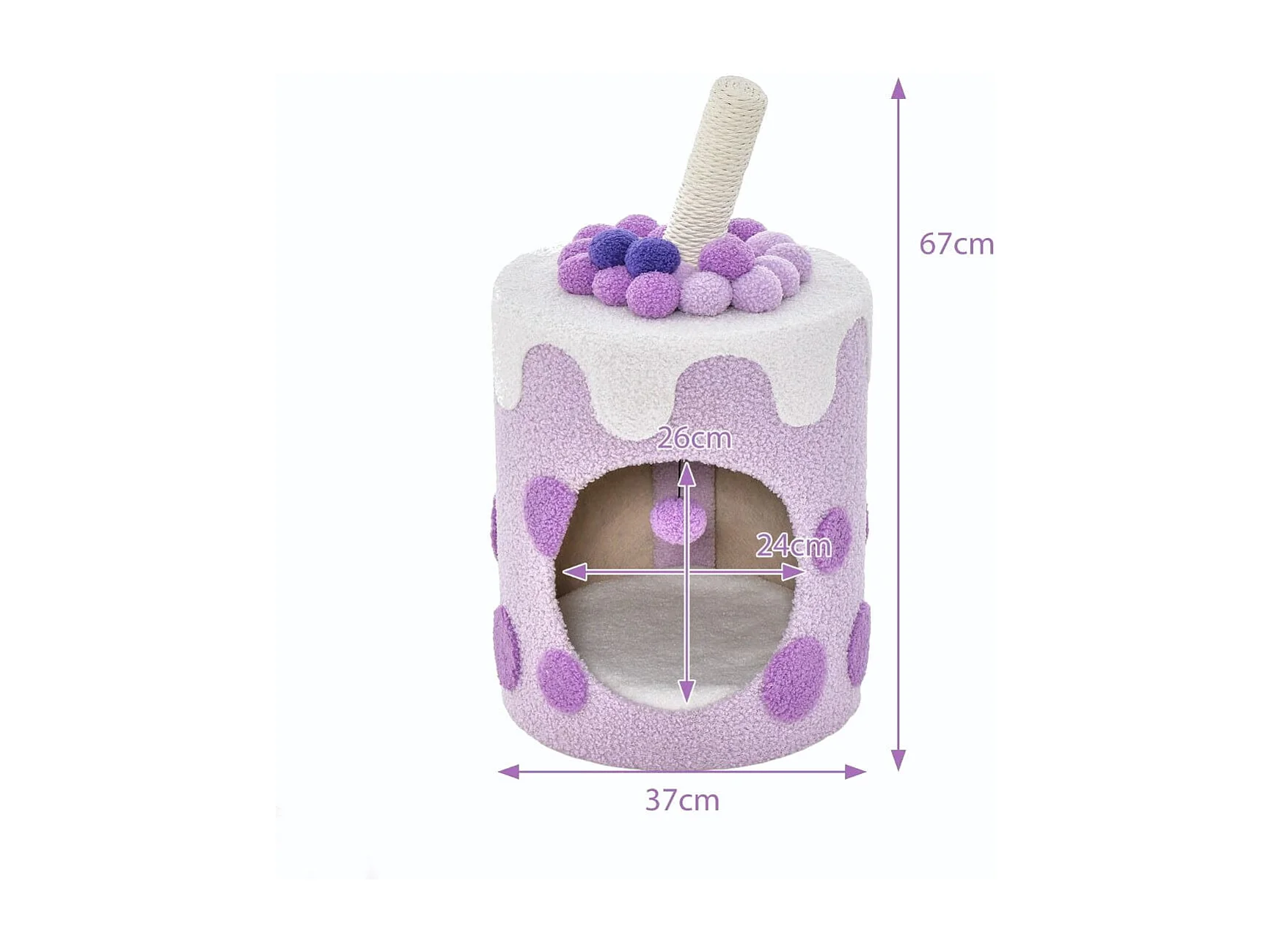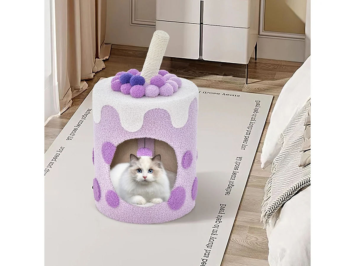 Kratzbaum Kratztonne in Milchteeform mit Sisalpfosten & baumelndem Ballspielzeug Lila
