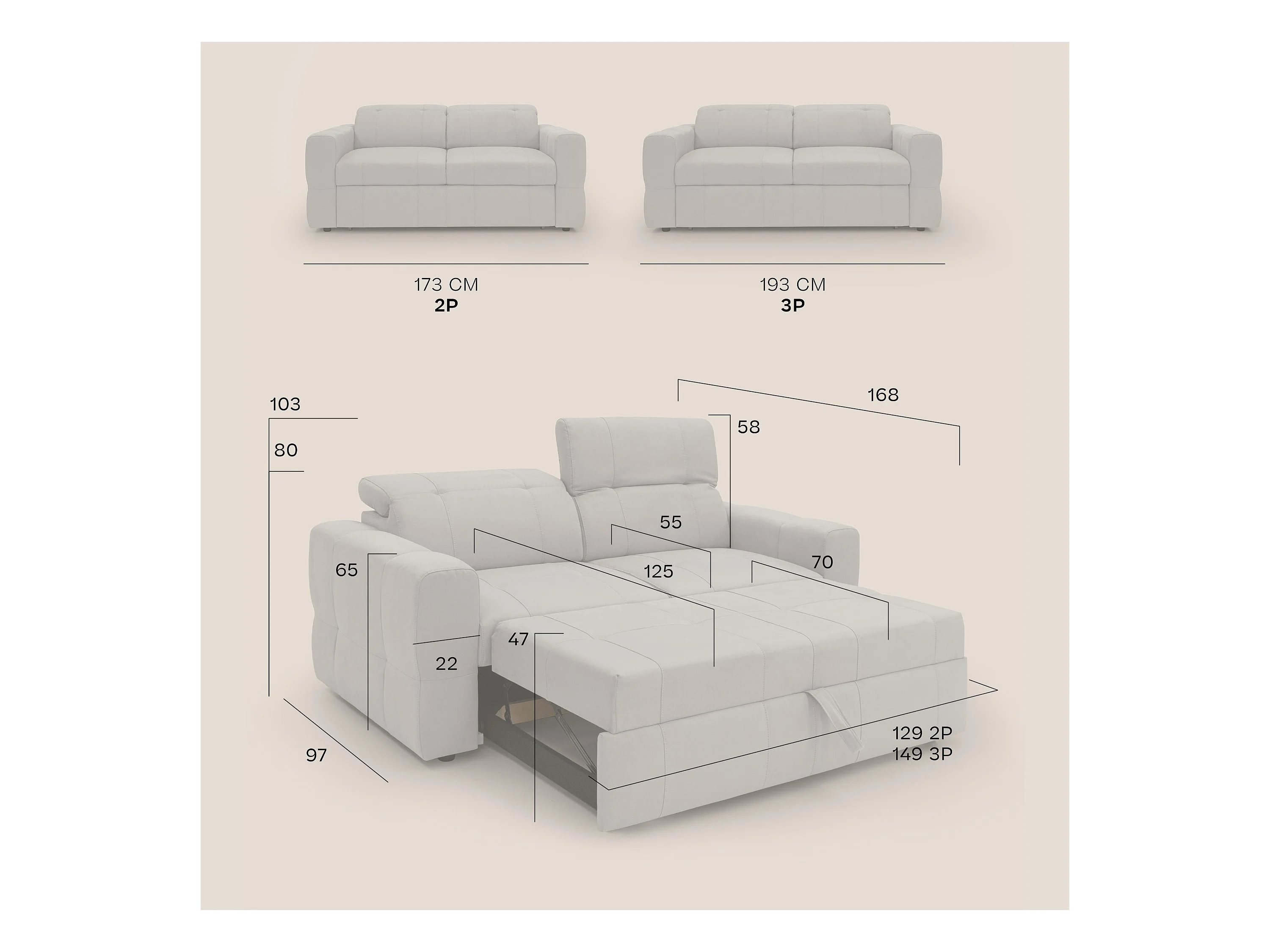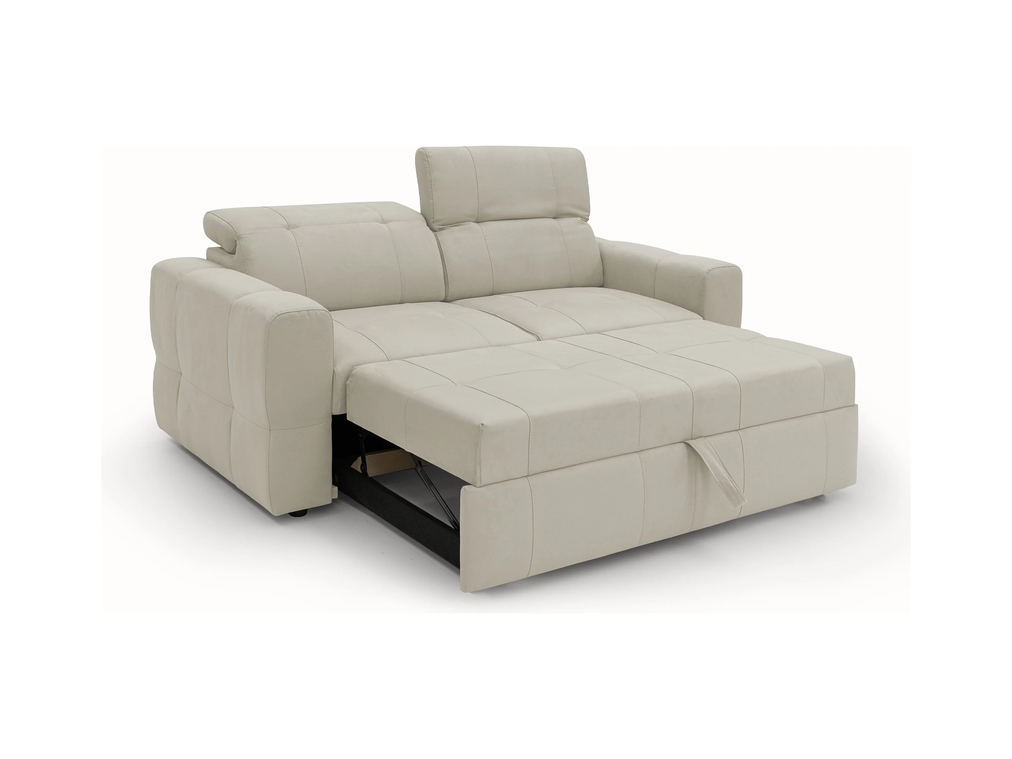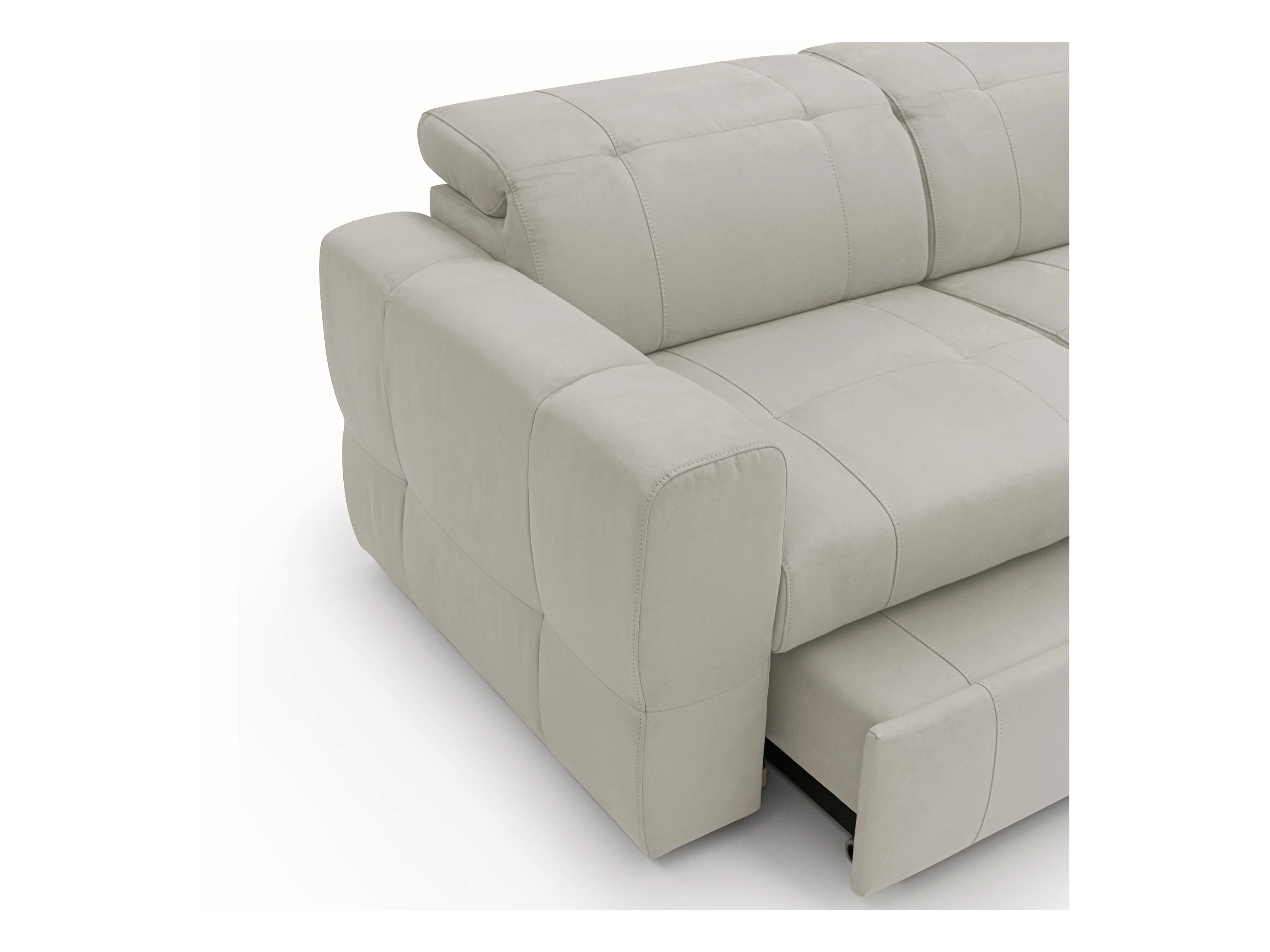 Kronos 3-SItzer-Sofa 193 cm mit ausziehbarer Ottomane und verstellbare Kopfstützen aus weicher wasserfester Mikrofaser T11 Creme