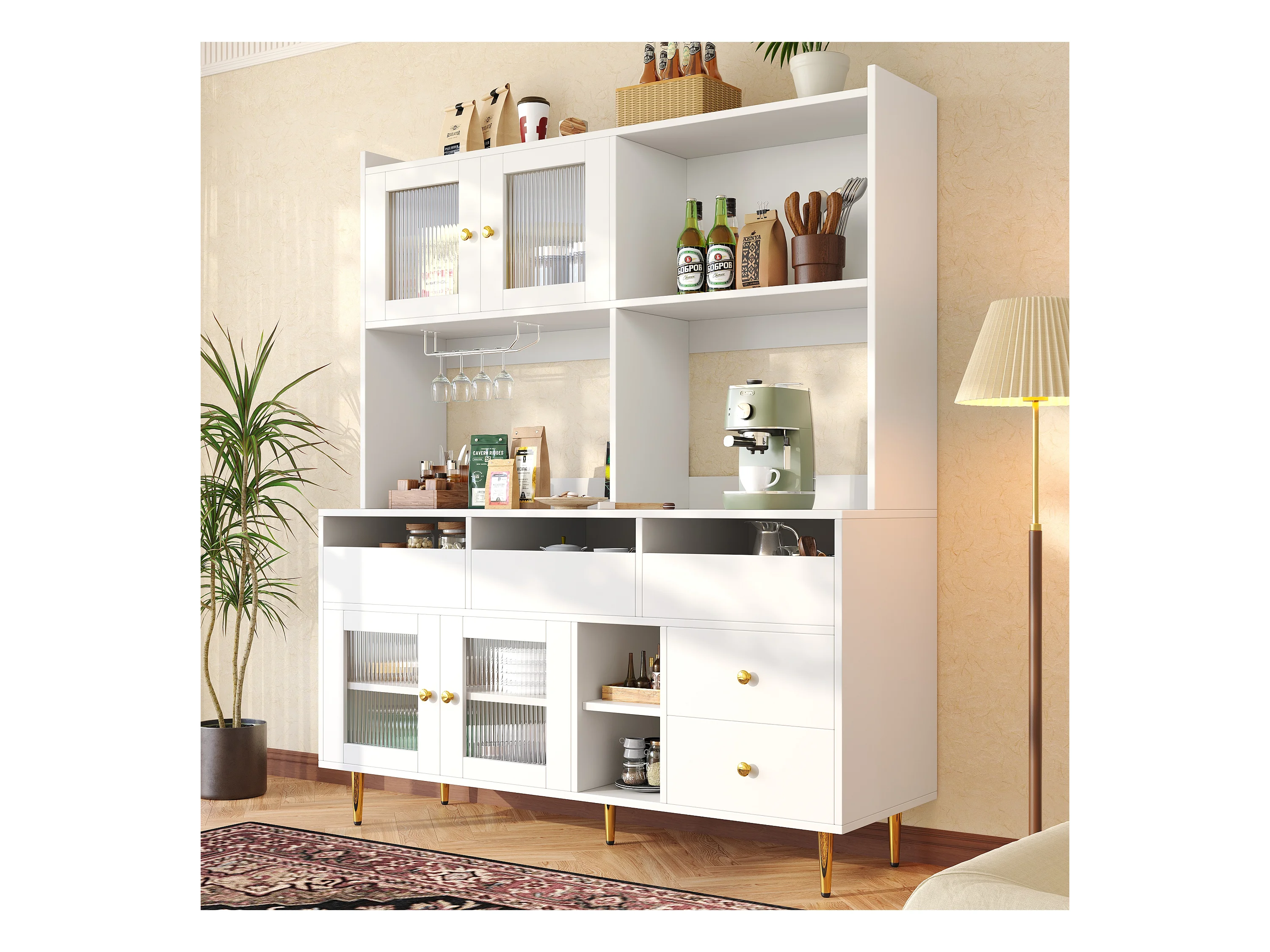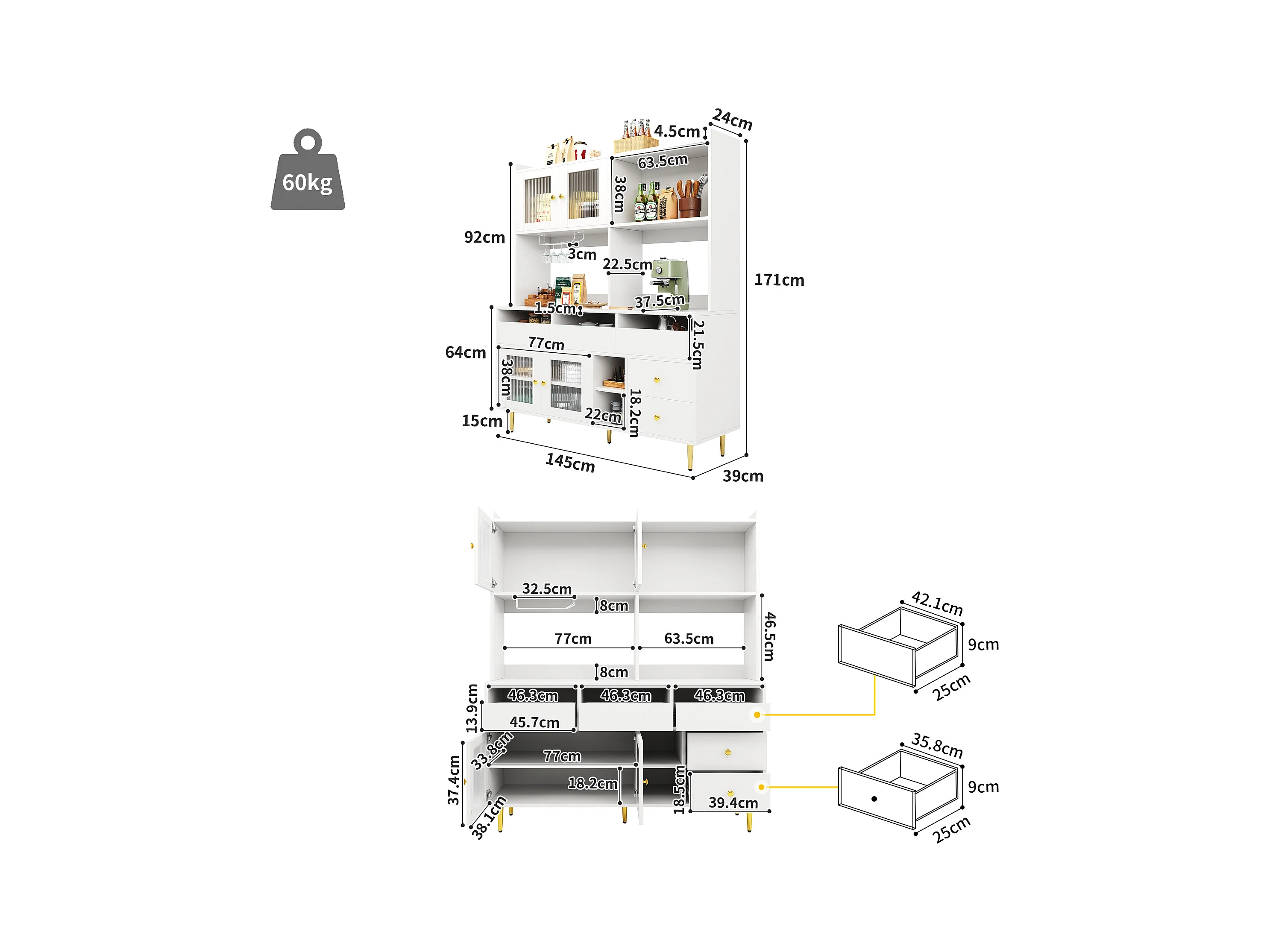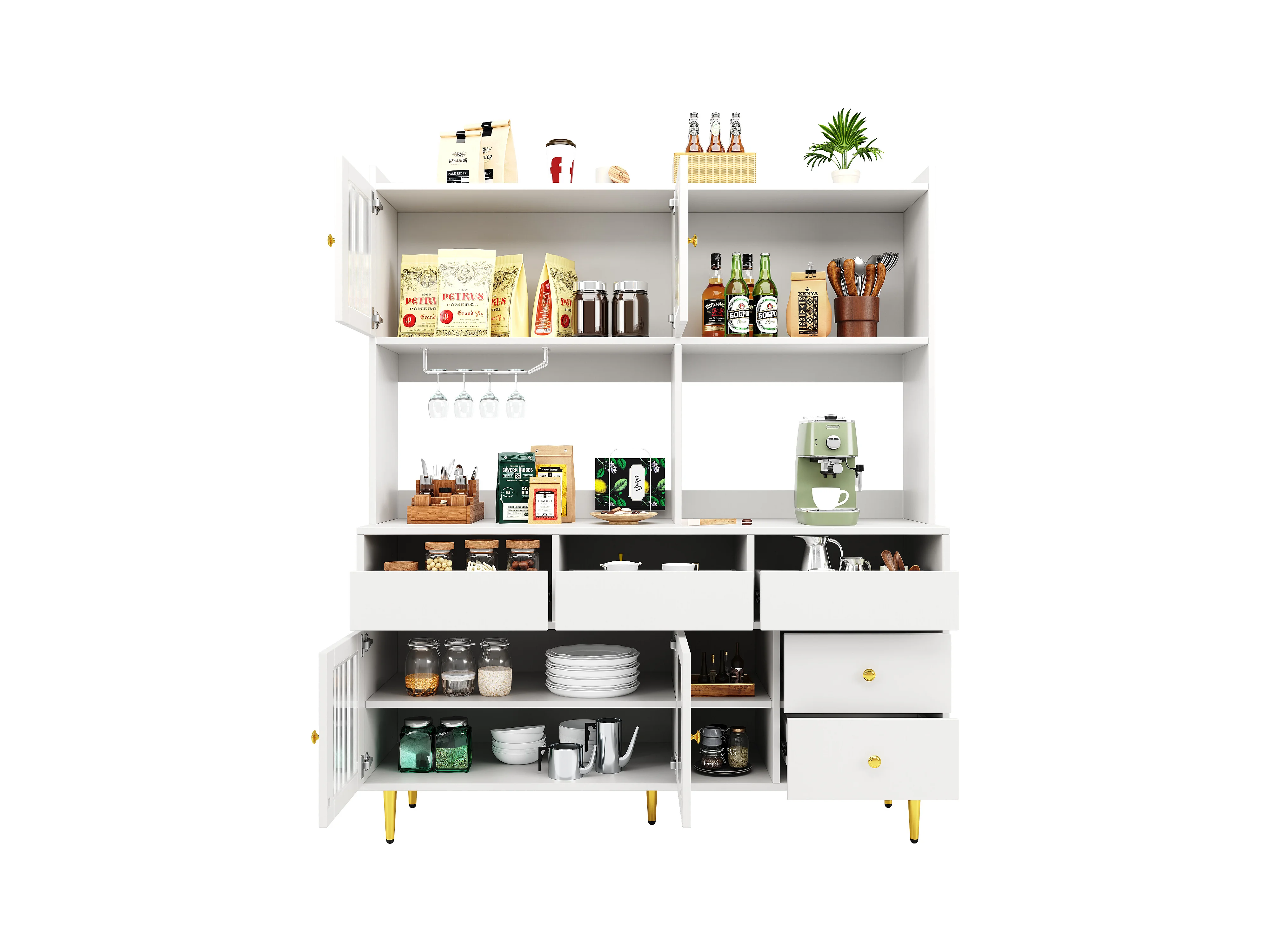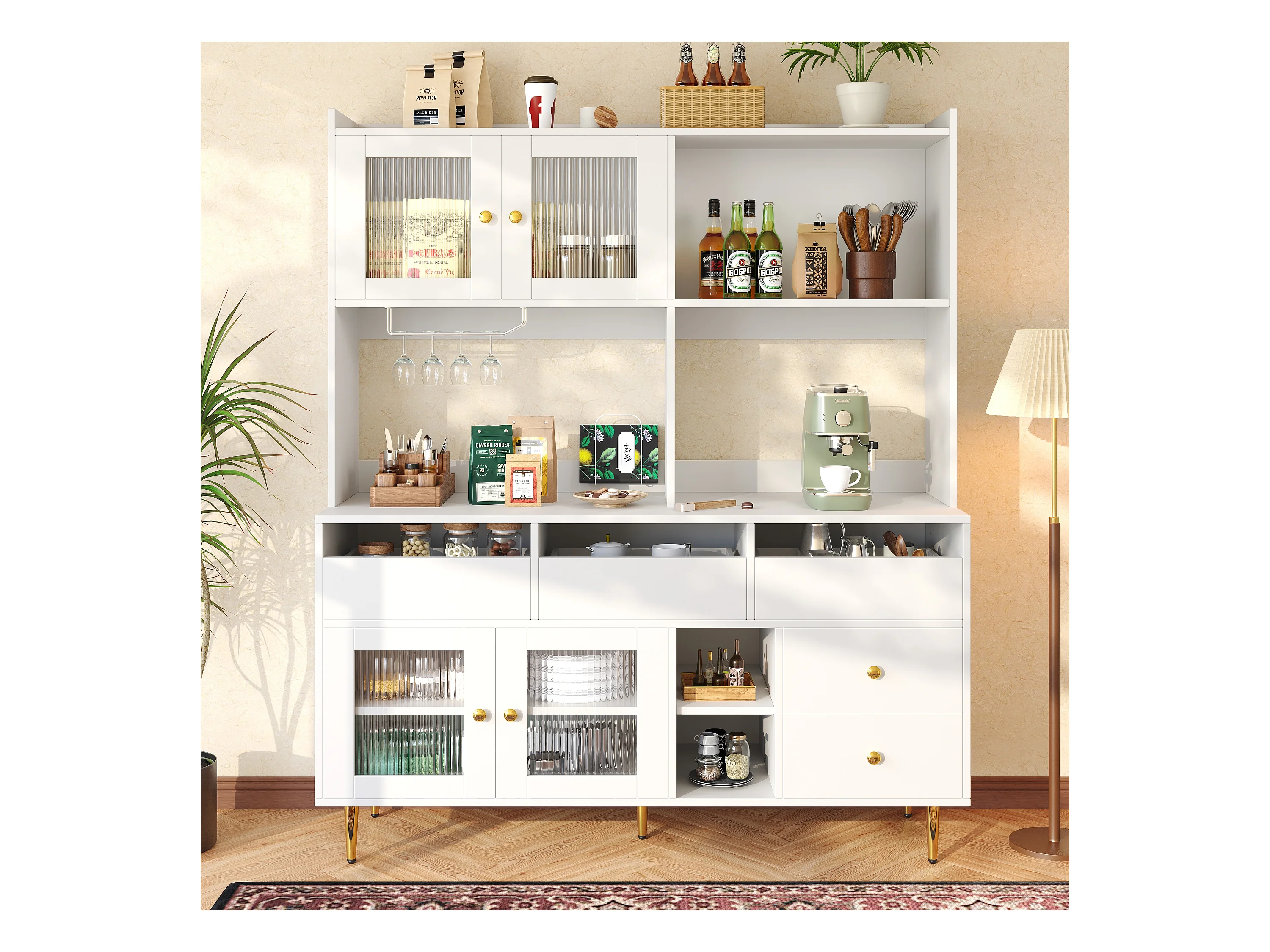 Küchen-Sideboard mit 4 Glastüren, 5 Schubladen und offenem Fach – 145 x 39 x 171 cm – MDF-Holz – Weiß