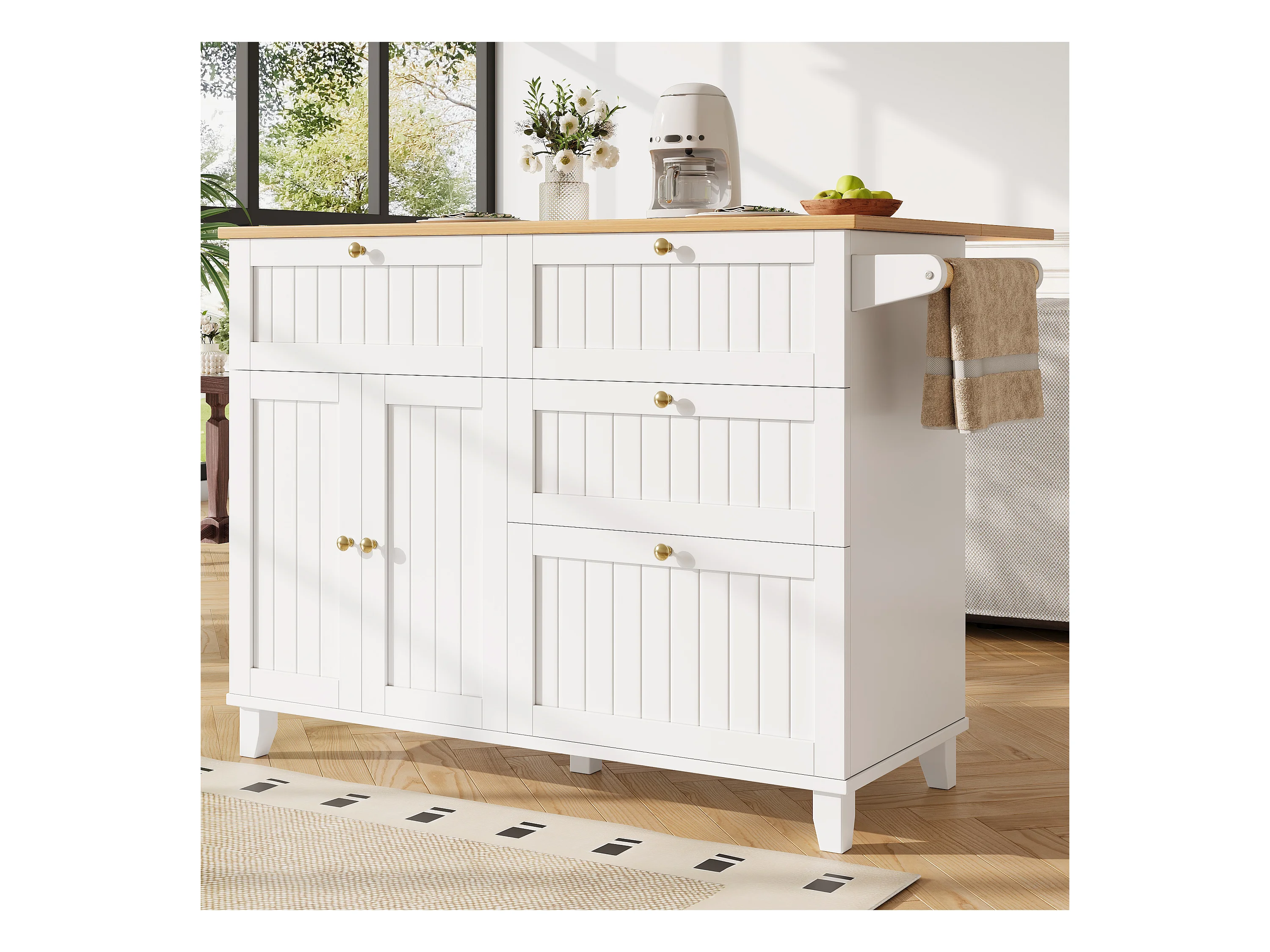 Kücheninsel auf Rollen – 133 x 70 x 88 cm – Servierwagen mit Auszügen, 3 Schubladen und 3 Türen – MDF – Weiß
