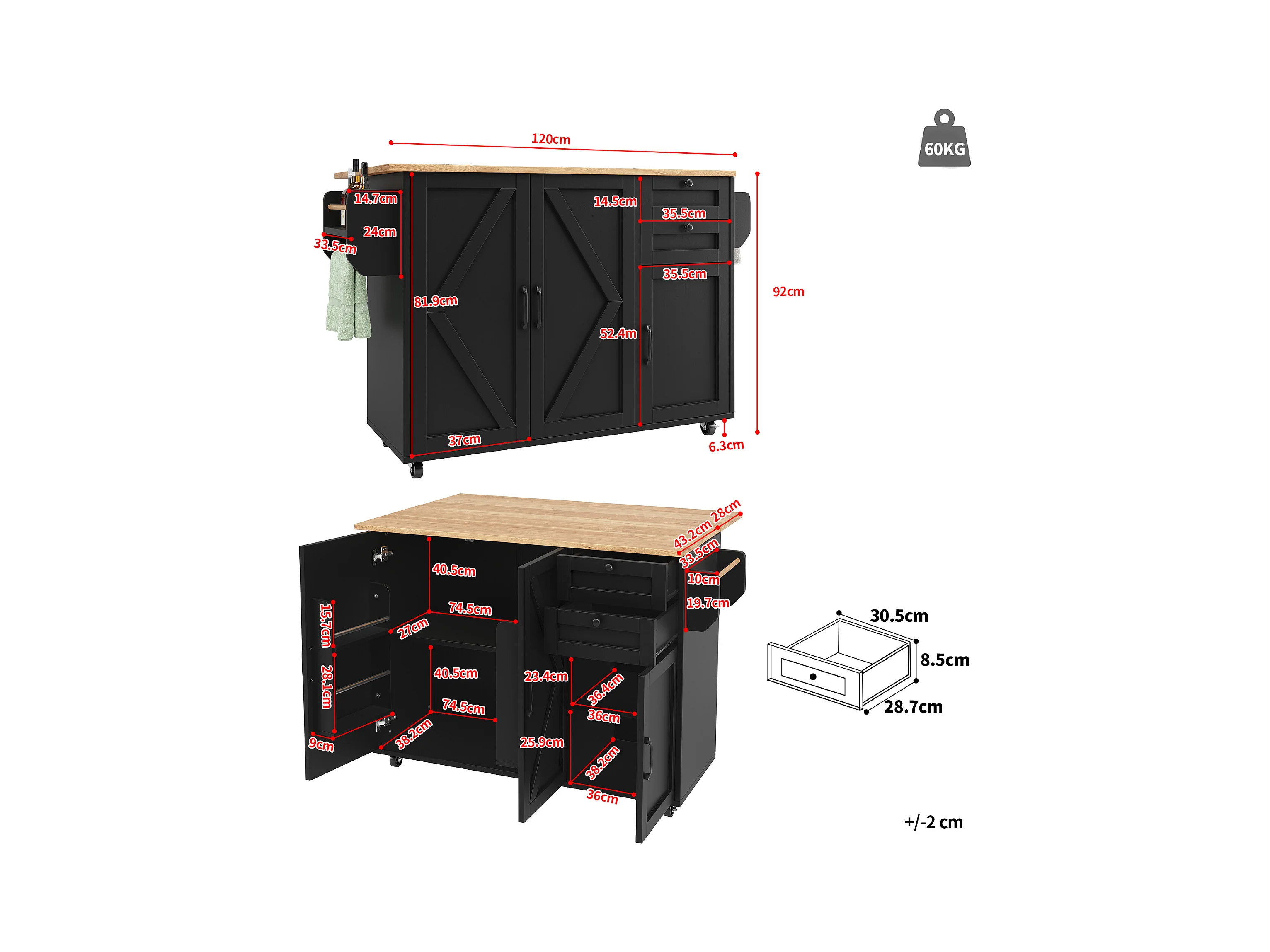 Kücheninsel auf Rollen - 140 x 43 x 92 cm - mit ausziehbarer Arbeitsplatte + 3 Türen + 2 Schubladen - Metall + MDF - schwarz