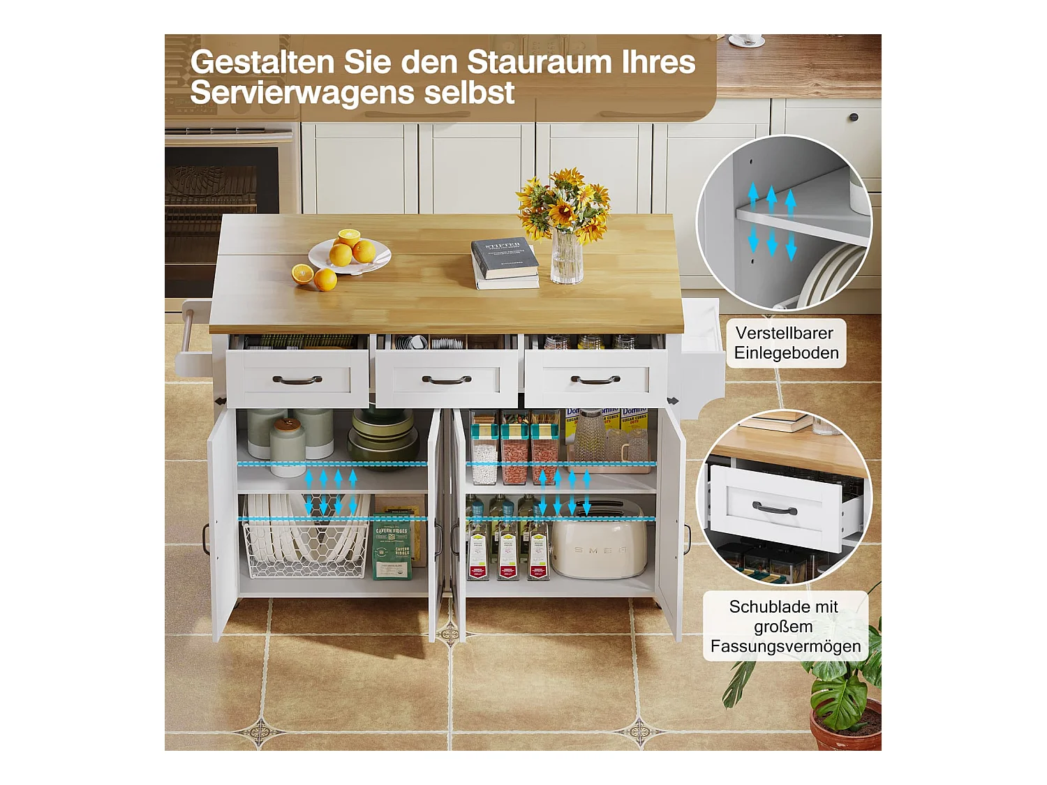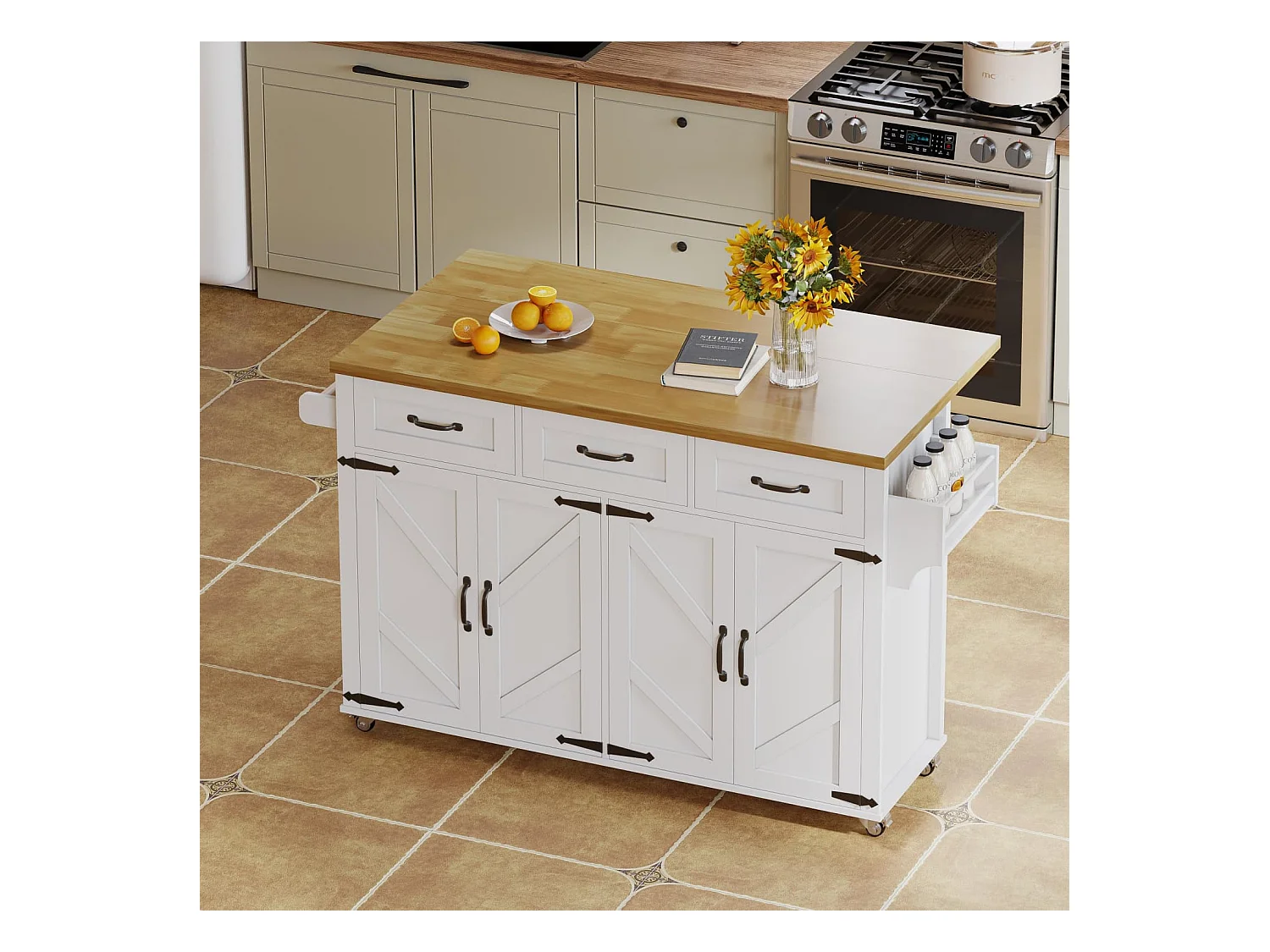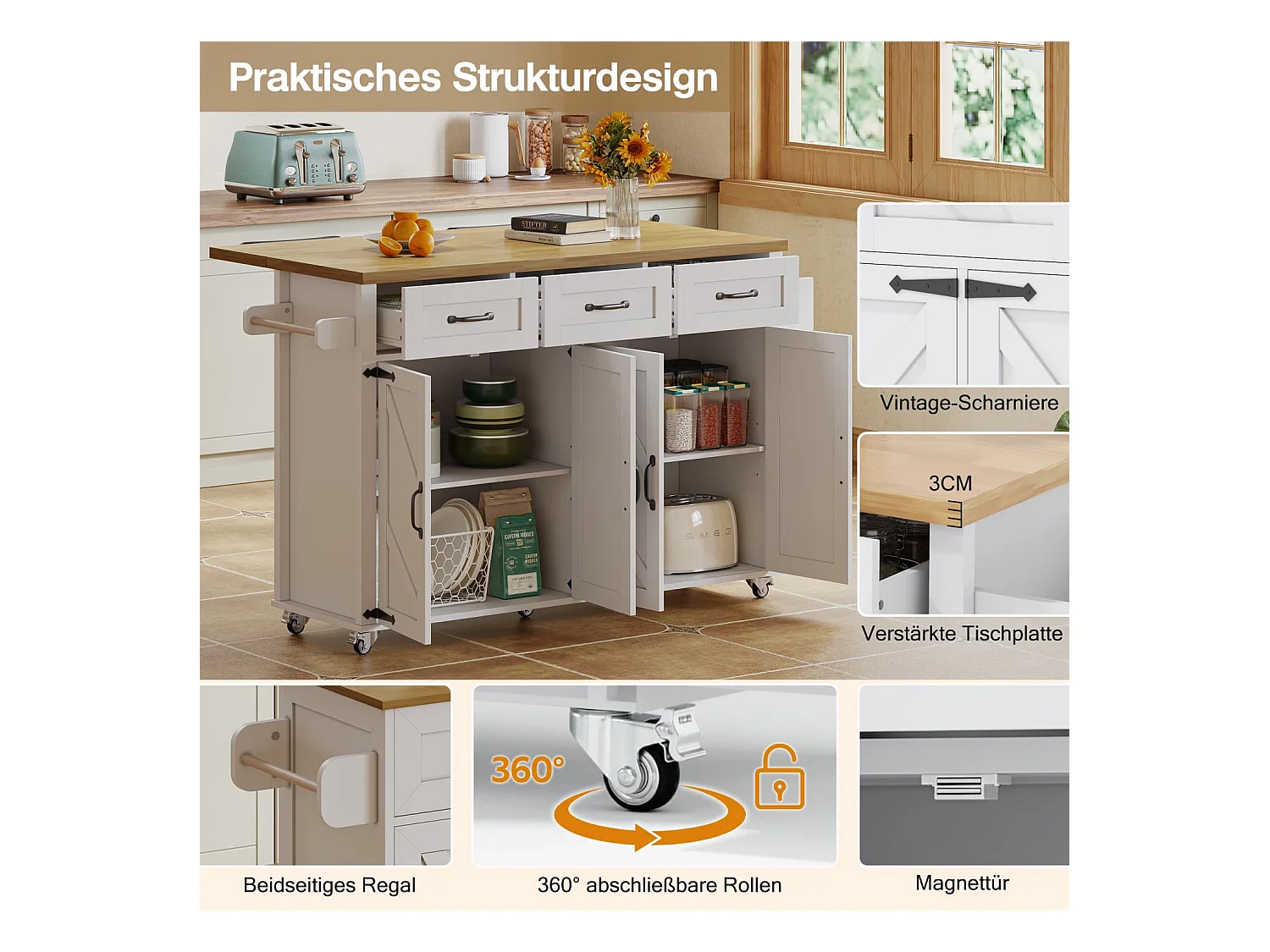 Kücheninsel mit klappbarer Arbeitsplatte,ausgestattet mit 5 feststellbaren Rollen,4 Türen,3 Schubladen,doppelseitigen Handtuchhalter,140x43/70x90.5cm