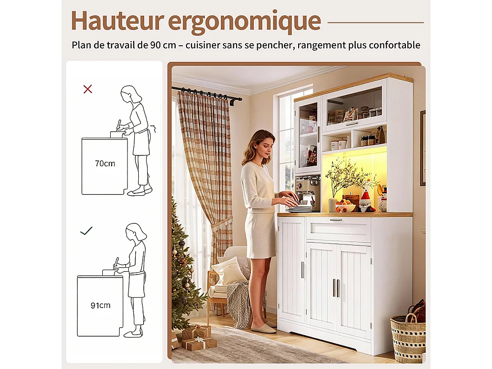 Küchenschrank, Oberschrank/Vitrine mit LED-Beleuchtung, 104x40x180 cm, weiß