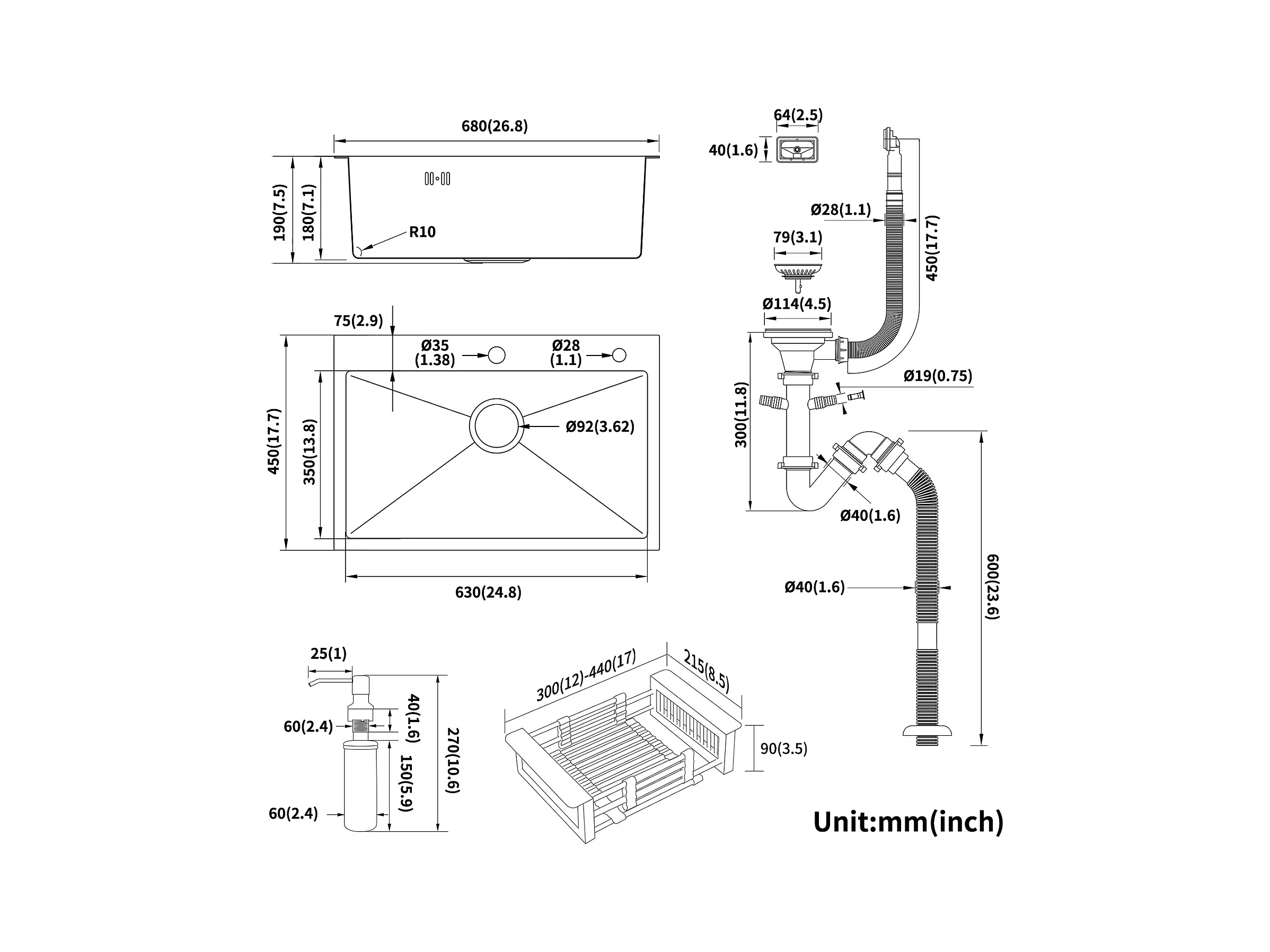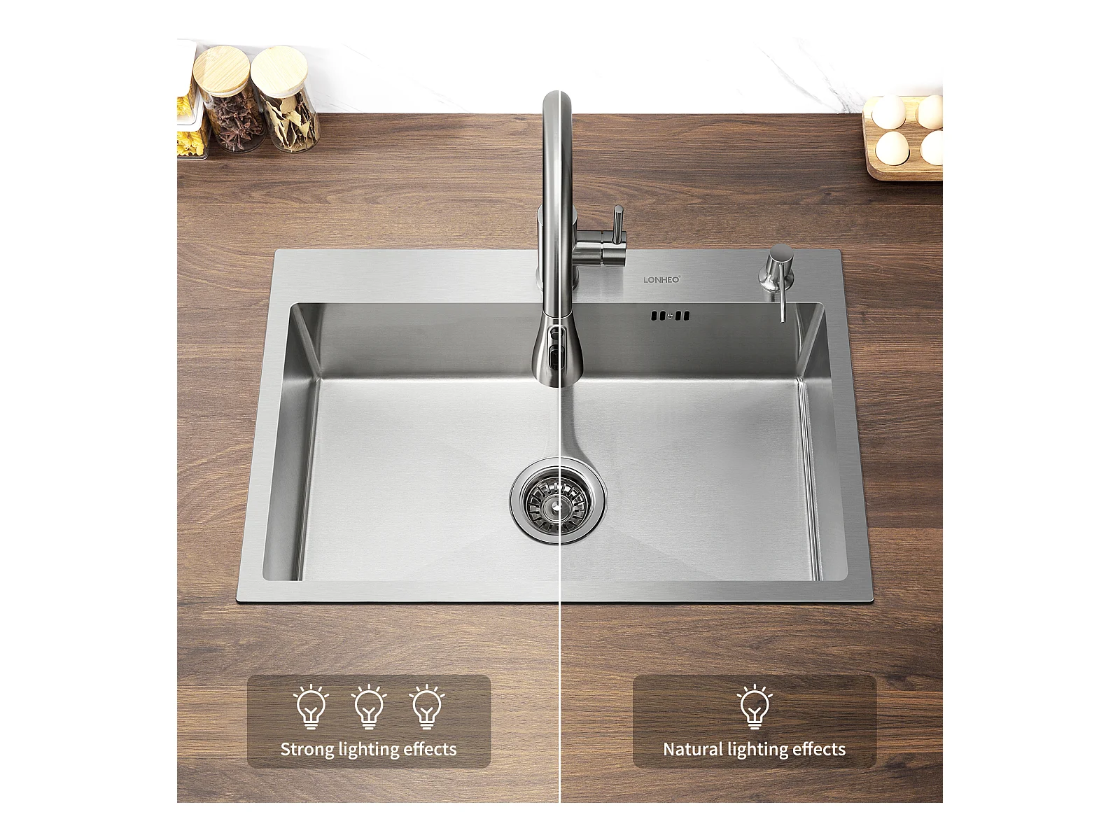 Küchenspüle 1 Becken 68*45*19CM Einbauspüle aus Edelstahl mit Überlauf, mit Seifenspender und Abtropfkorb, gebürstet, EU-Modell