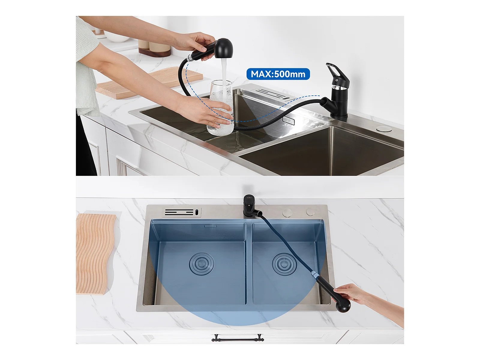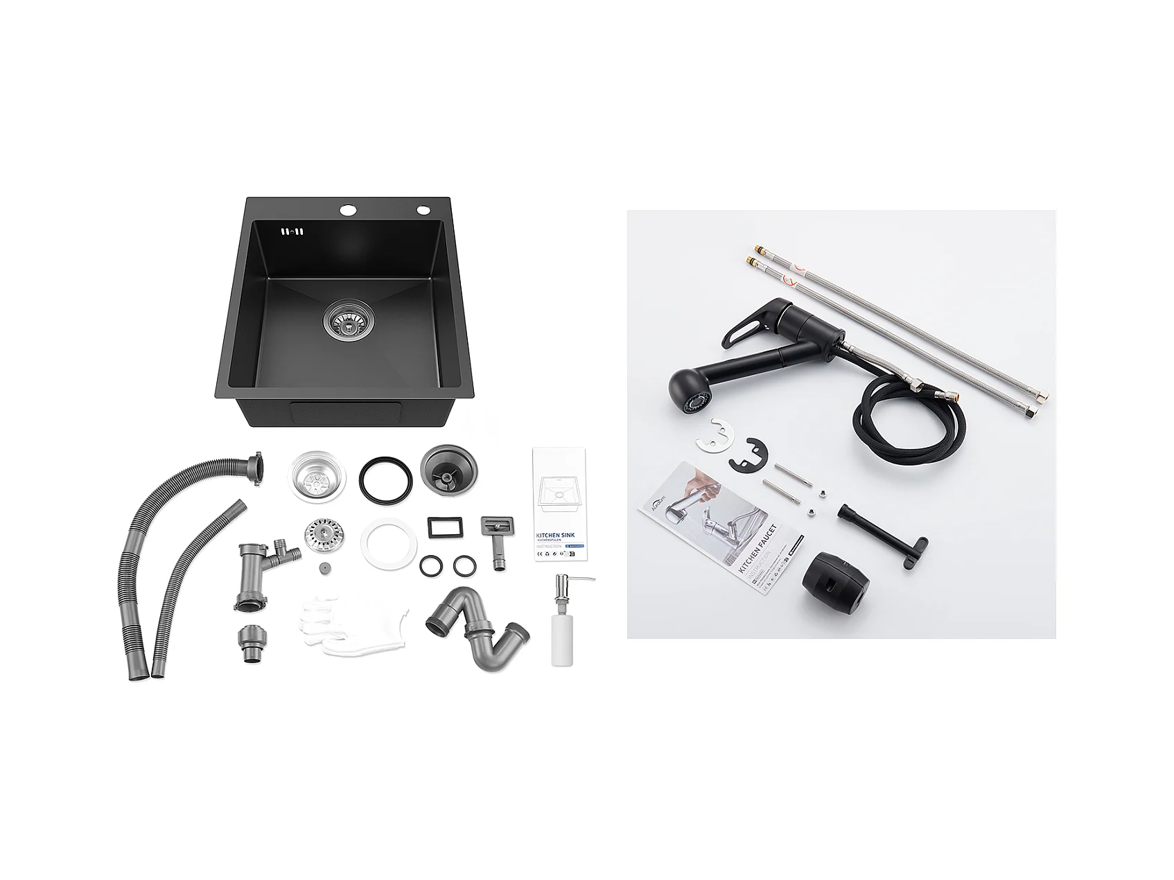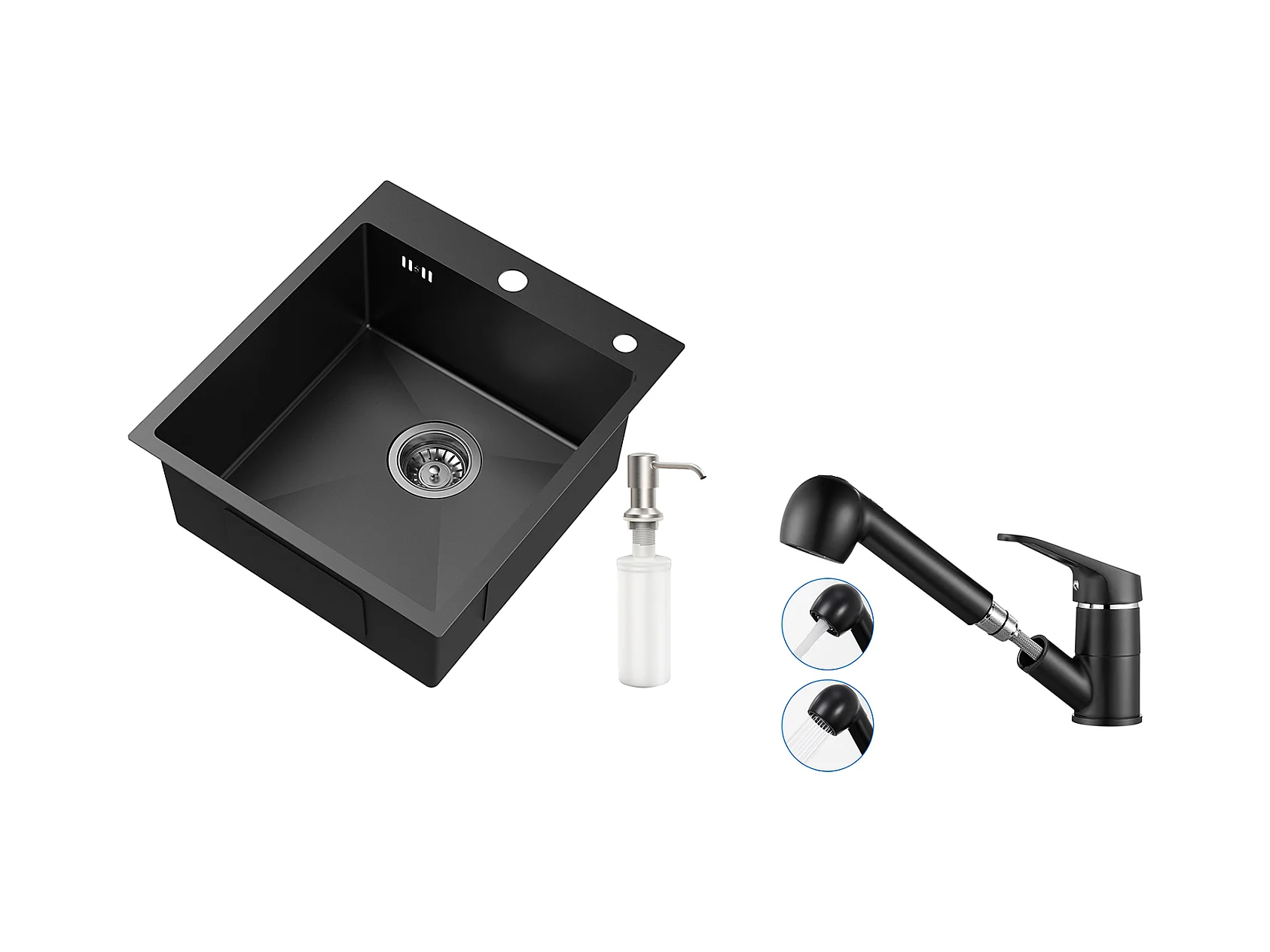 Küchenspüle 1 Becken Grau-Schwarz, Edelstahl, 44*49*20 CM, mit Seifenspender + Küchenarmatur mit ausziehbarer Brause, Warm-/Kaltwasser