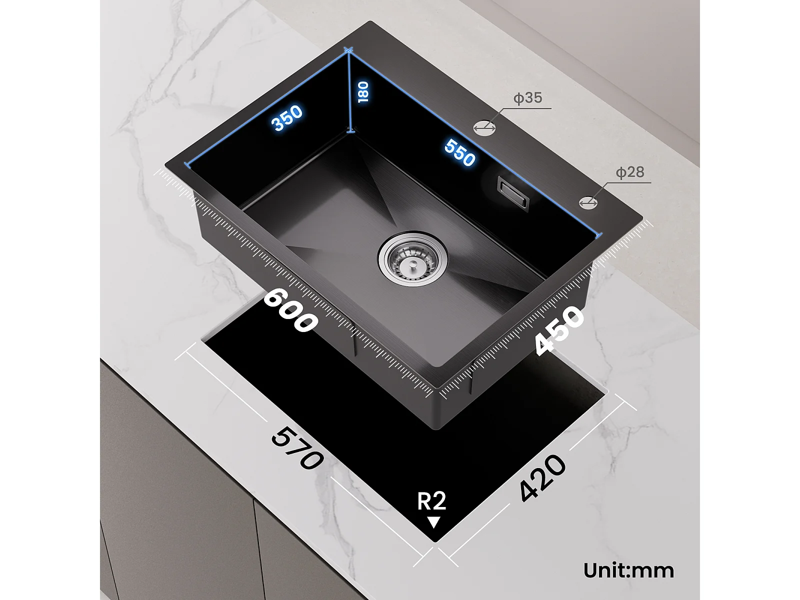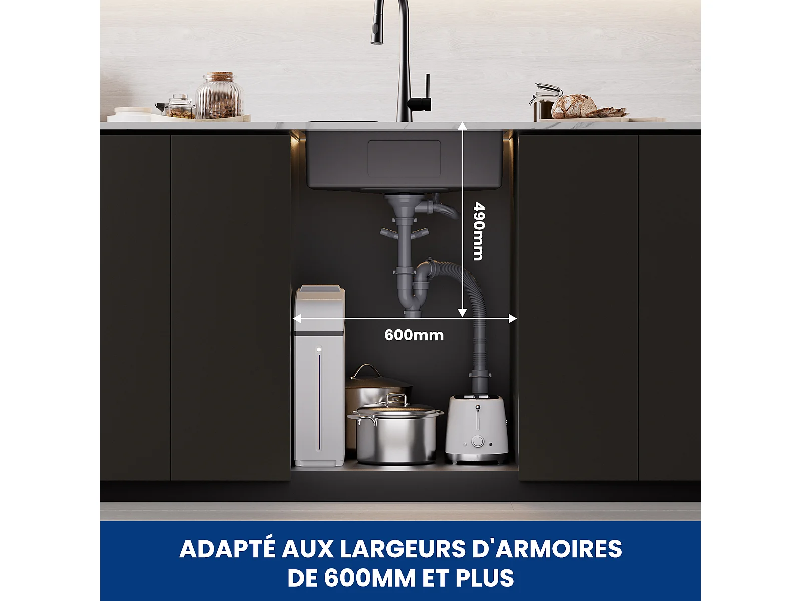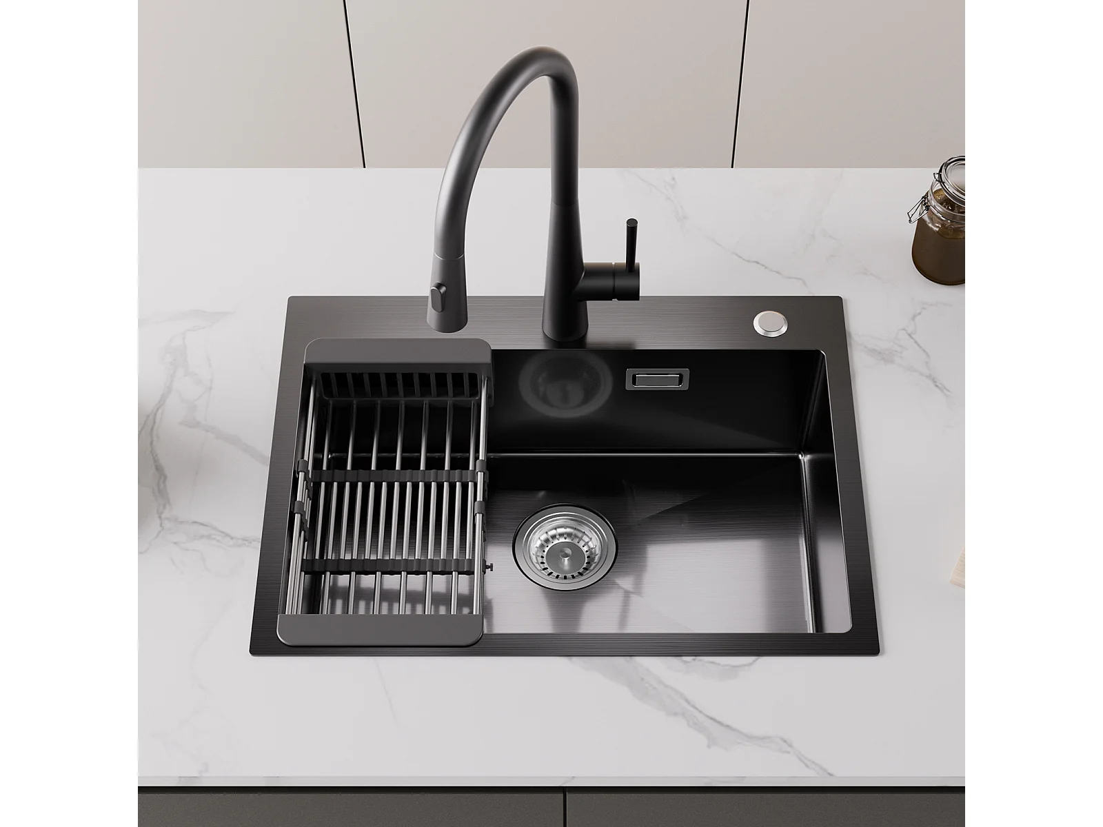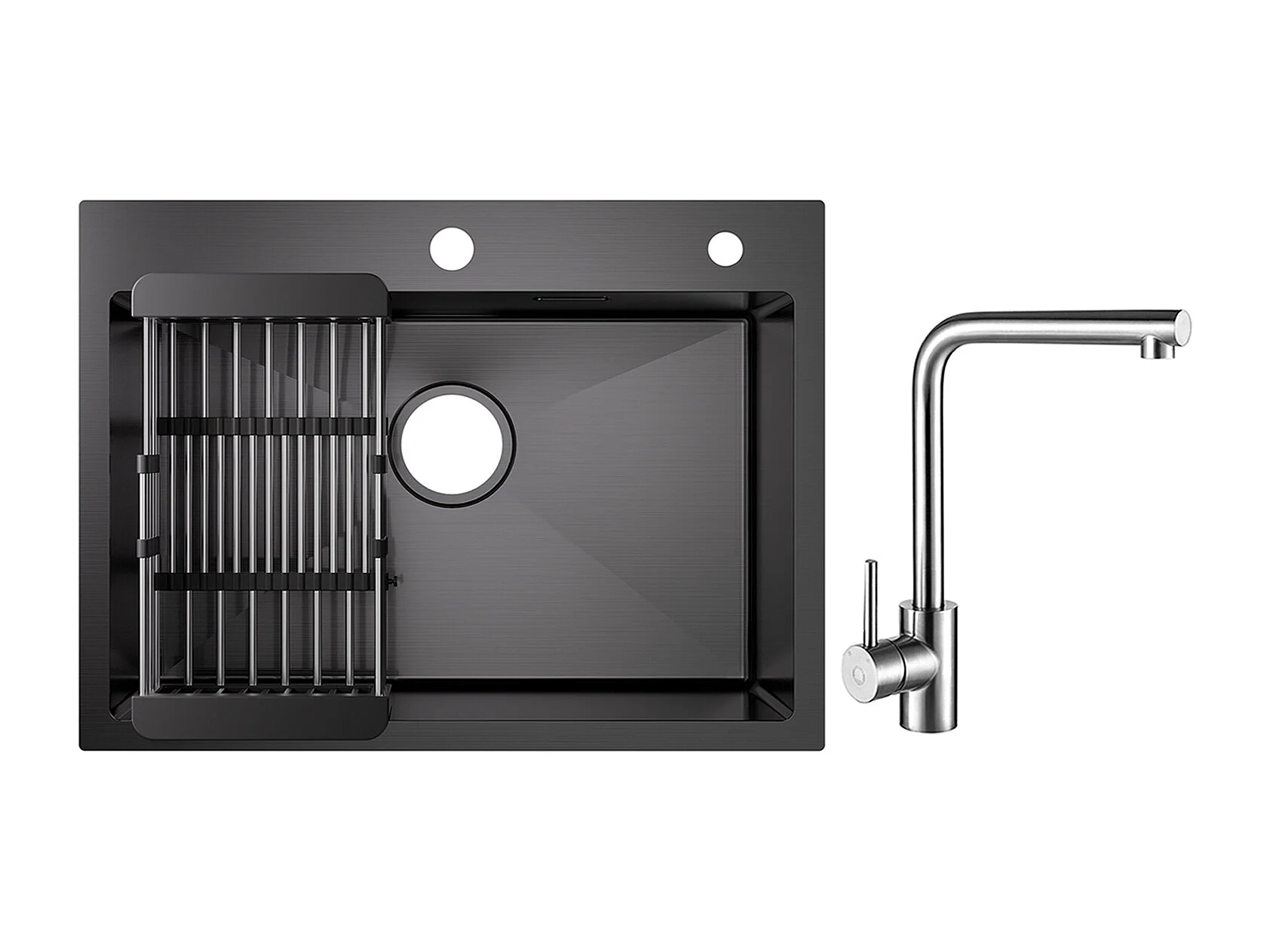 1 Becken Küchenspüle 60×45×18CM Schwarz Edelstahlspüle mit Abtropfkorb + 360° drehbarer Spültischarmatur Gebürstet