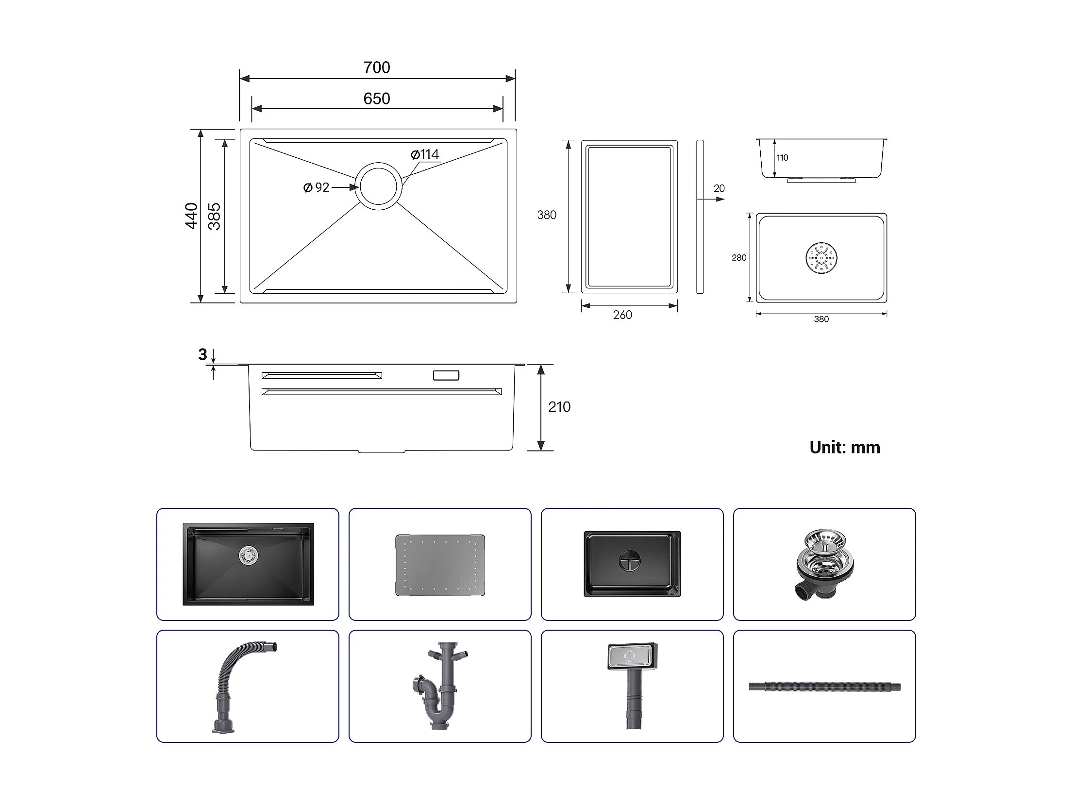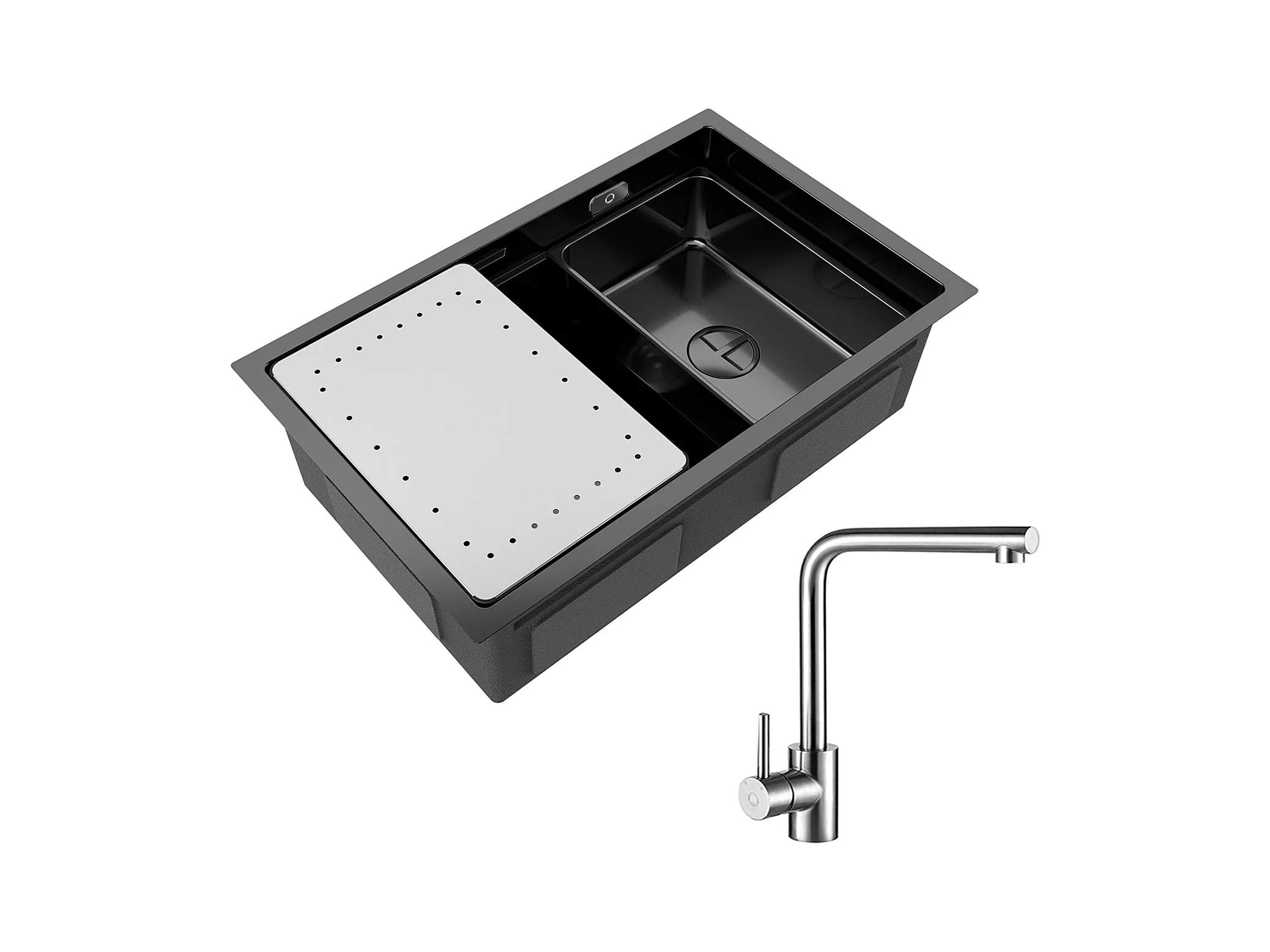 Küchenspüle 1 Becken 70×44×21CM Schwarze Edelstahlspüle mit Abtropffläche und Becken + 360° drehbare Spültischarmatur Gebürstet