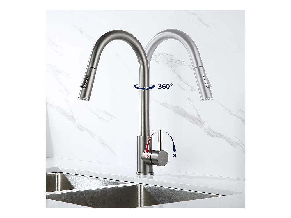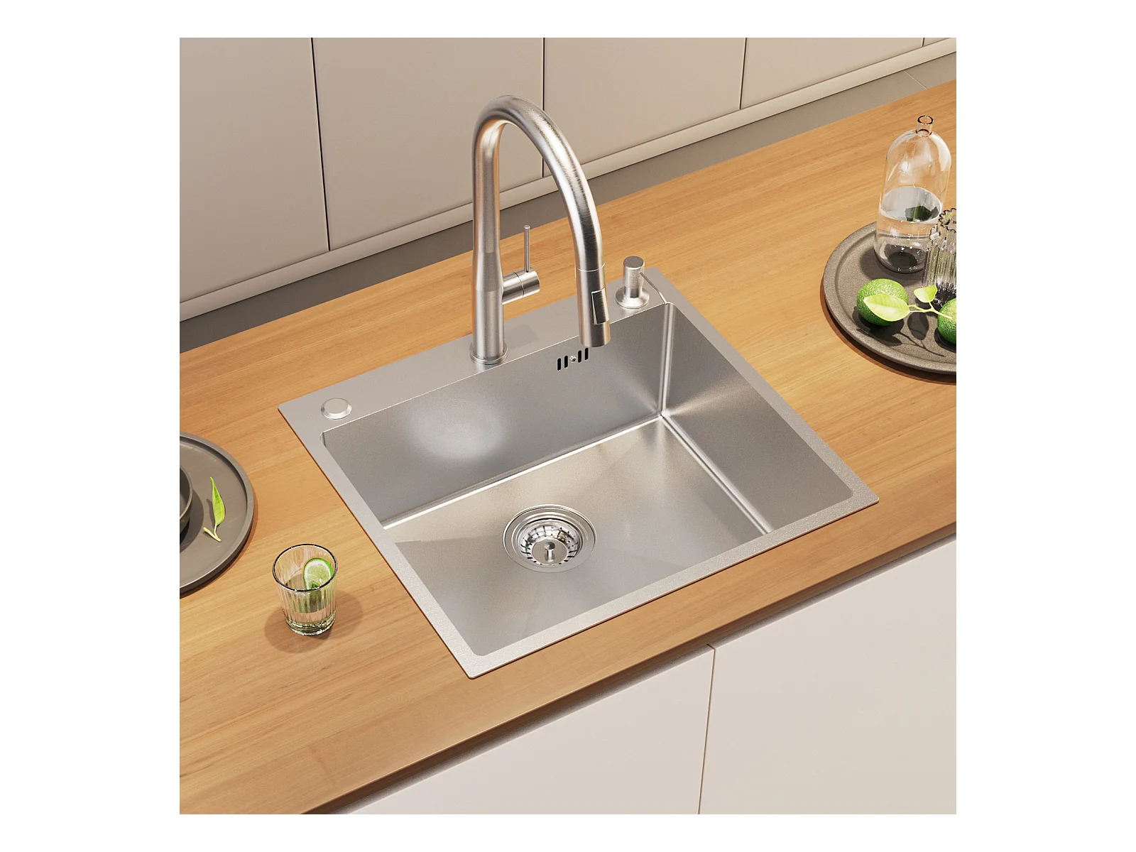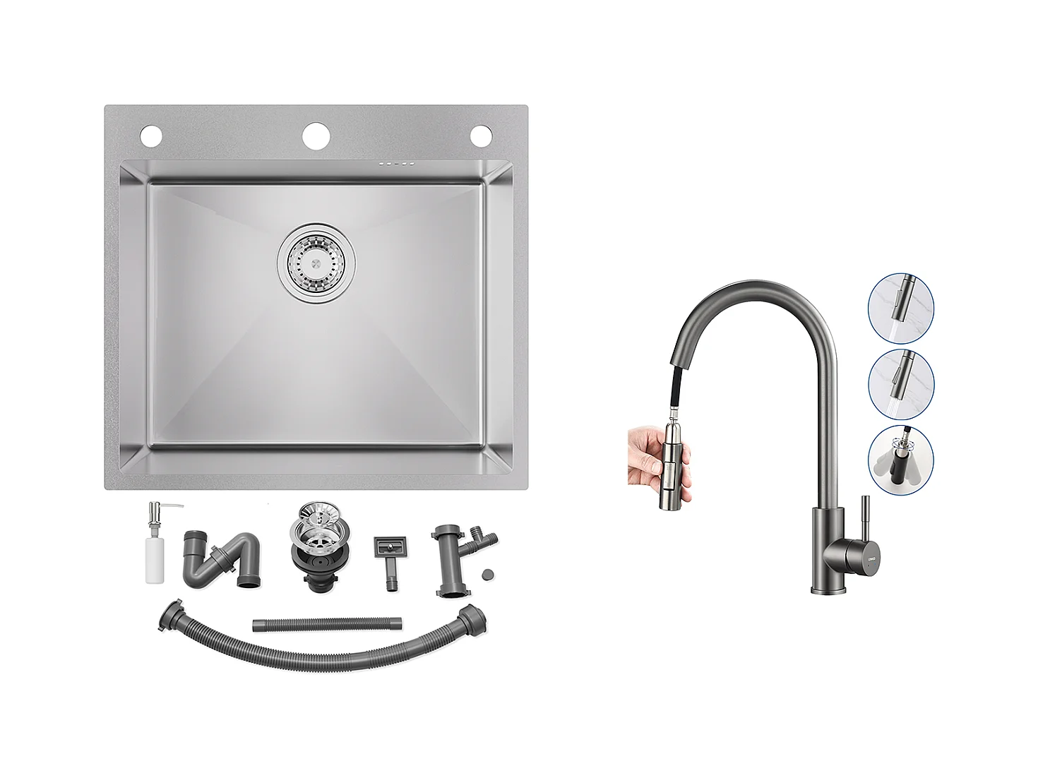 Küchenspüle 54*49*20 CM, Einbauspüle mit Seifenspender, Silber + Küchenmischbatterie mit ausziehbarer Brause Dunkelgrau
