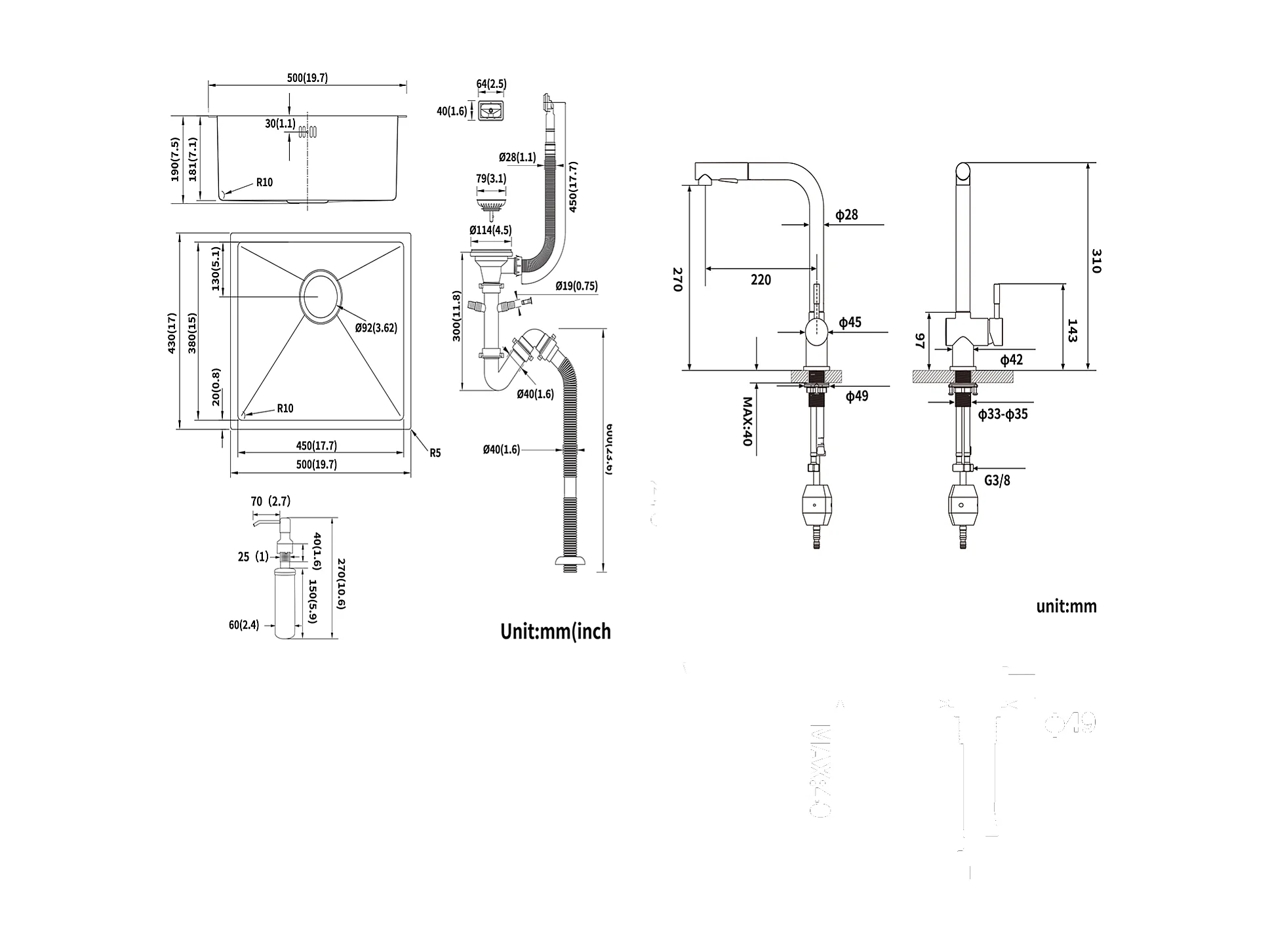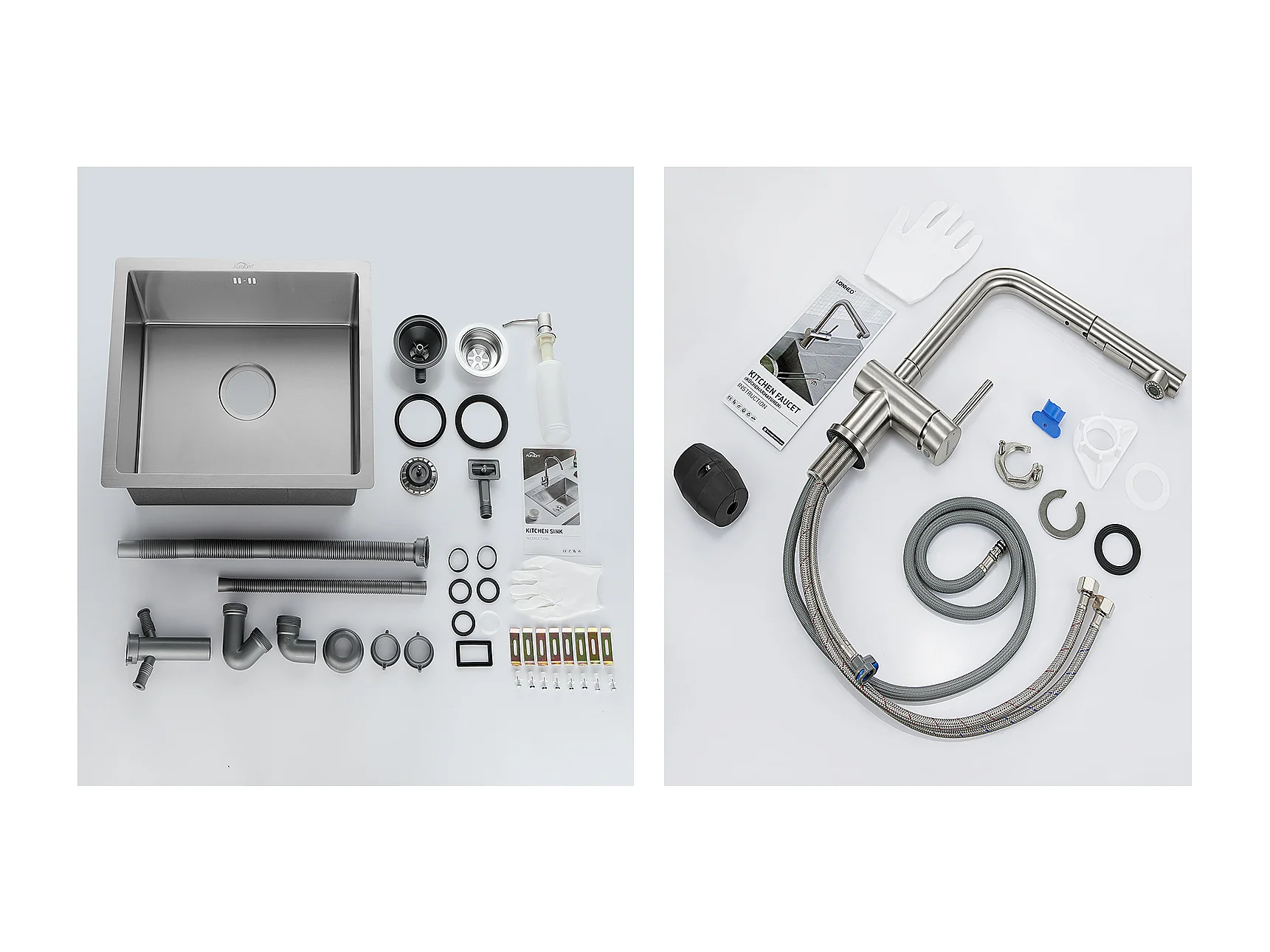 Küchenspüle aus Edelstahl, 1 Becken, 50 x 43 x 18 cm, mit Seifenspender + Küchenarmatur, ausziehbarer Brause, zwei Düsen, schwenkbar um 360°