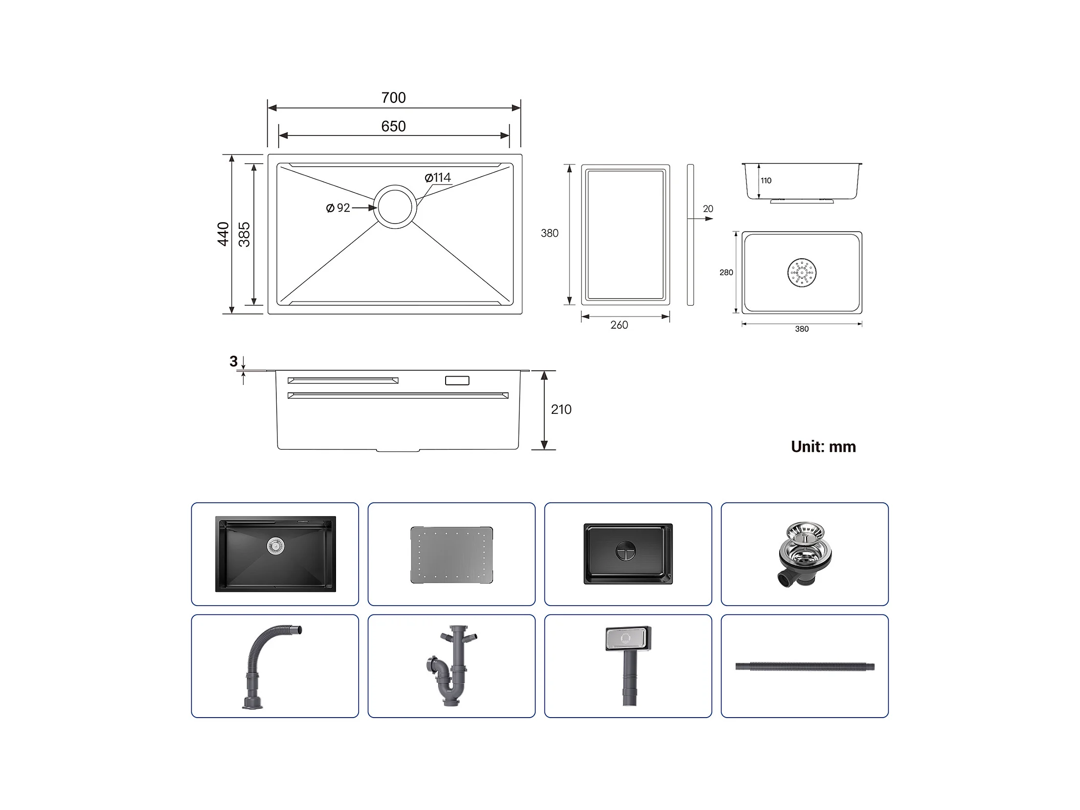 1 Becken Küchenspüle 70×44×21CM Schwarzes Edelstahlspülbecken mit Abtropffläche und Becken + wandmontierte Küchenmischbatterie mit 2 gebürsteten Düsen