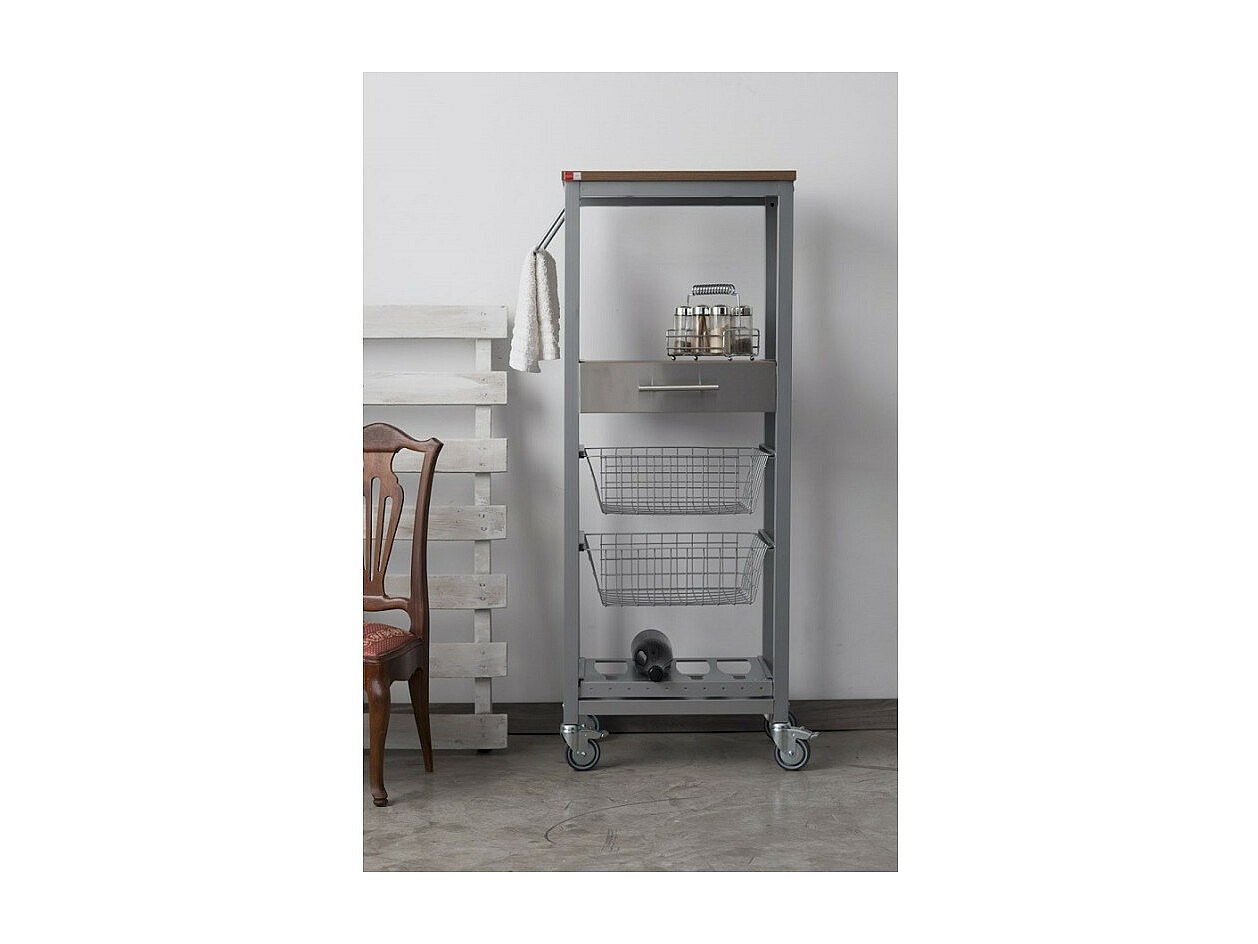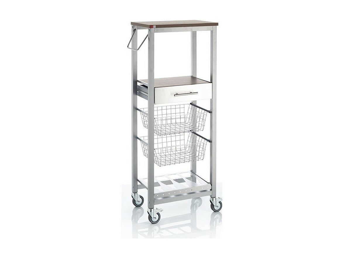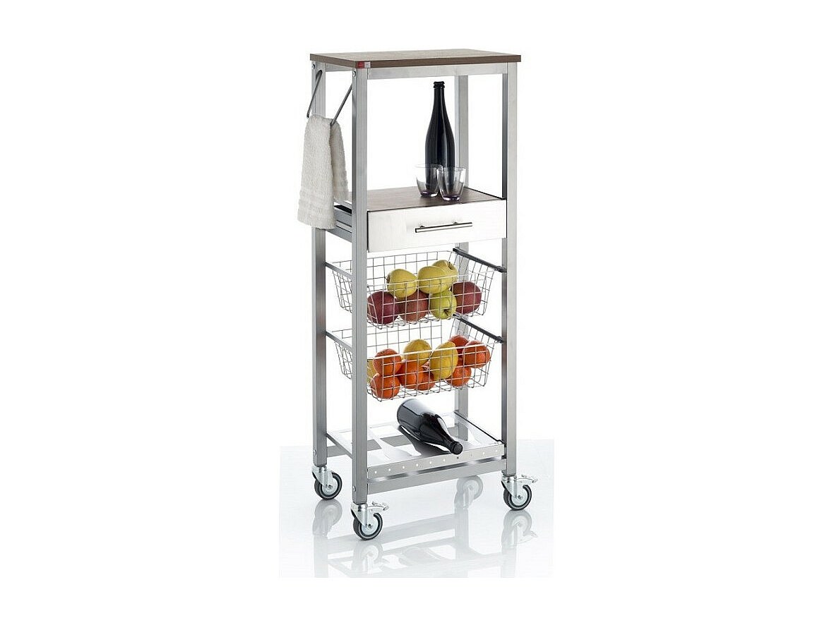 Küchenwagen ONDA ALTO – Metall-Beistellmöbel in Aluminiumoptik mit 2 Körben, Schublade und Flaschenhalter