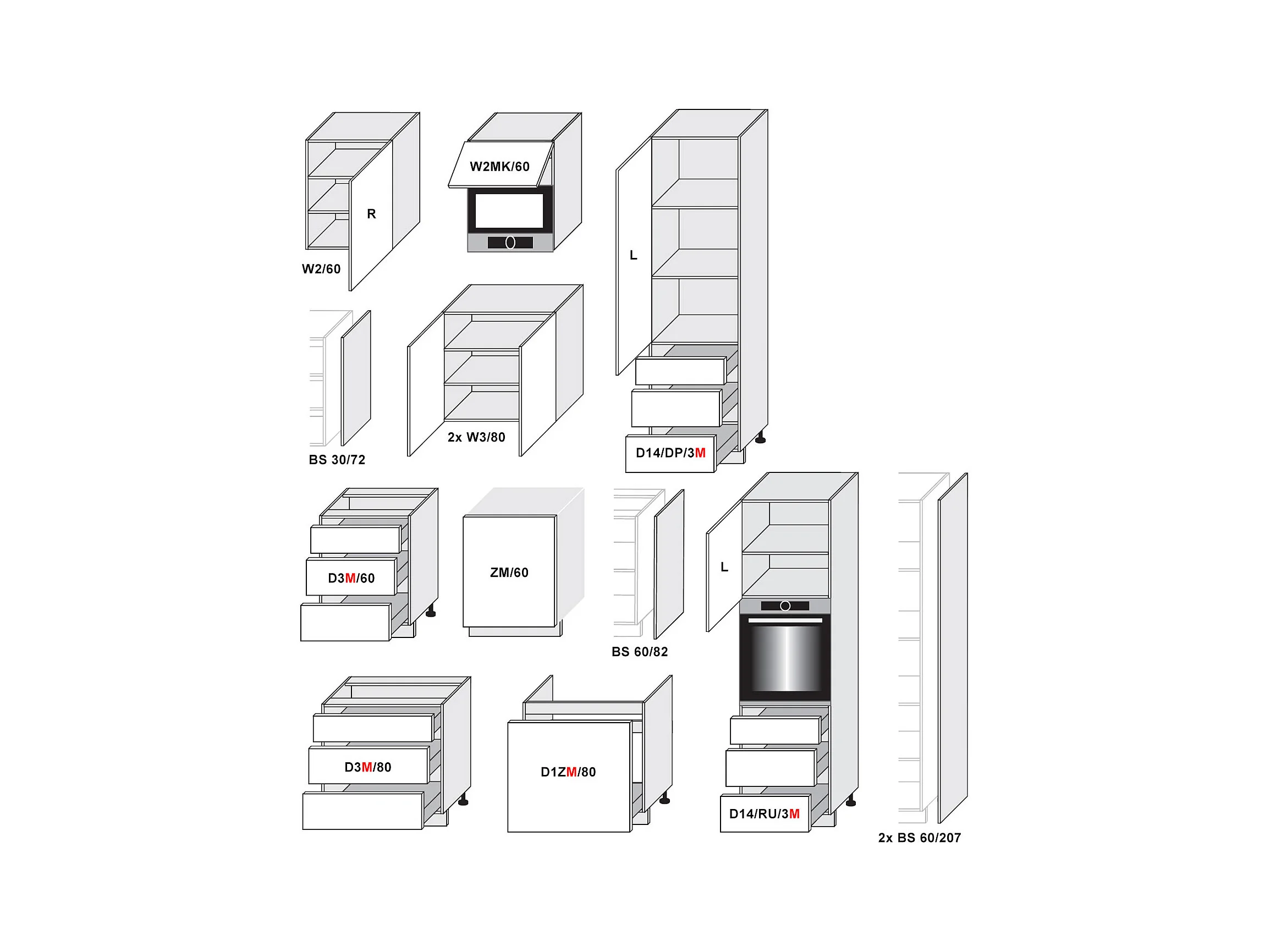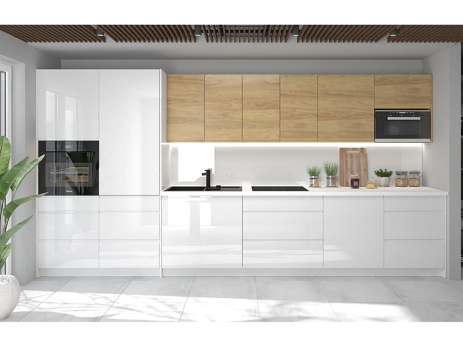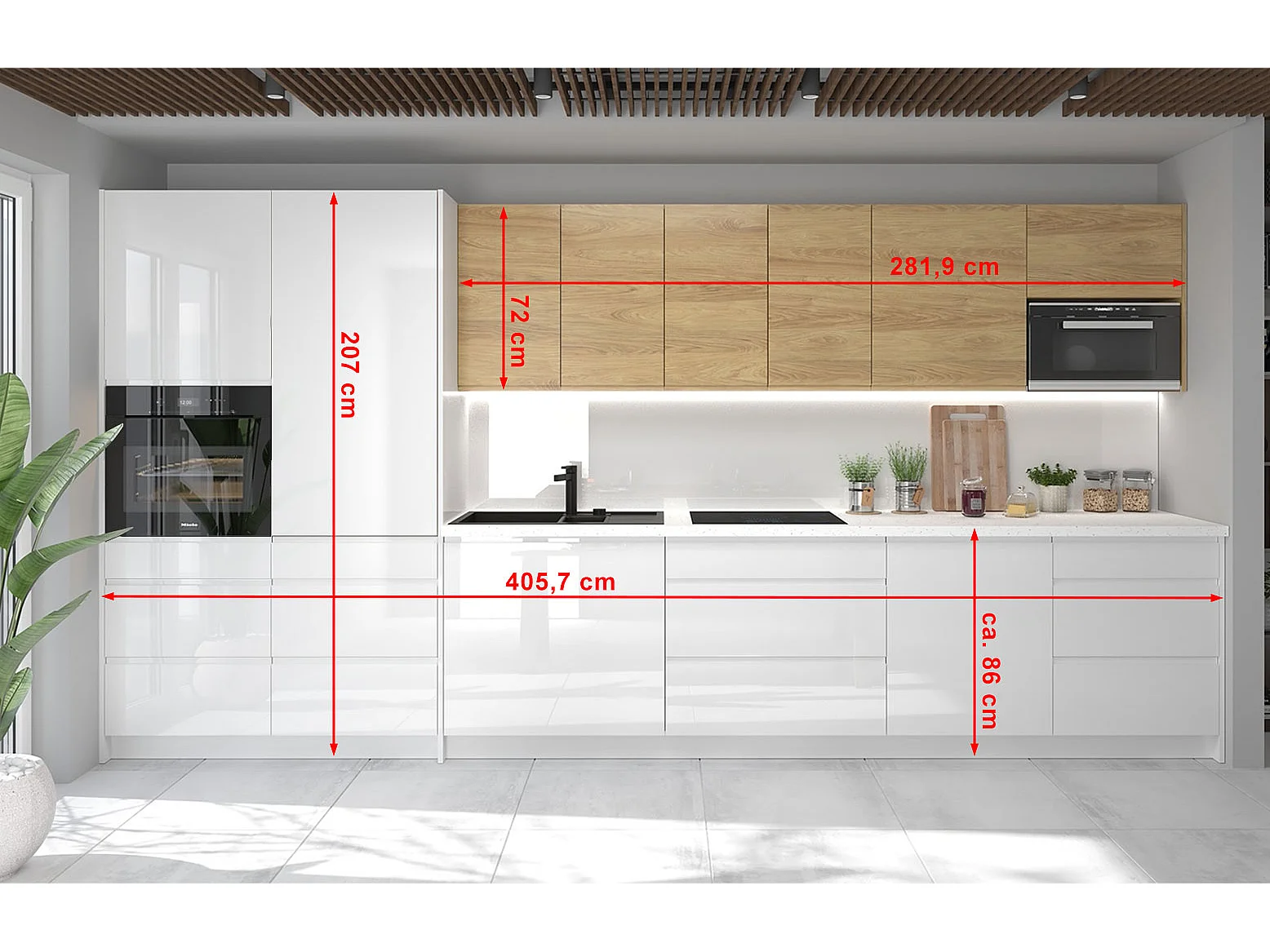 KÜCHENZEILE Avellino (10-tlg) Weiß Acryl Hochglanz / Hickory Natur Matt / Weiß Matt 406 / 59 / 207cm