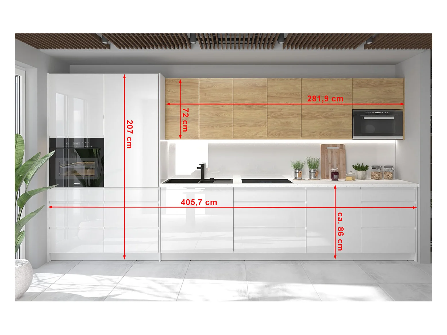 KÜCHENZEILE Avellino (10-tlg) Weiß Acryl Hochglanz / Hickory Natur Matt / Weiß Matt 406 / 59 / 207cm
