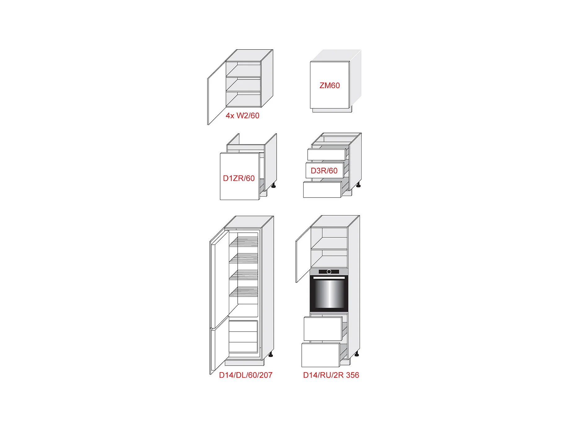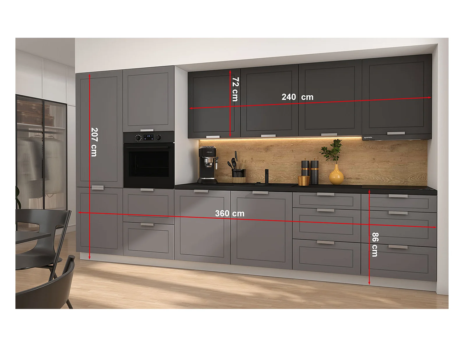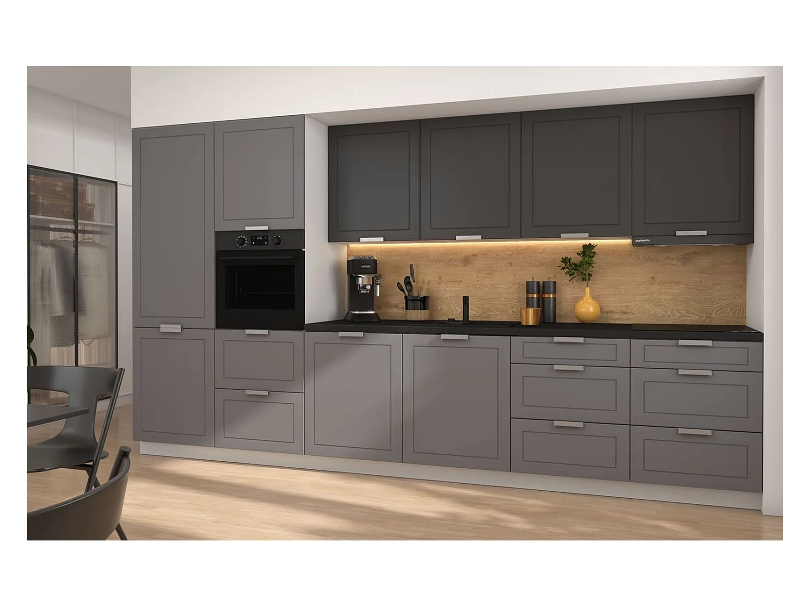 KÜCHENLEERBLOCK Kvantum weiß / dust grey & graphit matt, Arbeitsplatte schwarz 360 / 60 / 207cm 10-teilig