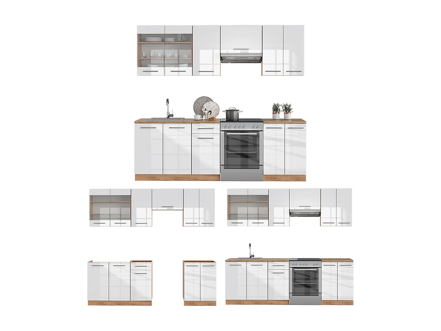 Küchenzeile weiß hochglanz/goldkraft eiche 240x60x81.6 fame-line